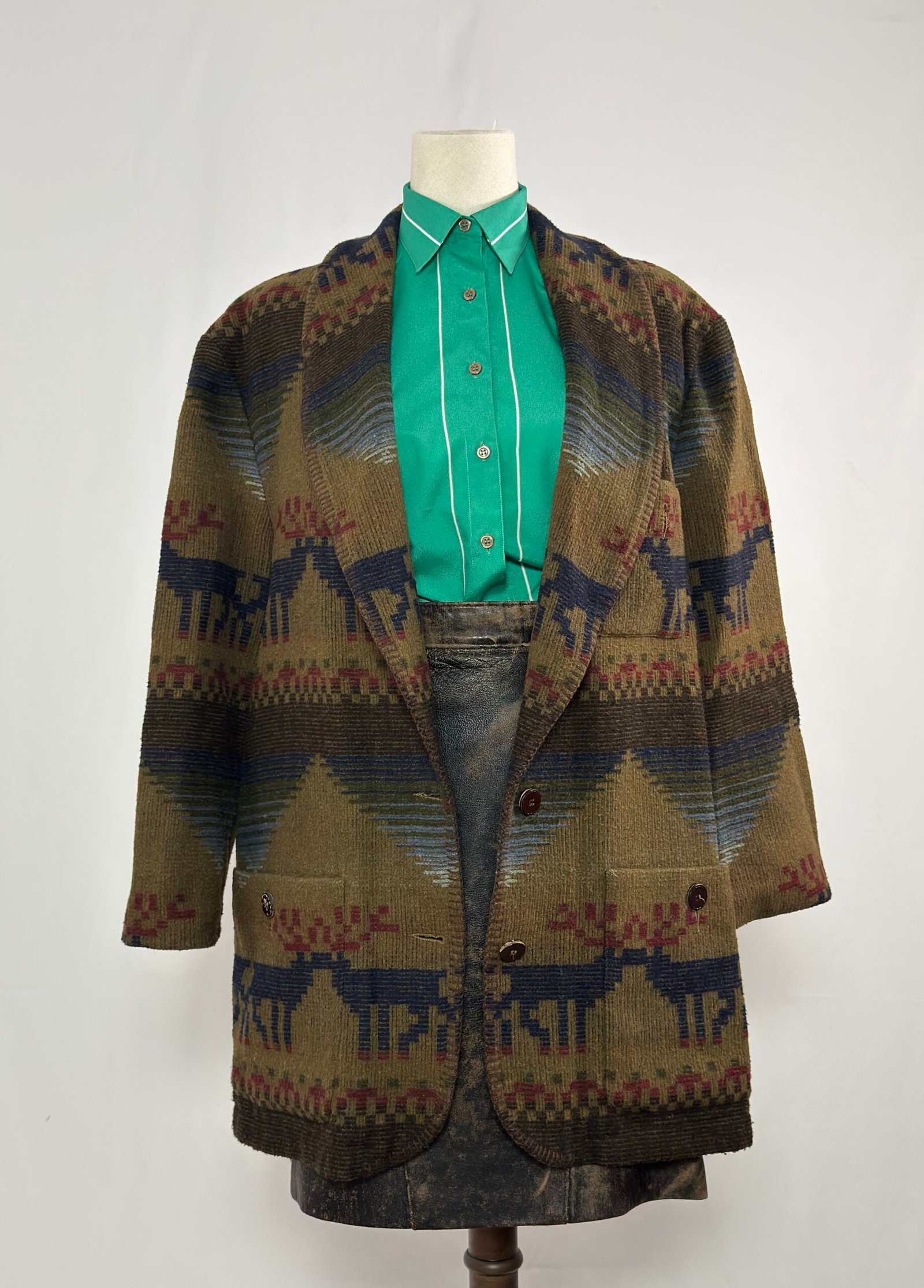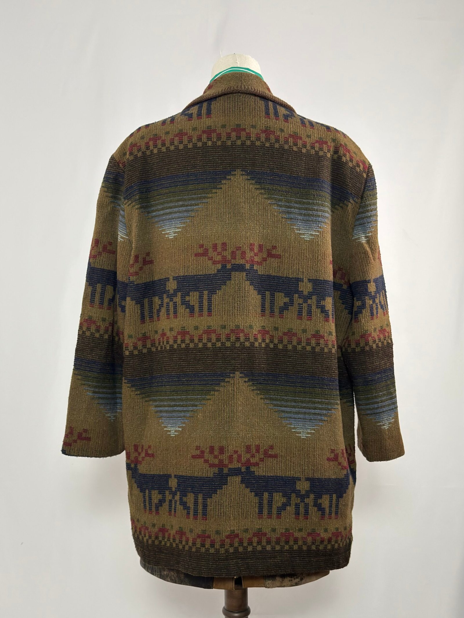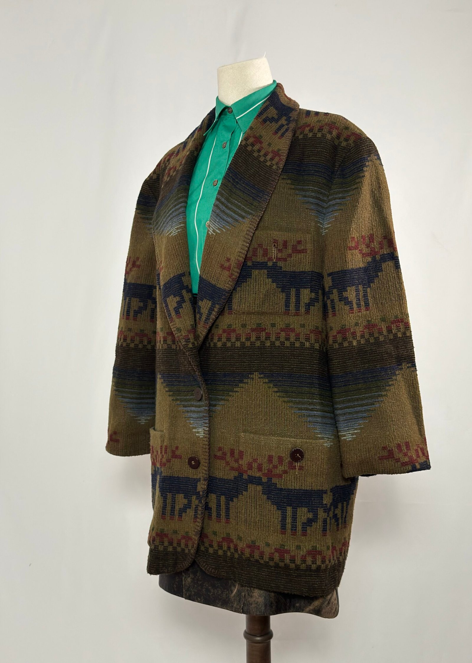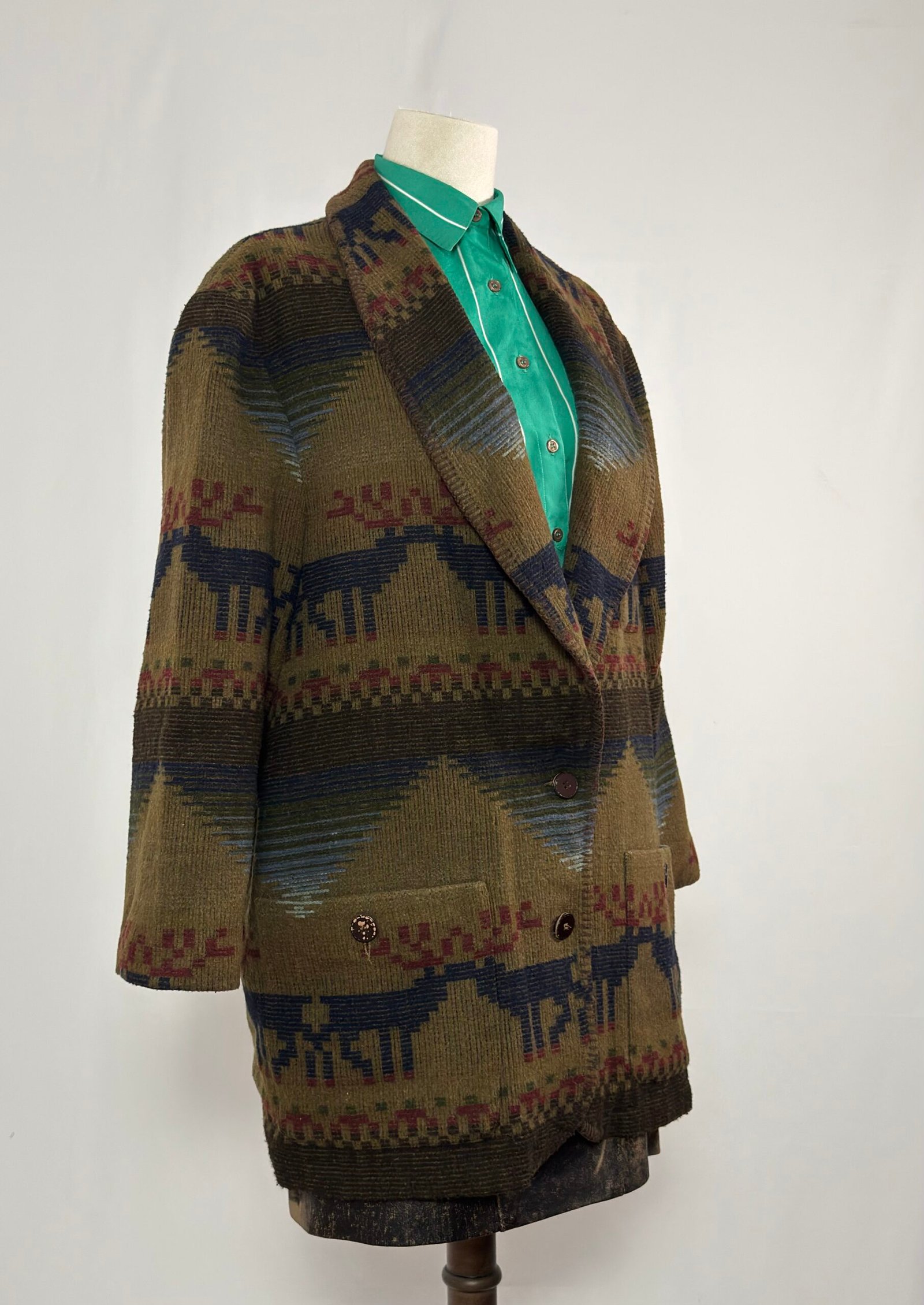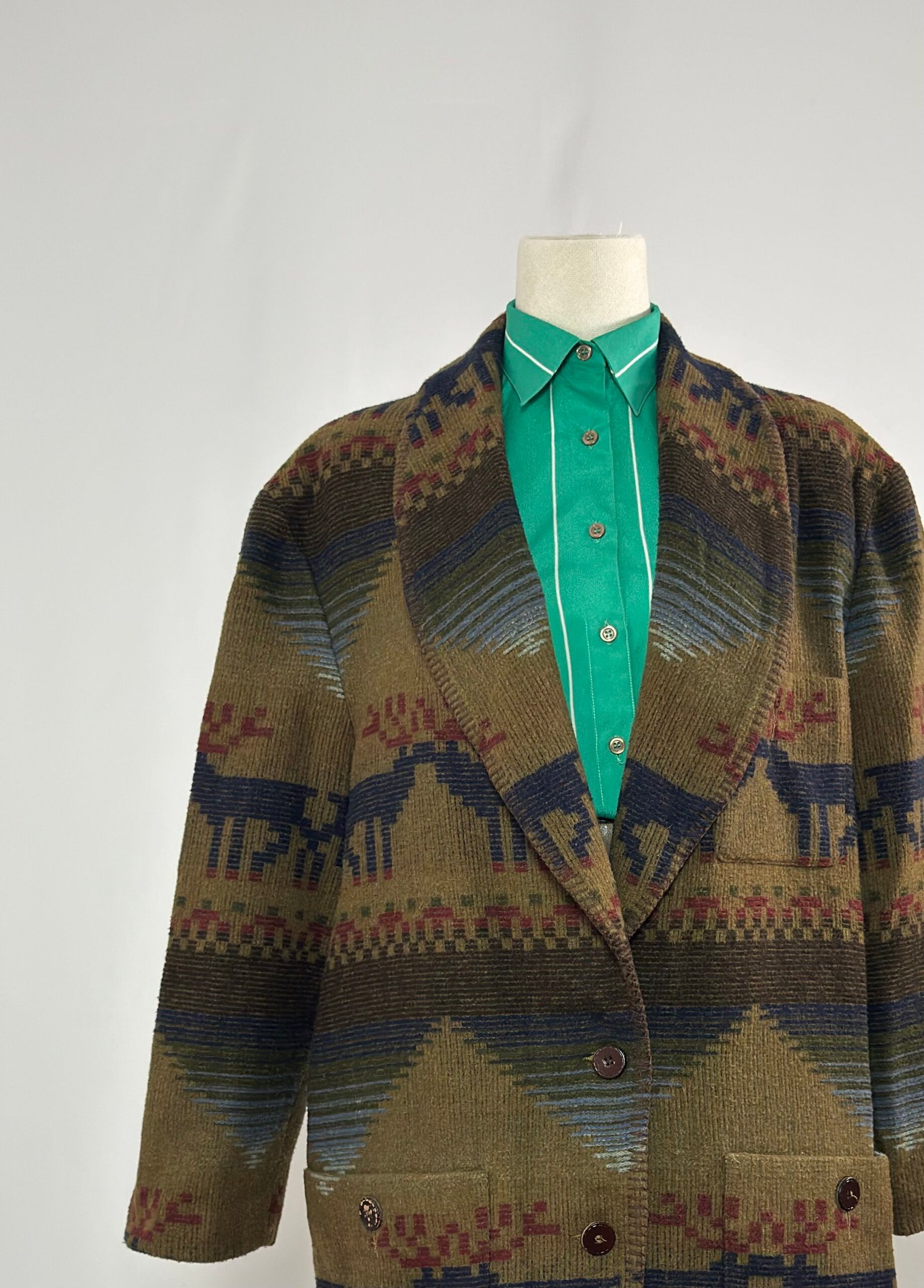 Chaqueta tipo blazer verde caqui con estampado navajo en tonos azul y burdeos. Botones marrones originales y dos bolsillos delanteros.