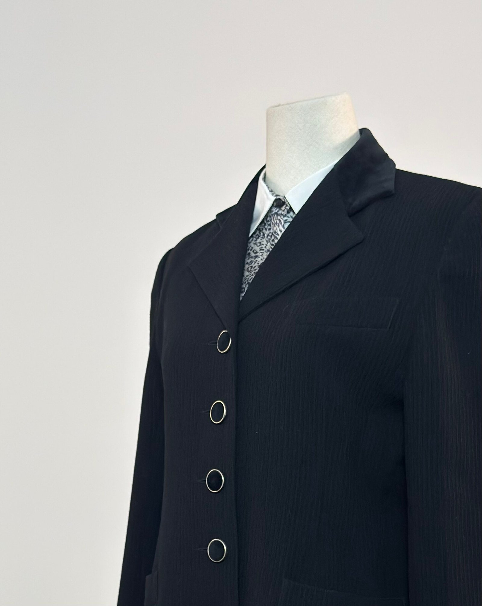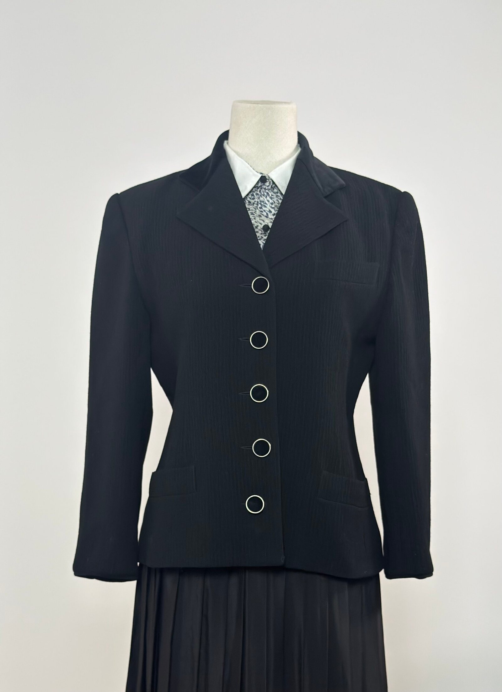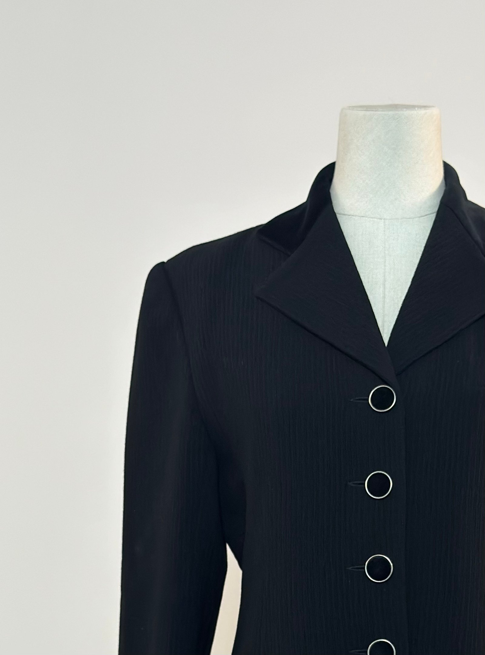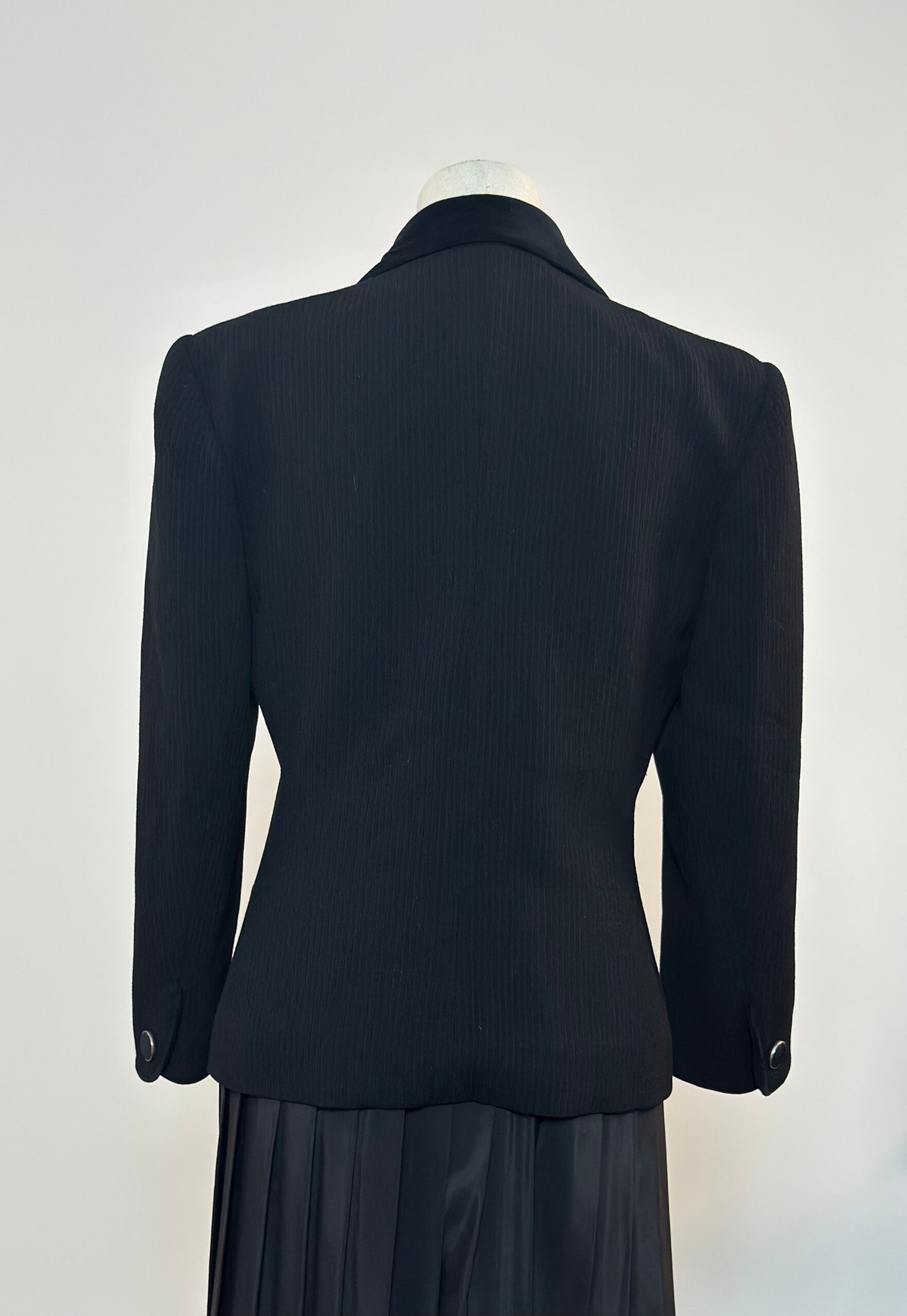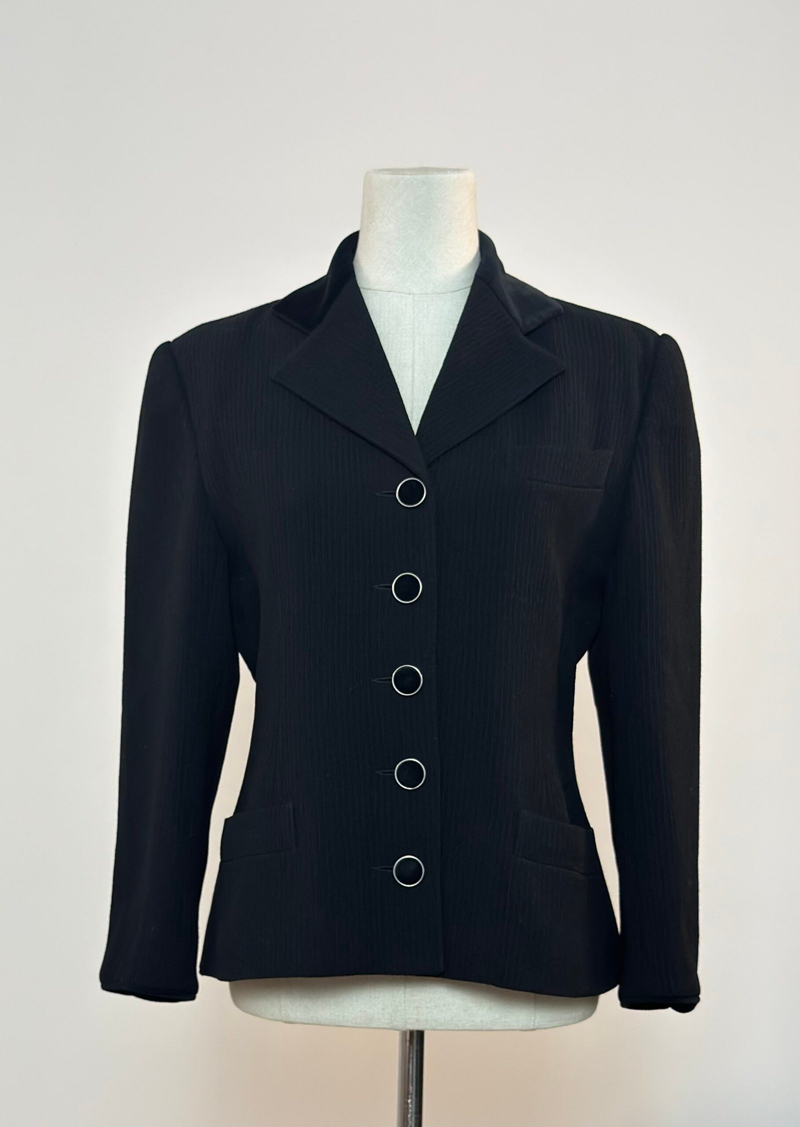 Blazer negro con cuello de terciopelo negro y botones forrados con la misma tela de terciopelo, enmarcados en dorado. La tela principal es acanalada. Prenda totalmente forrada, entallada y muy favorecedora.