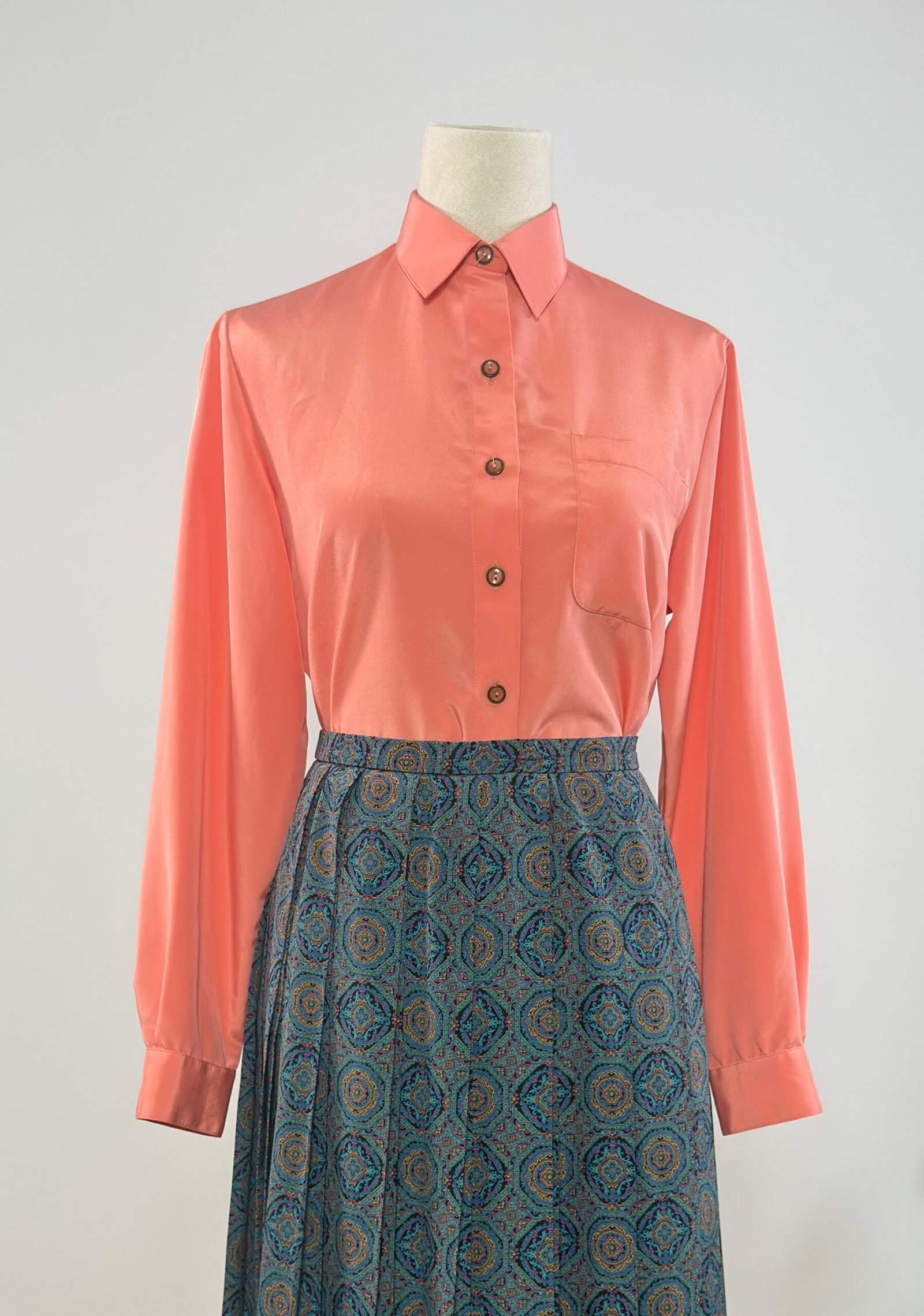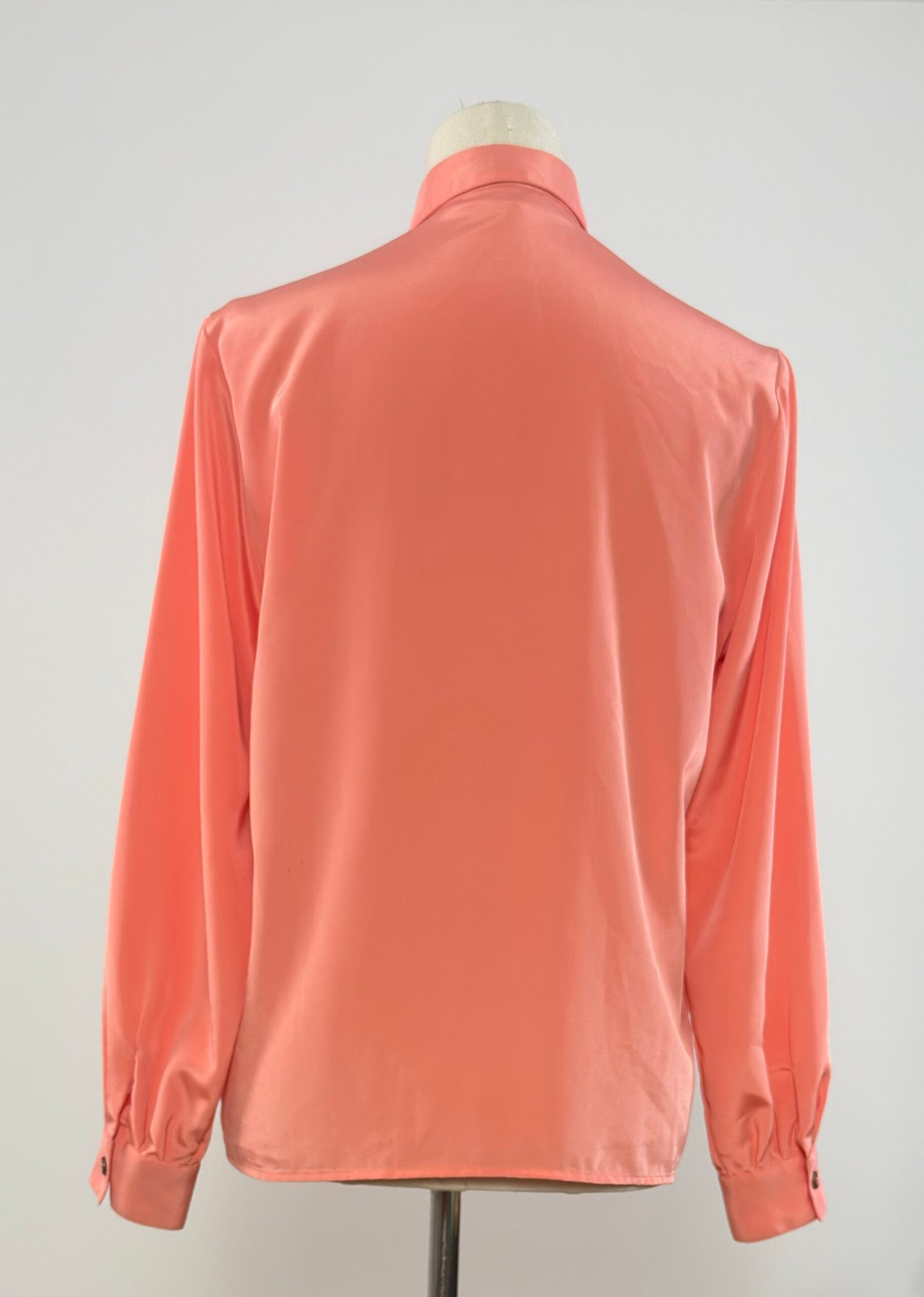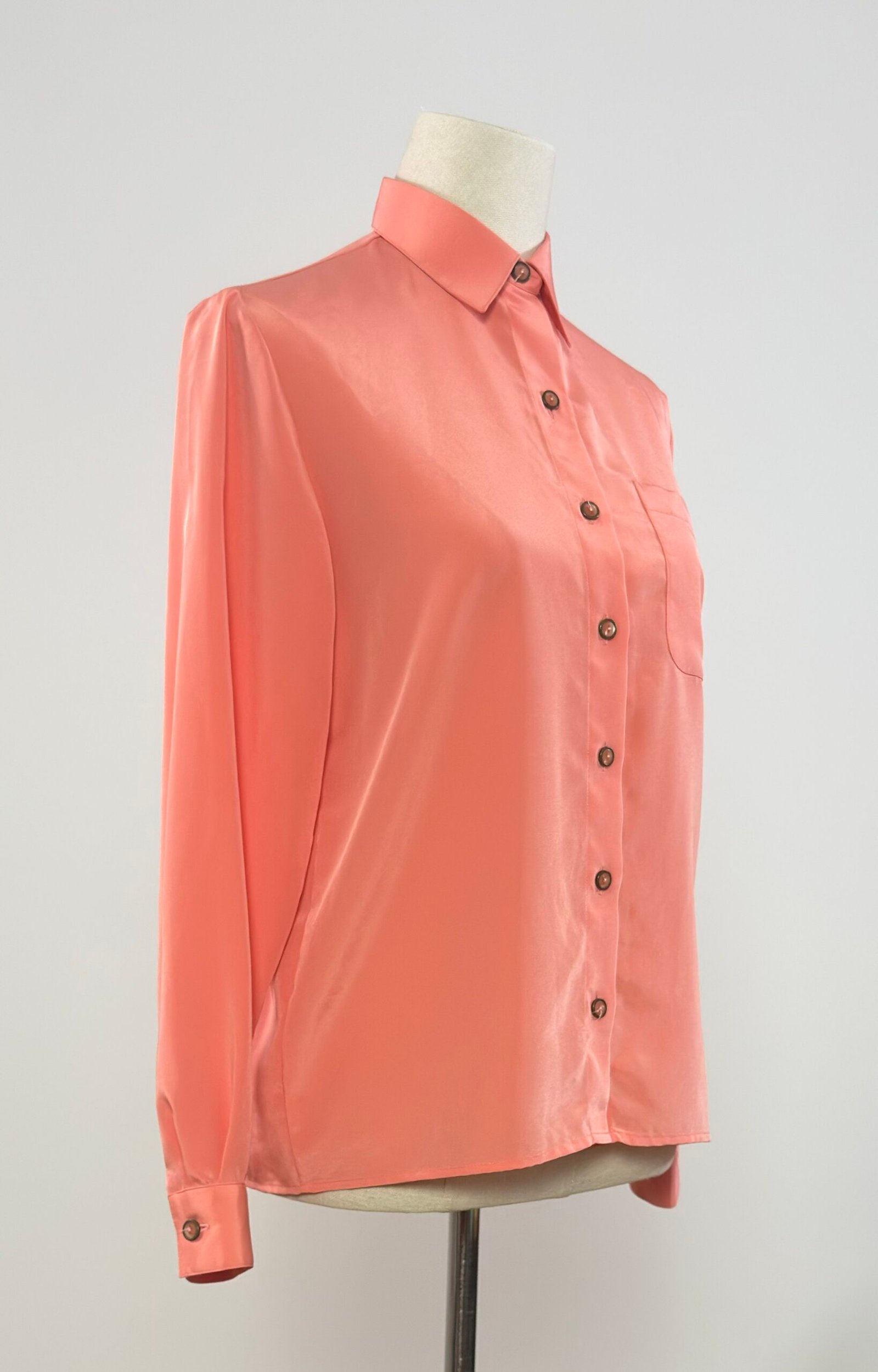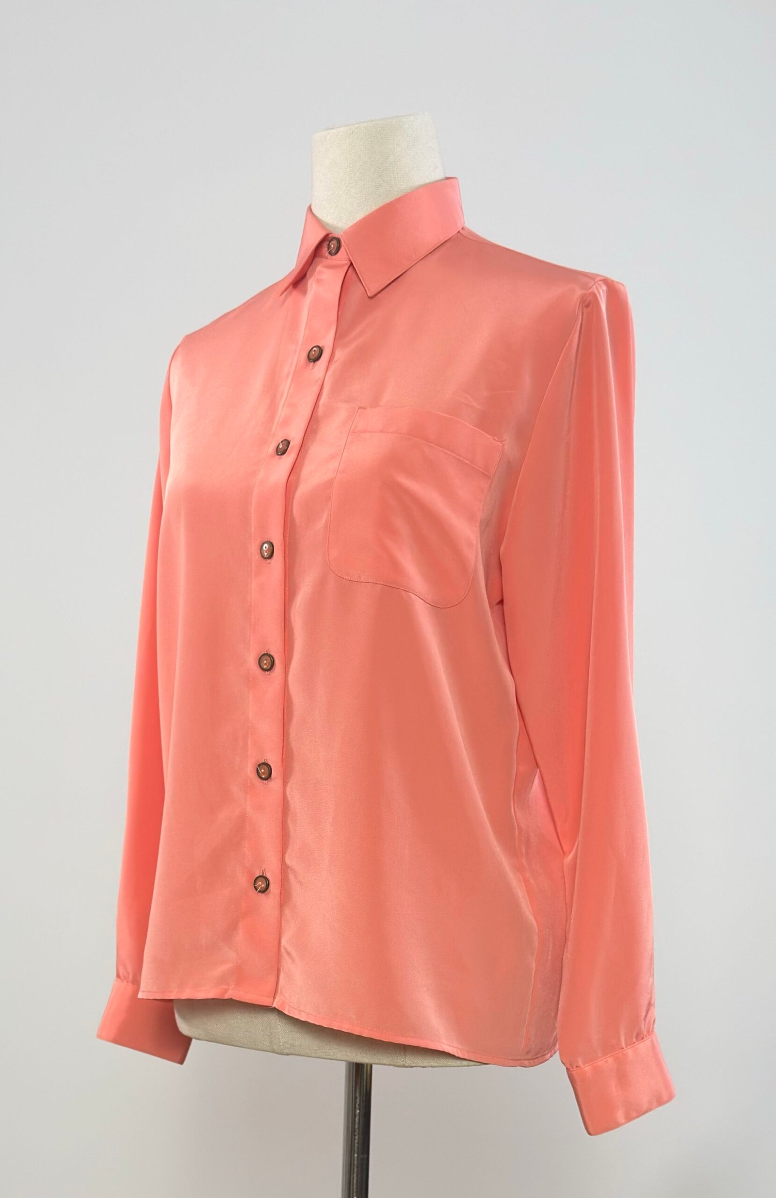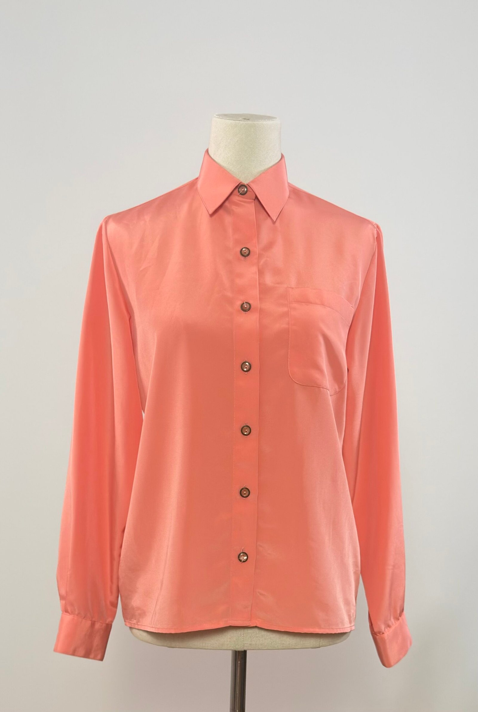 Blusa de manga larga, cuello camisero, rosa salmón, con un bolsillo en el delantero y abotonada con botones originales. Prenda sin entalle, sencilla y atemporal, un básico en tu armario.