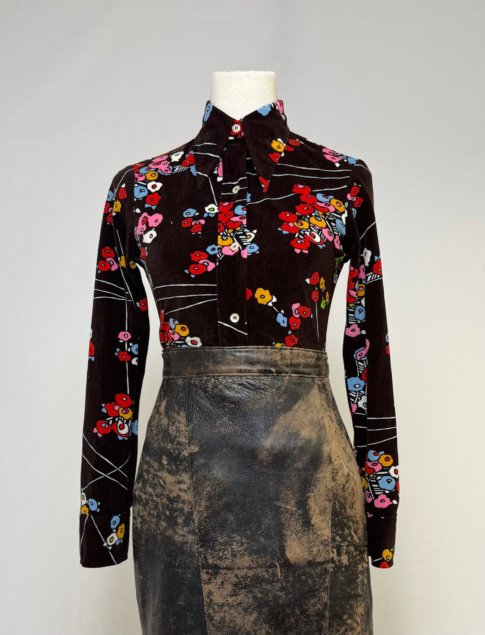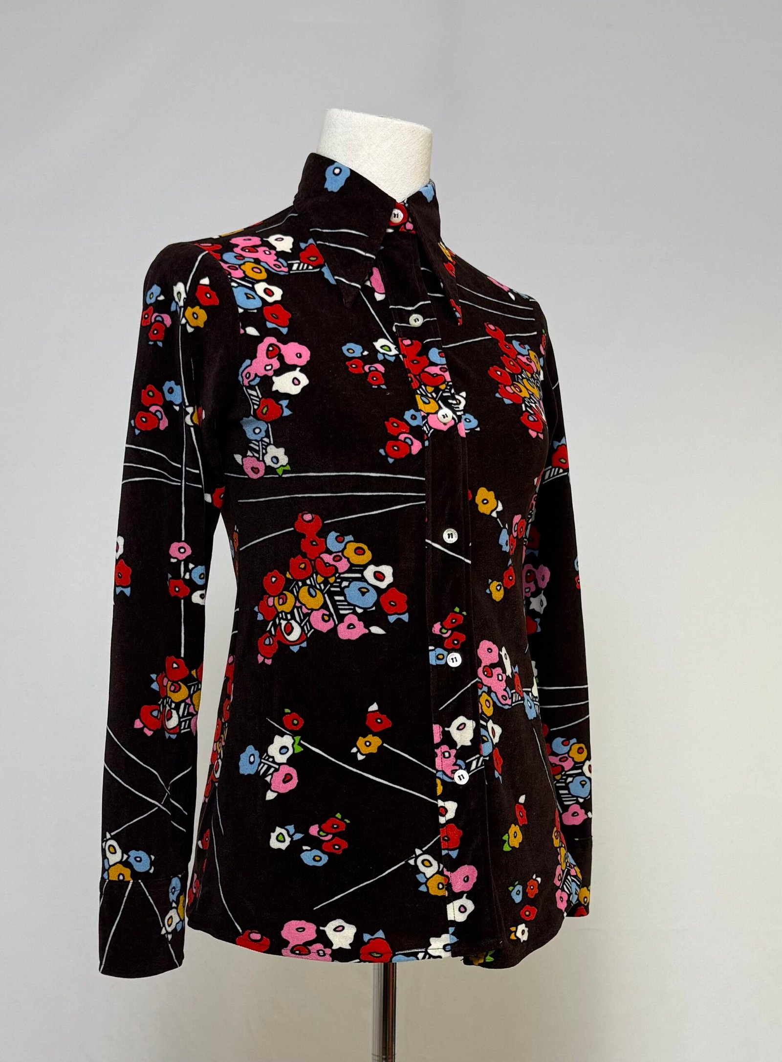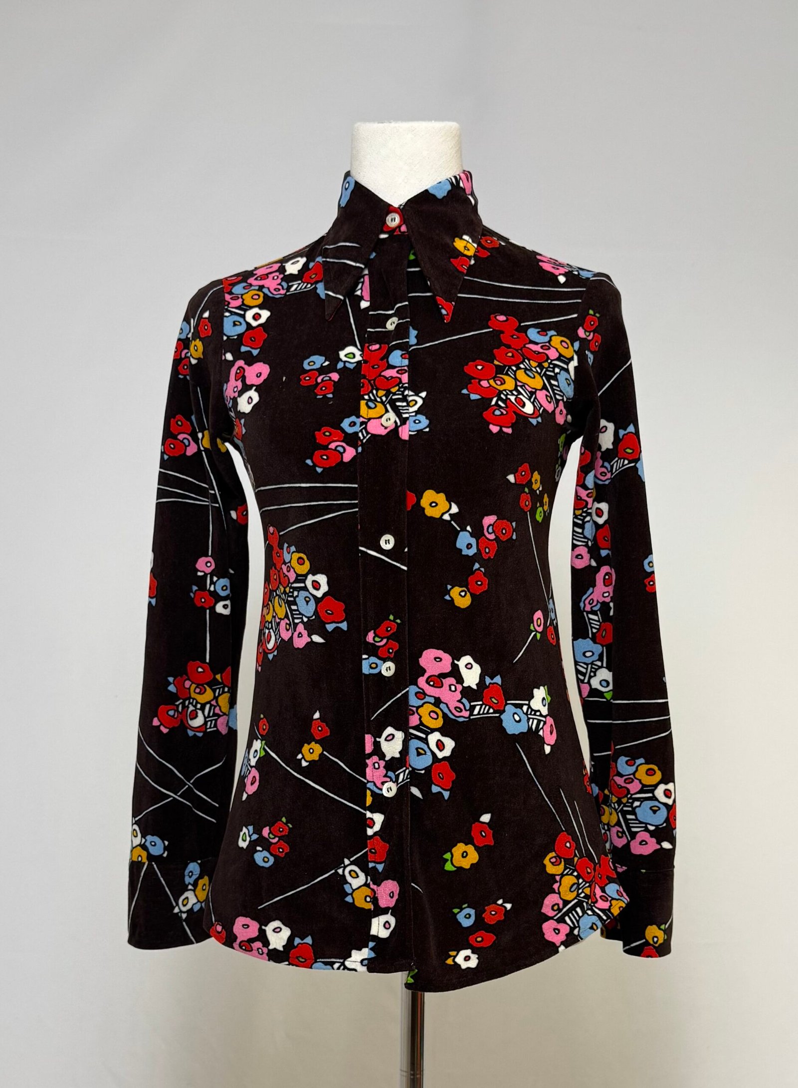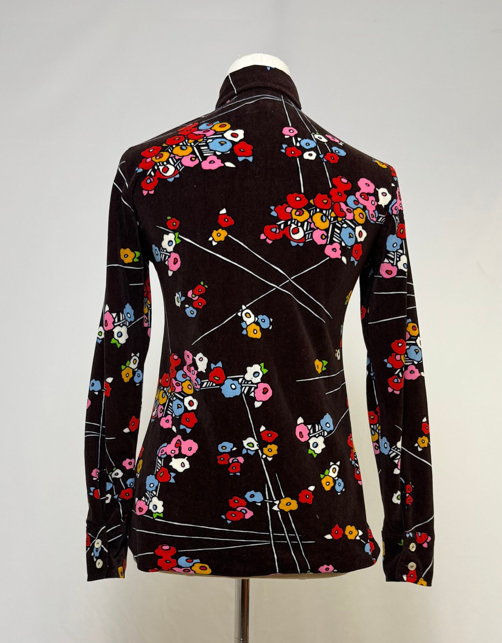 Blusa de manga larga con cuello pronunciado, piel de melocotón marrón con estampados tipo japonés en colores varios. Pieza entallada.