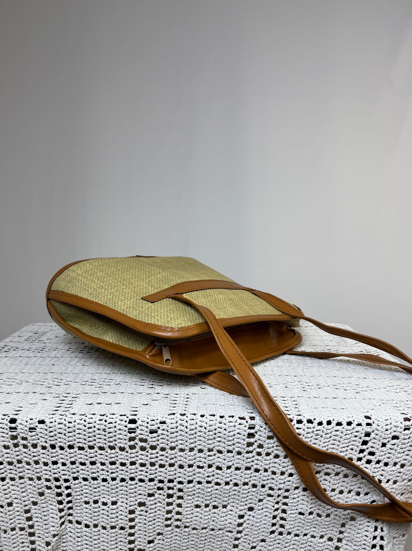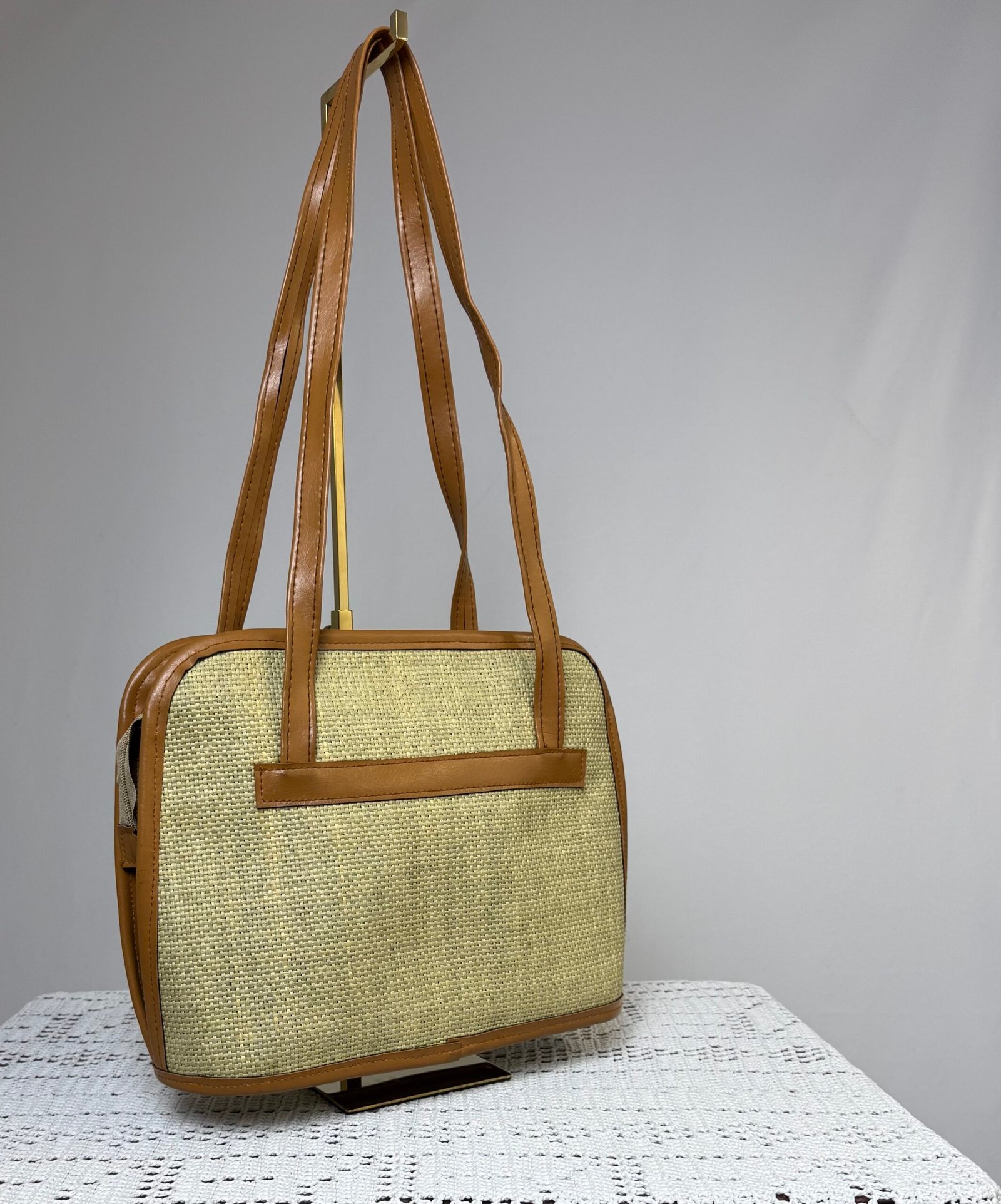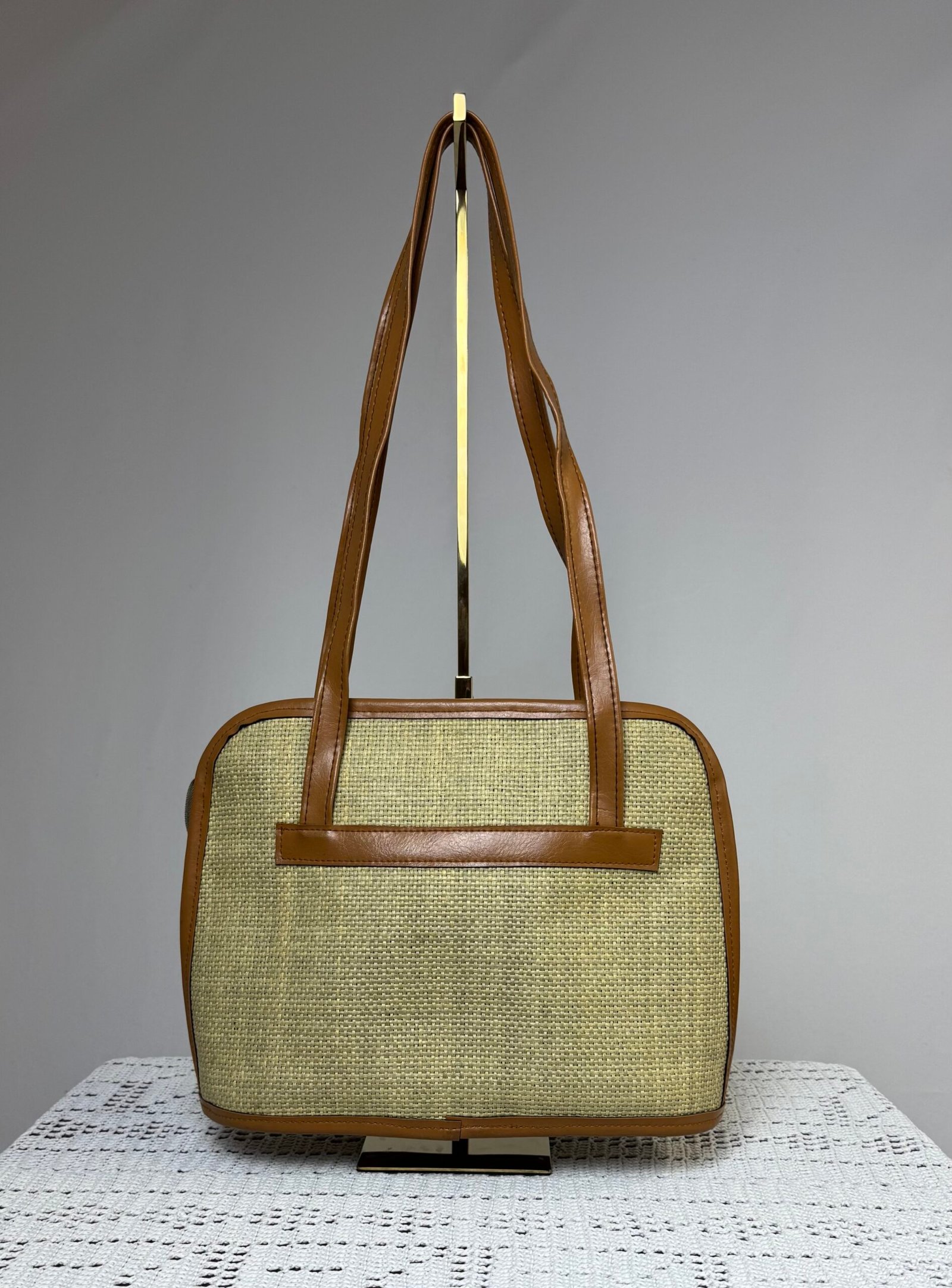 Bolso de arpillera, con asa y ribetes en polipiel marrón. Totalmente forrado, con bolsillo interior.