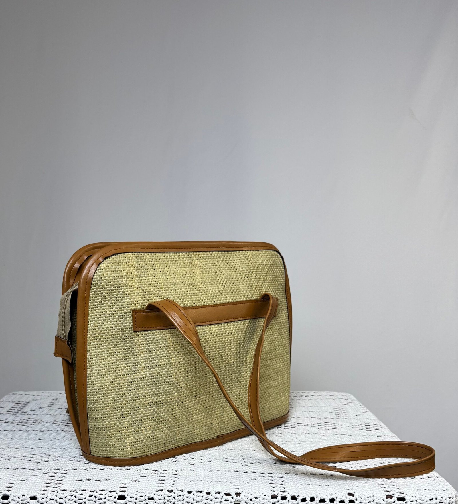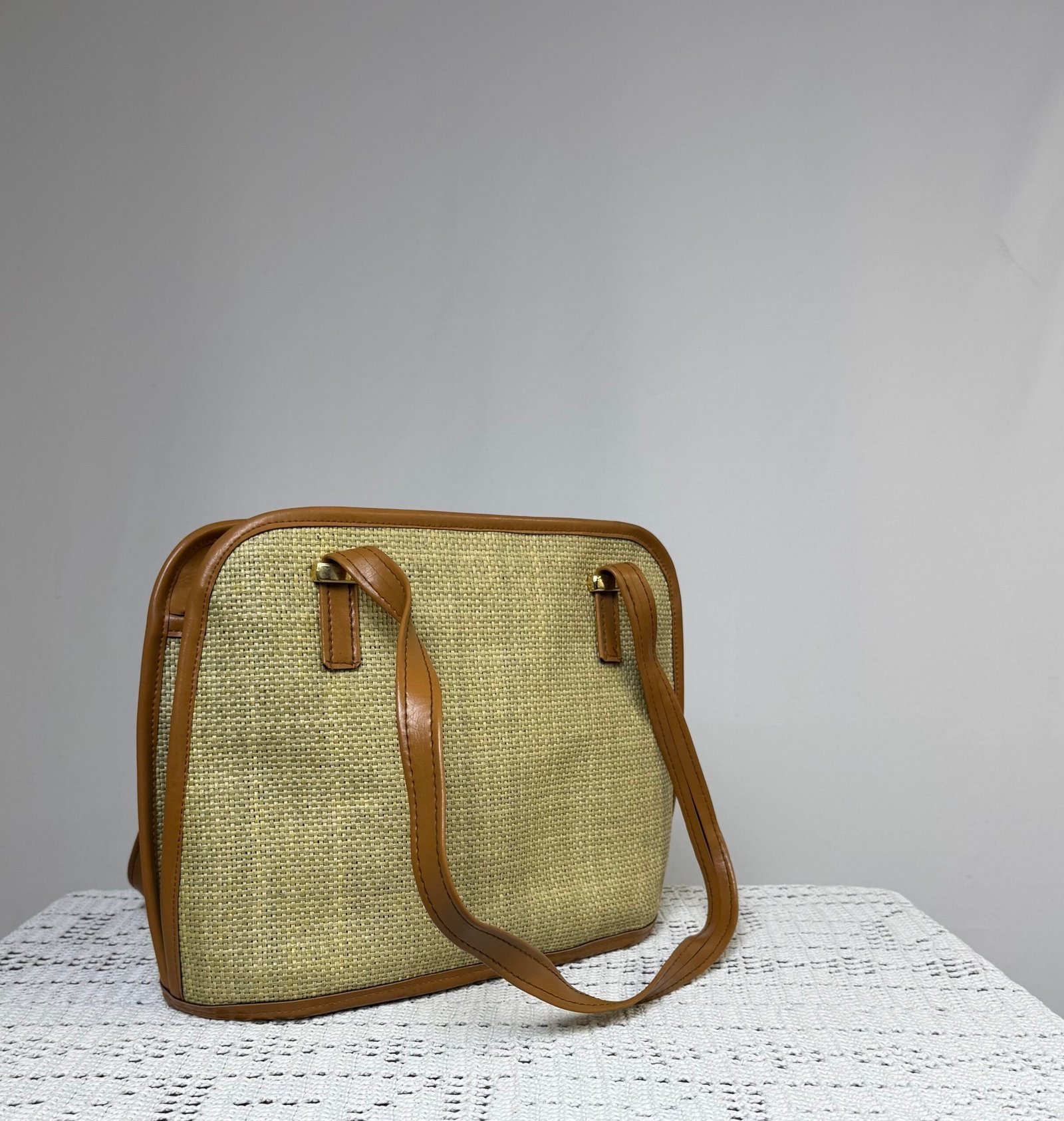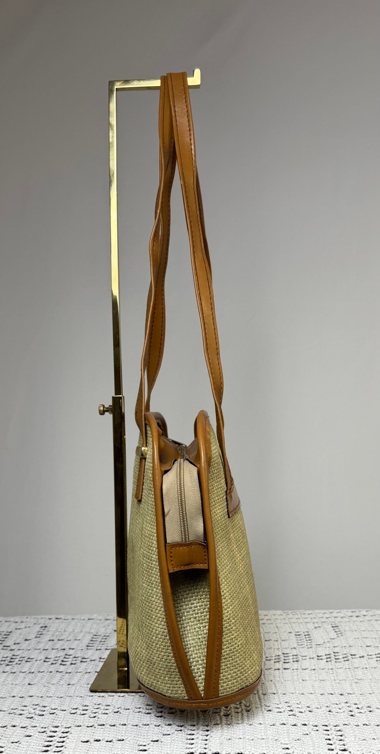 Bolso de arpillera, con asa y ribetes en polipiel marrón. Totalmente forrado, con bolsillo interior.