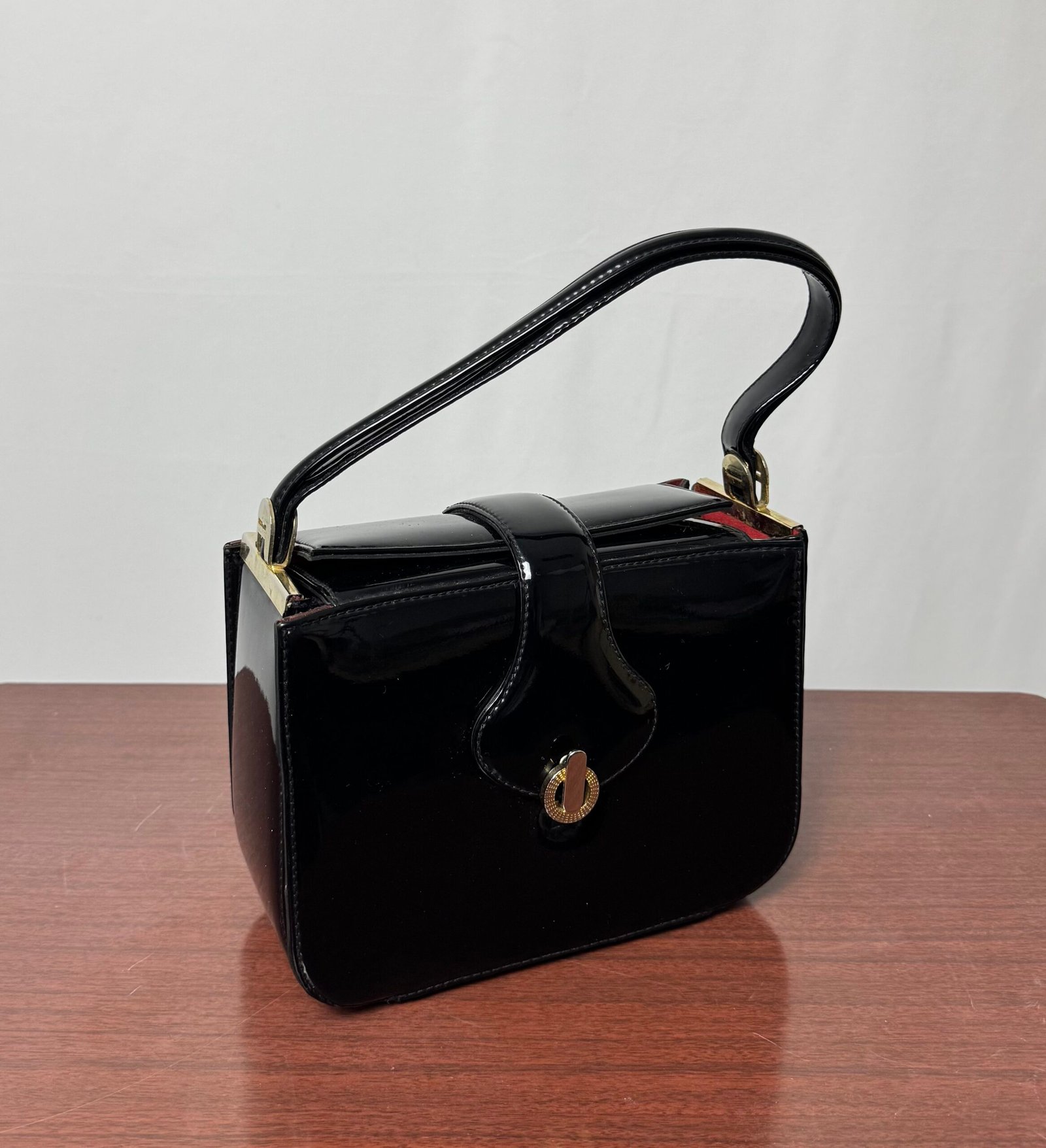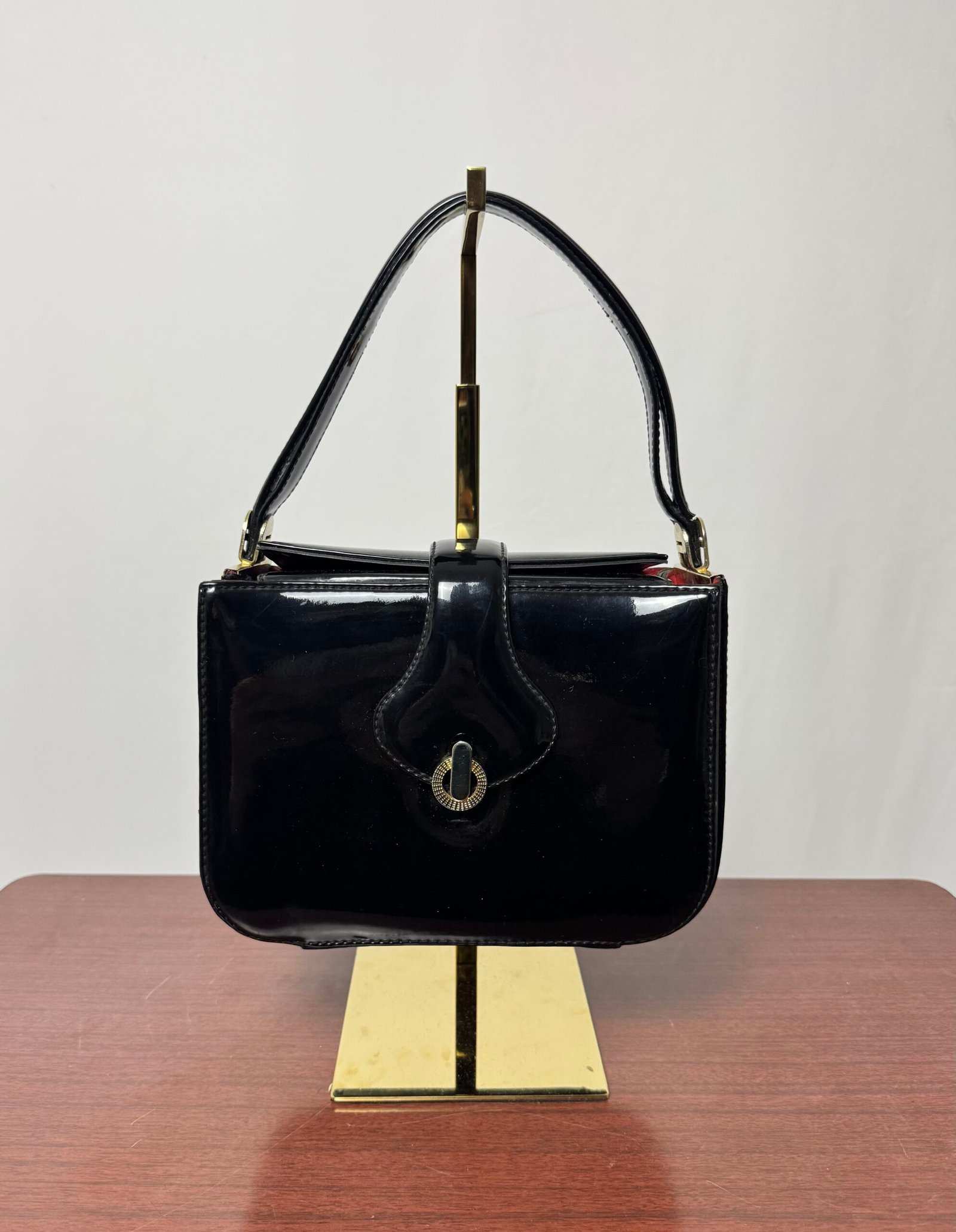 Bolso de charol con cierre dorado, asa corta y forro rojo con un pequeño bolsillo con cremallera.