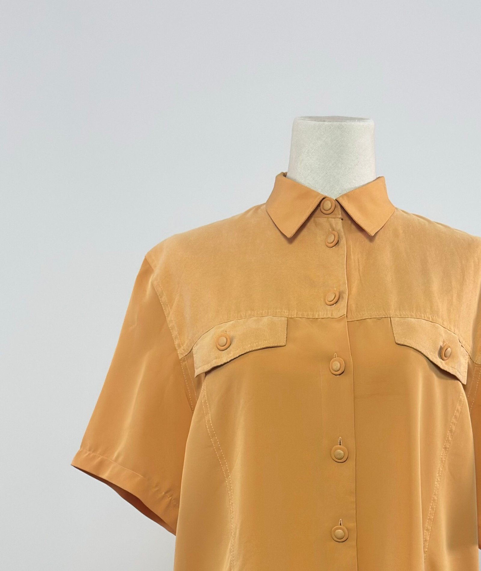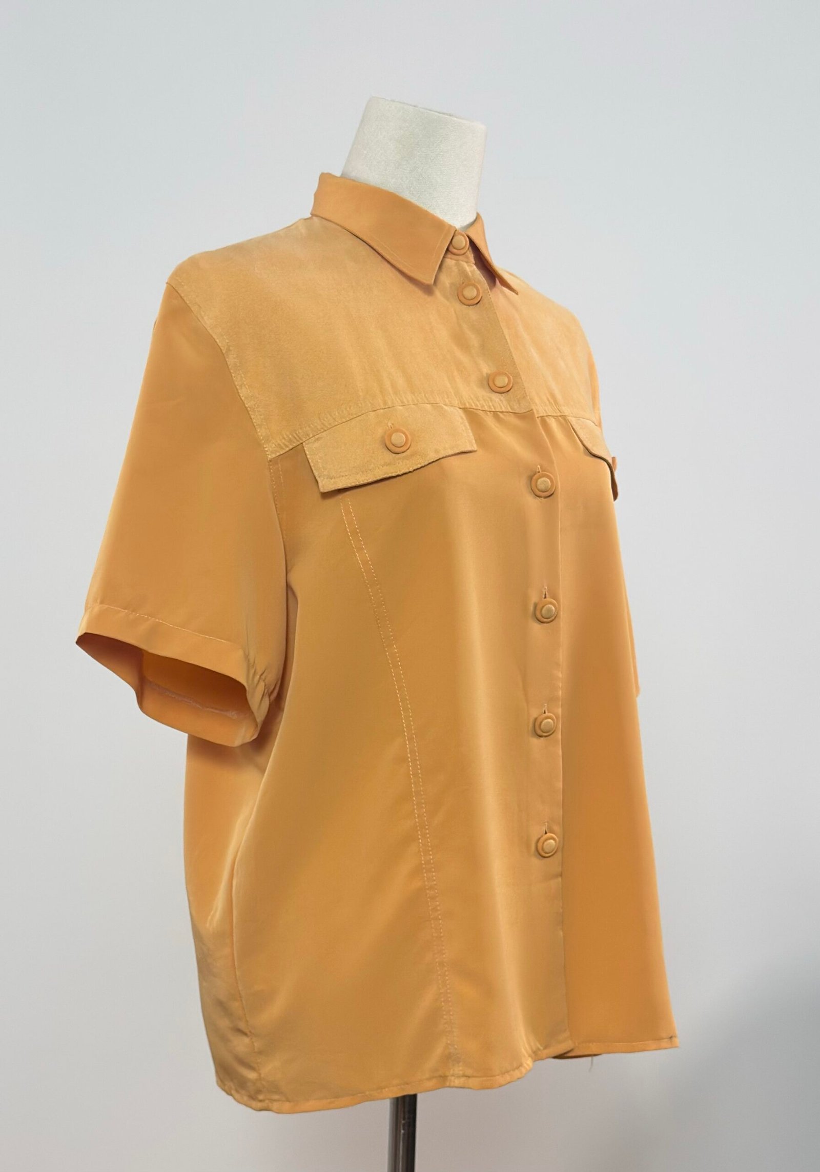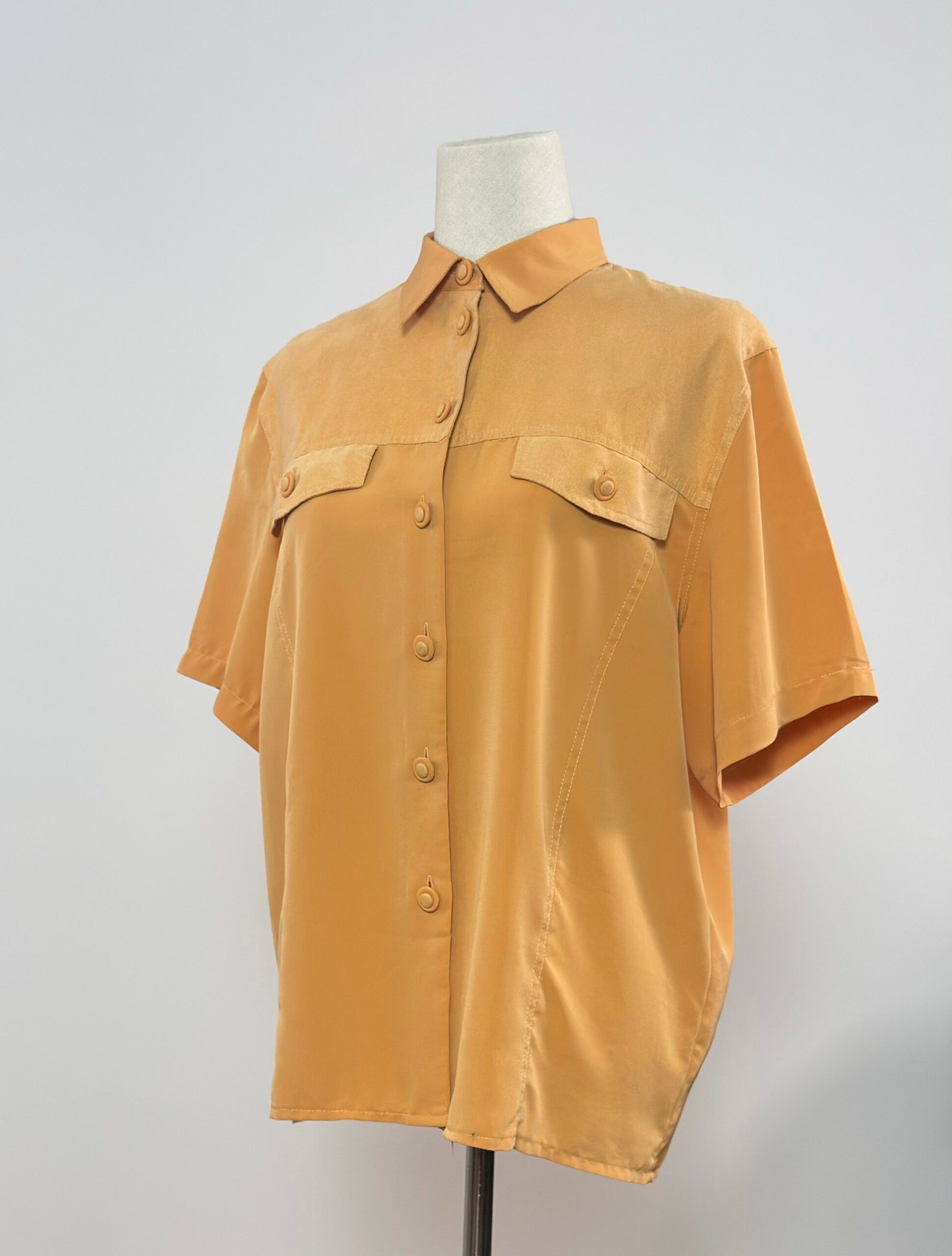 Camisa de manga corta con cuello camisero, amarillo mostaza con doble tejido, crepé en delantero y mangas, y ante muy fino en canesú, bolsillos y botones. Es una prenda holgada sin entalle, de excelente calidad.