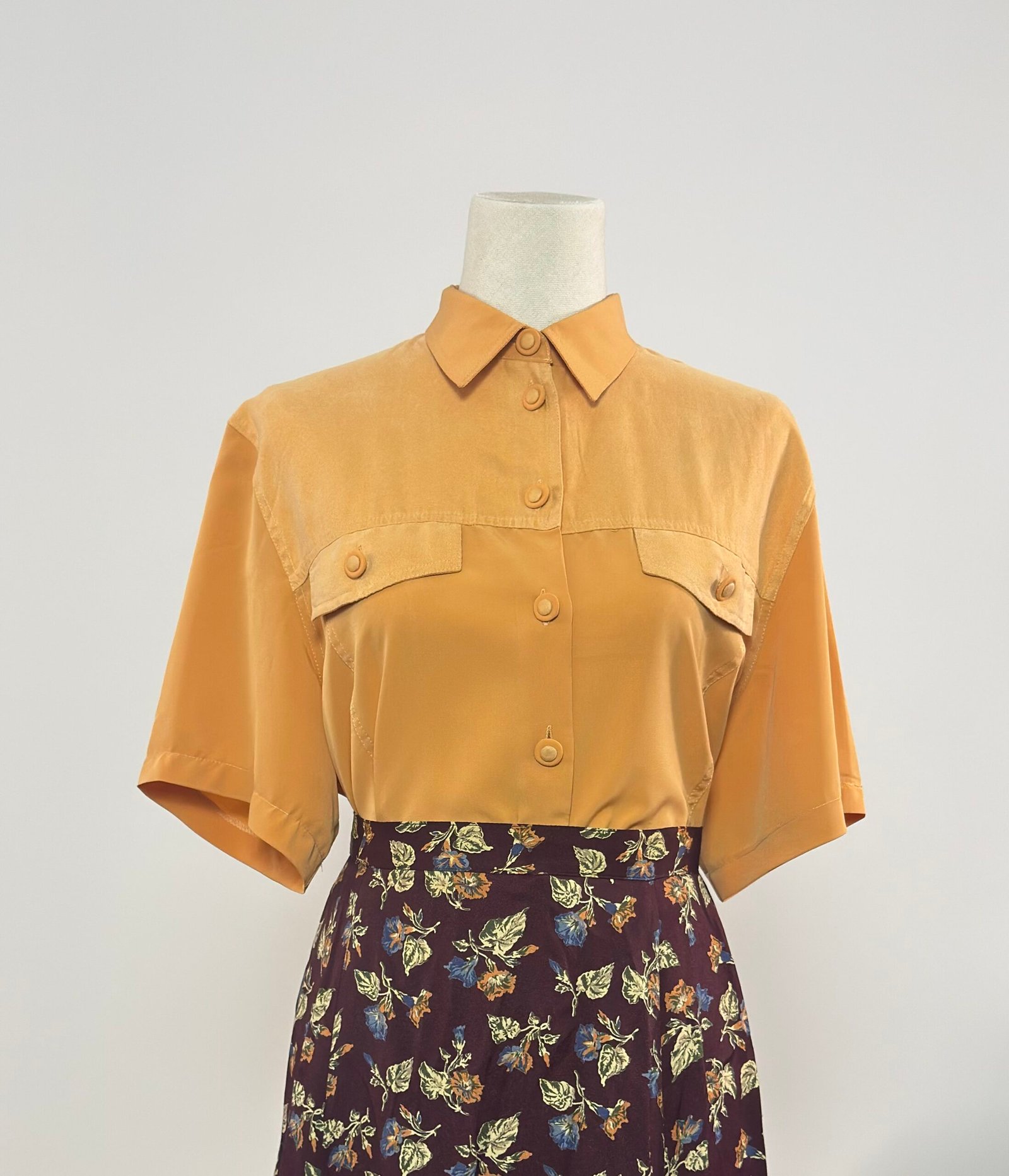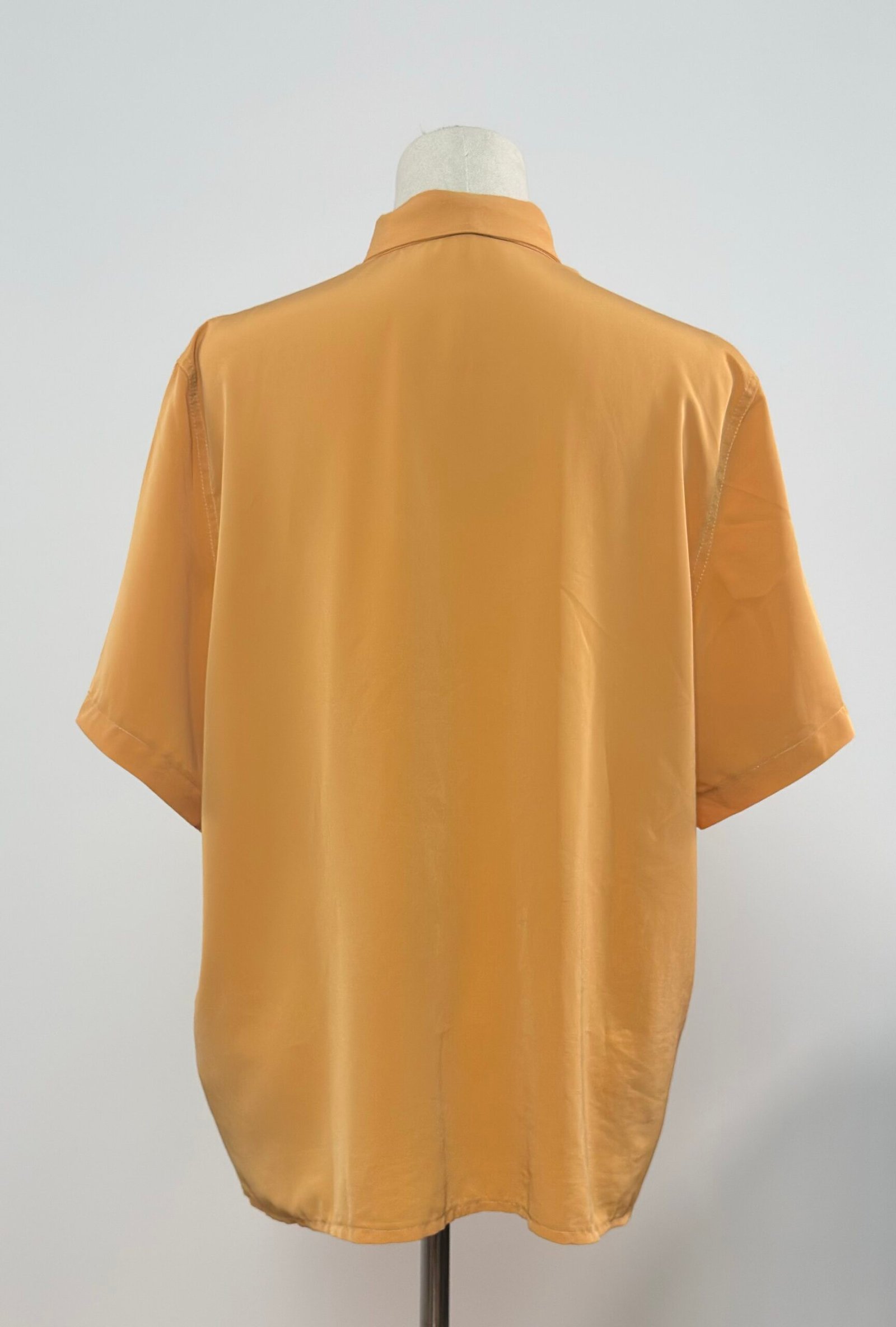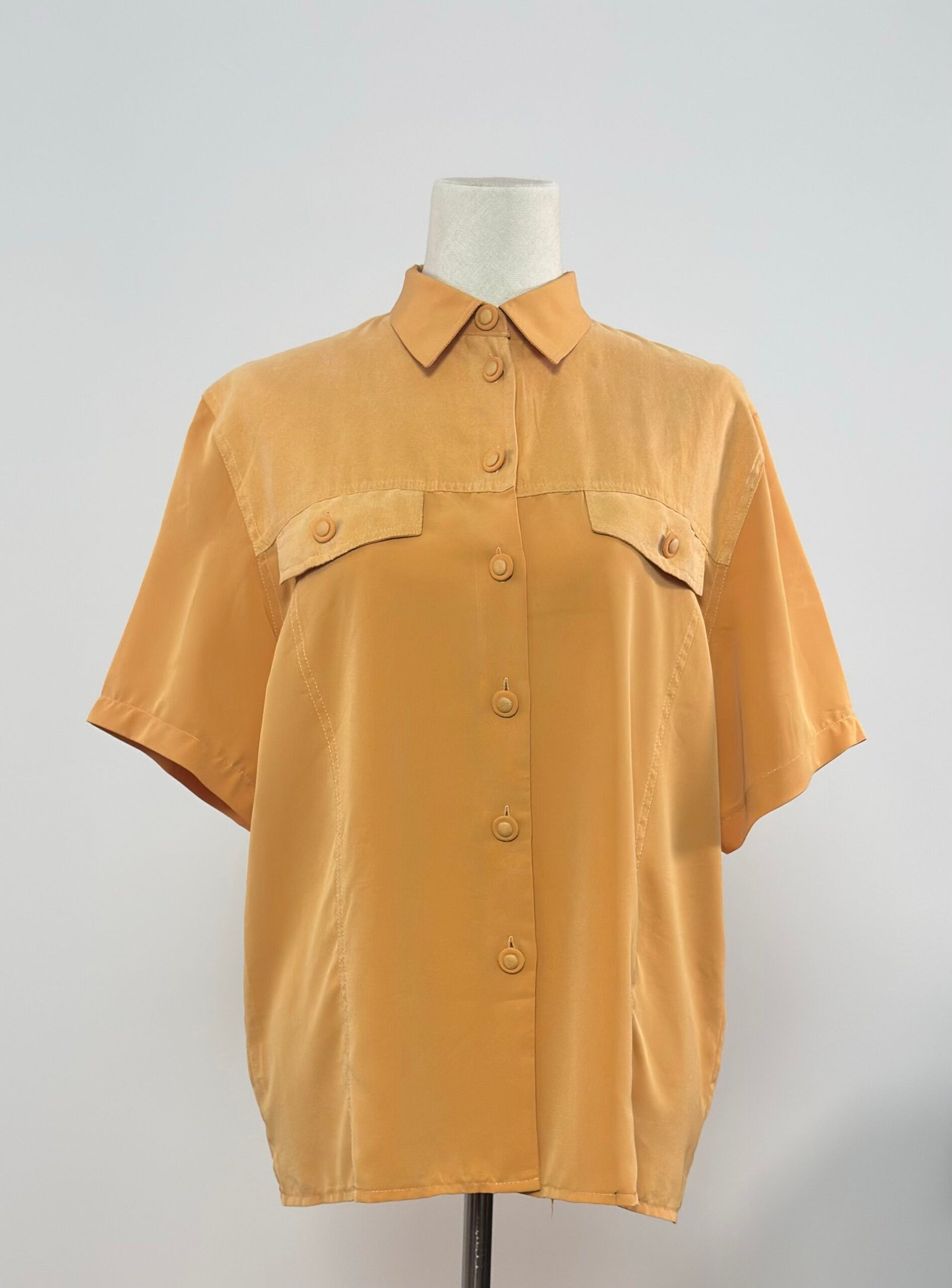 Camisa de manga corta con cuello camisero, amarillo mostaza con doble tejido, crepé en delantero y mangas, y ante muy fino en canesú, bolsillos y botones. Es una prenda holgada sin entalle, de excelente calidad.