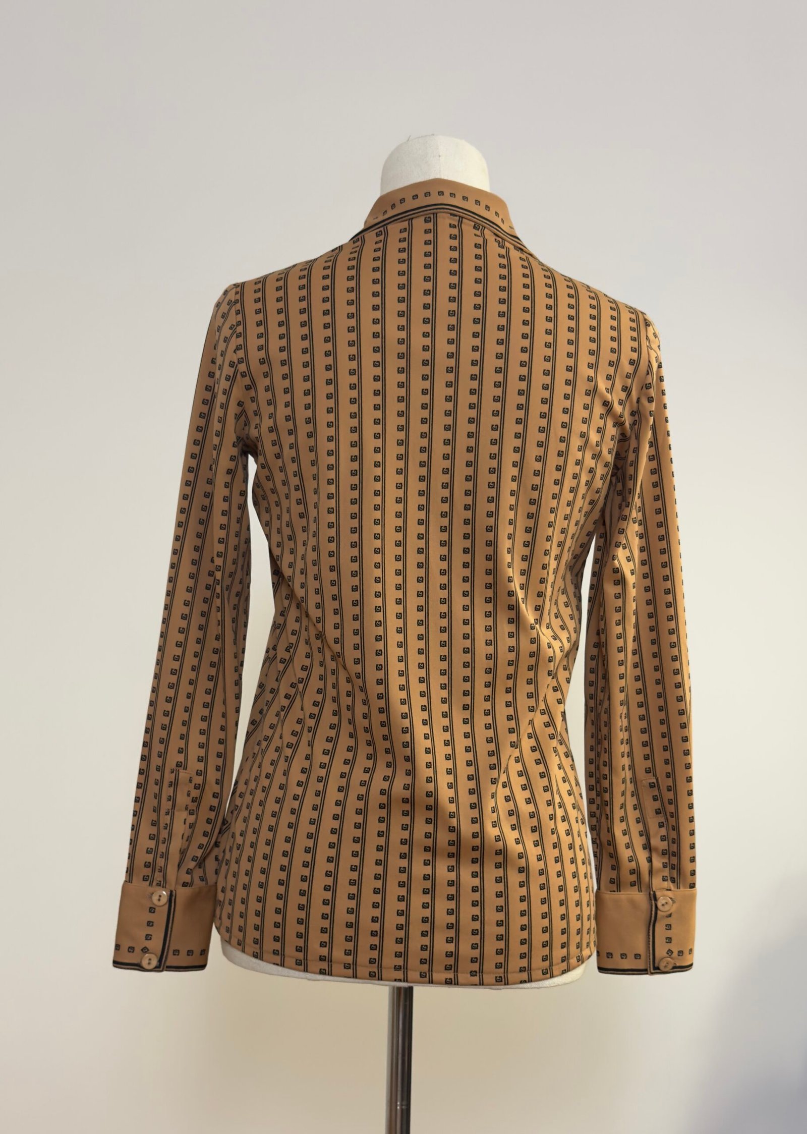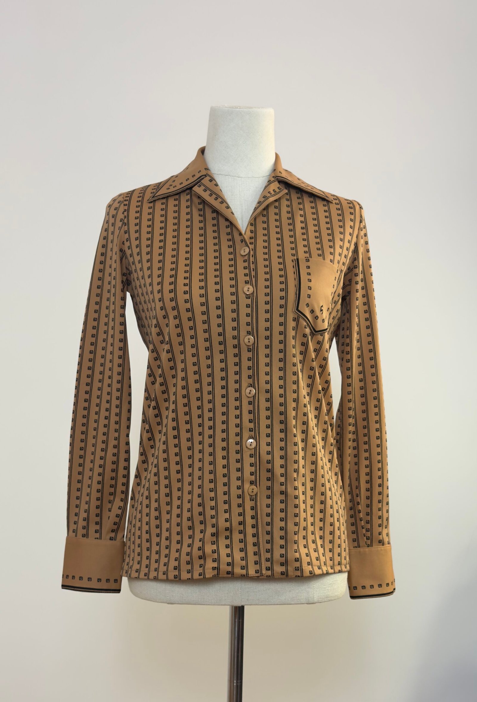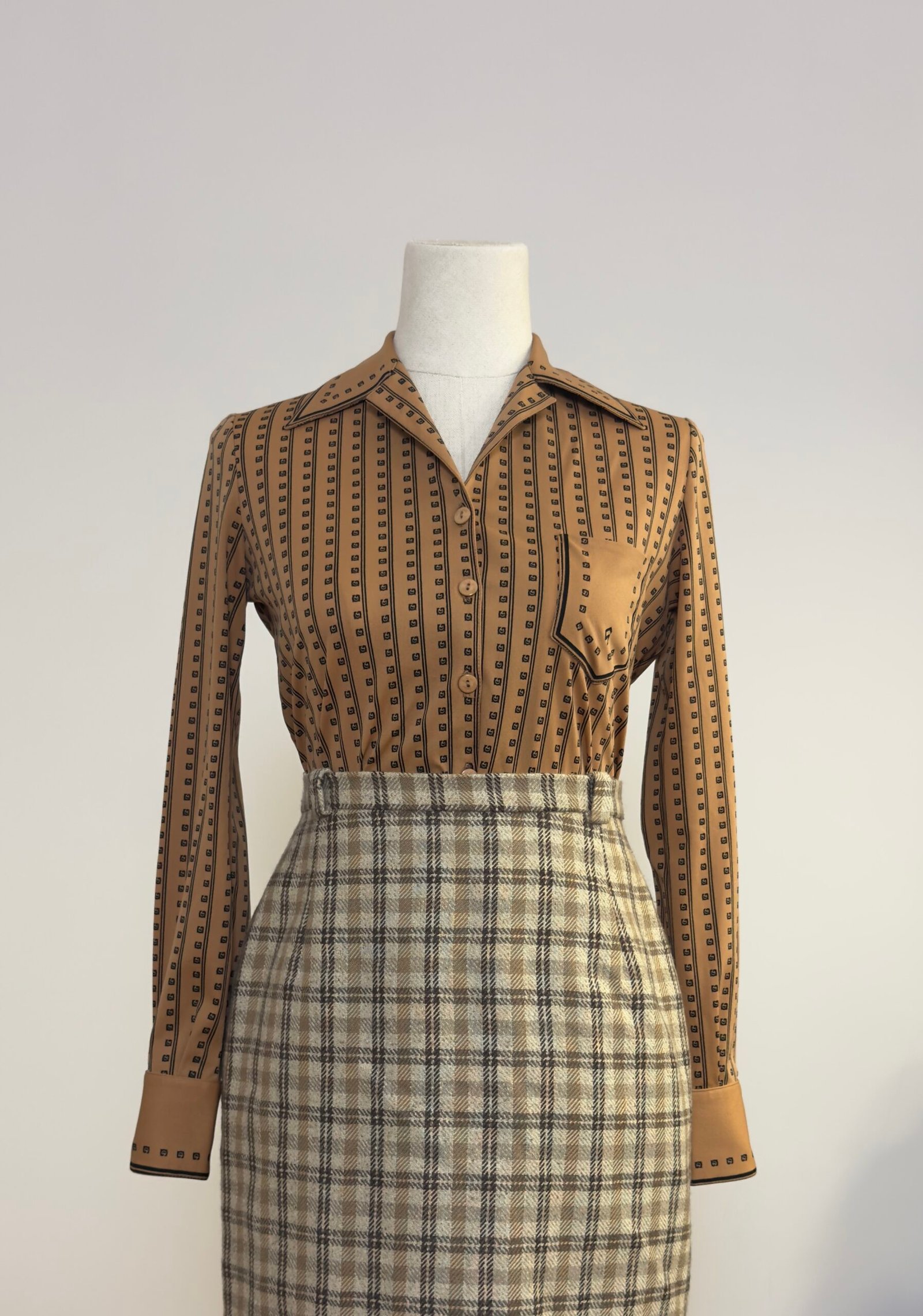 Camisa de manga larga, cuello solapa con palas pronunciadas, marrón estampado de rayas negras y cuadrados. Bolsillo y botones originales marrones. Prenda entallada.