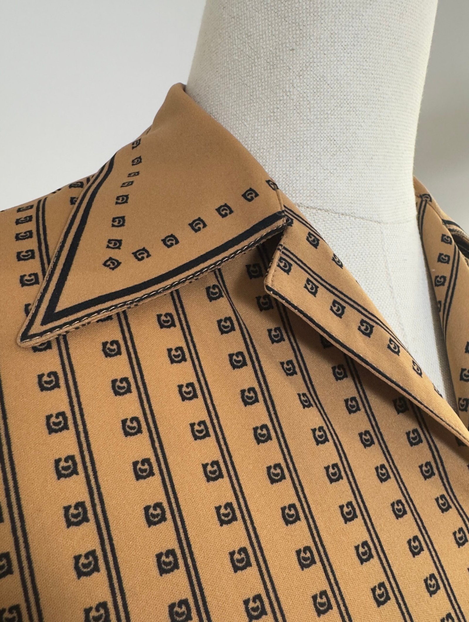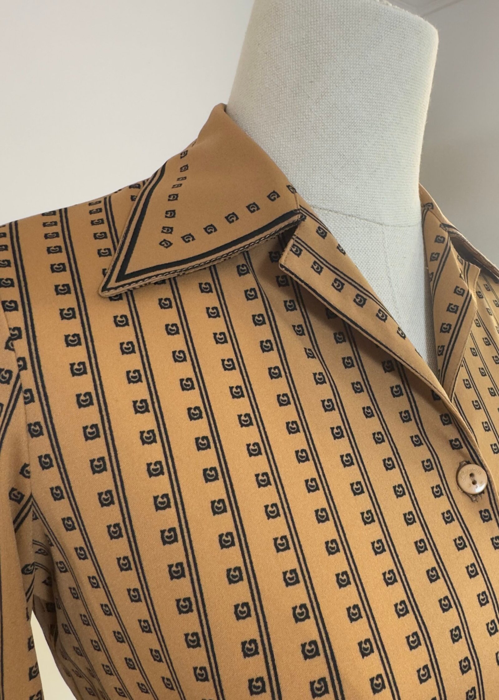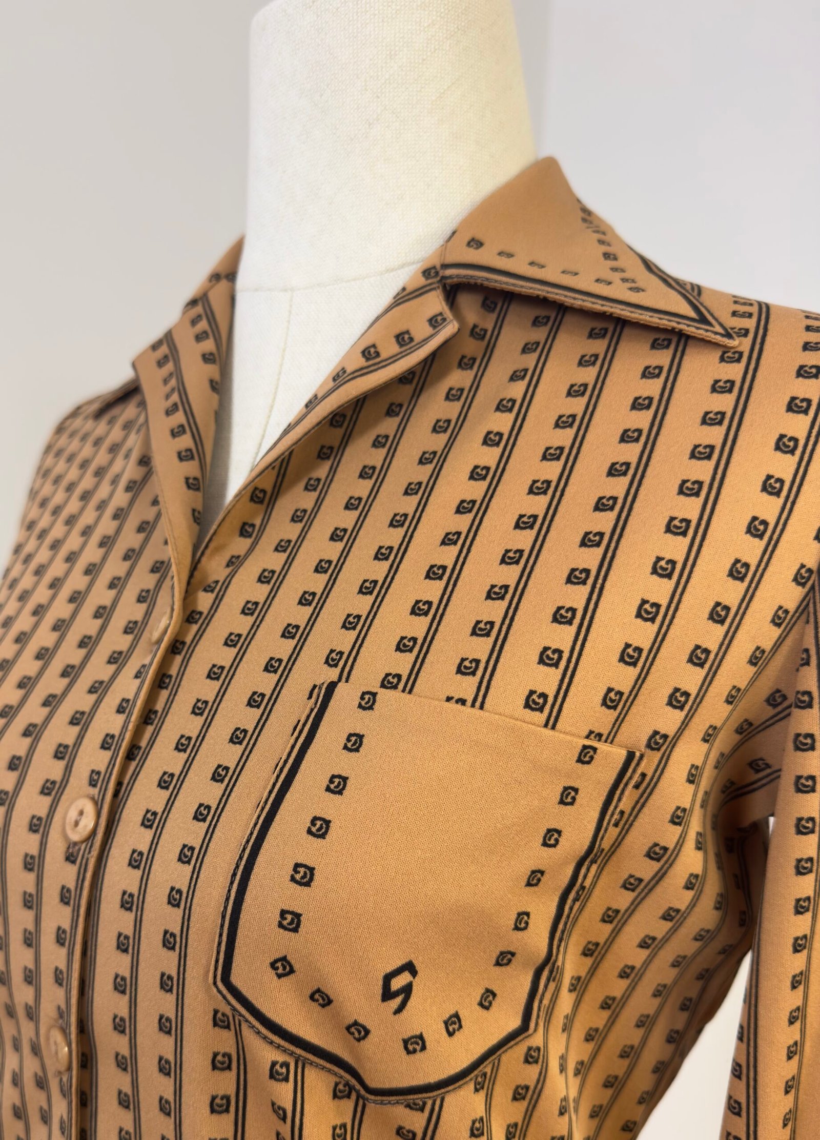Camisa de manga larga, cuello solapa con palas pronunciadas, marrón estampado de rayas negras y cuadrados. Bolsillo y botones originales marrones. Prenda entallada.