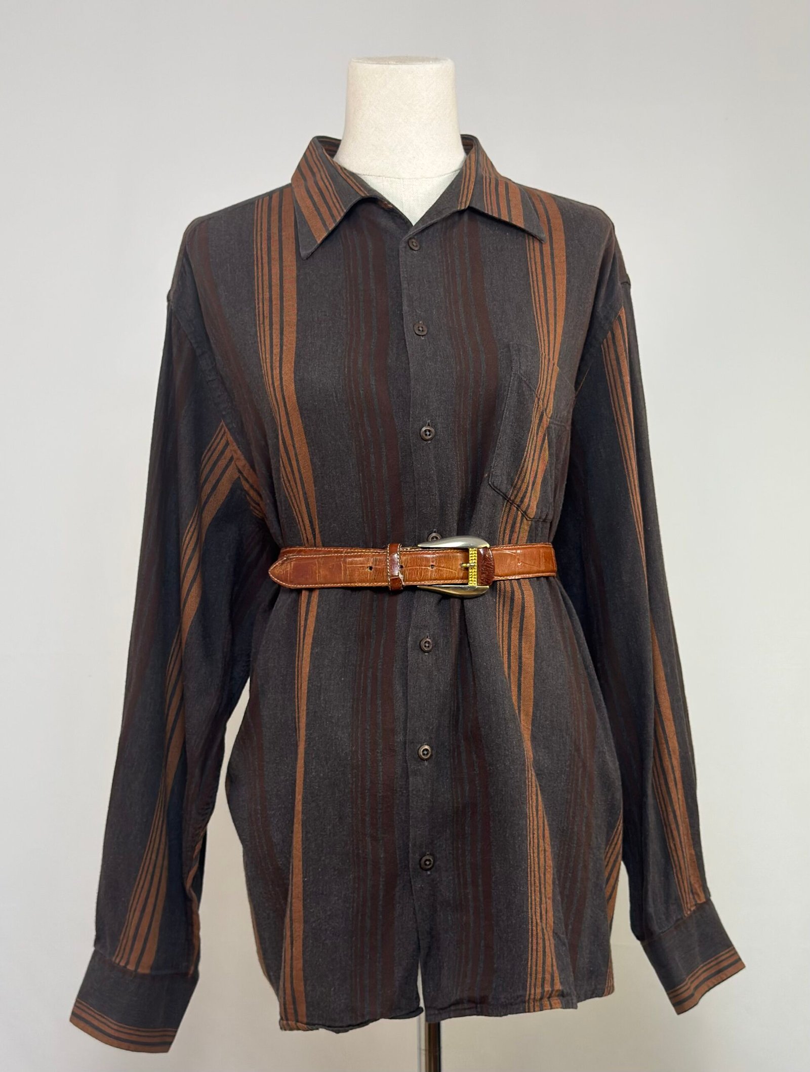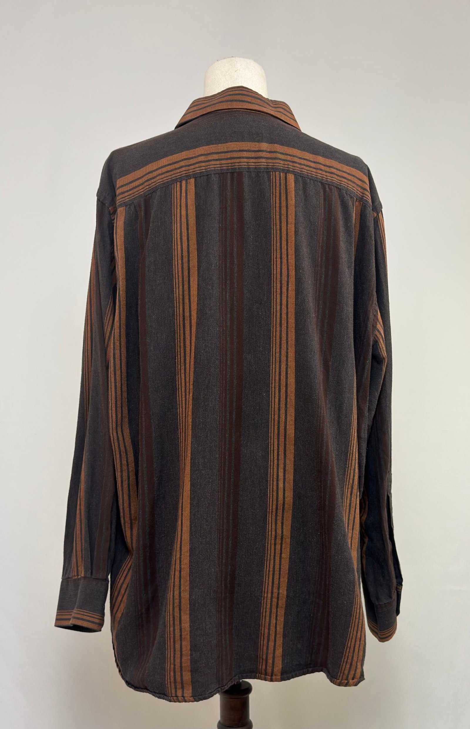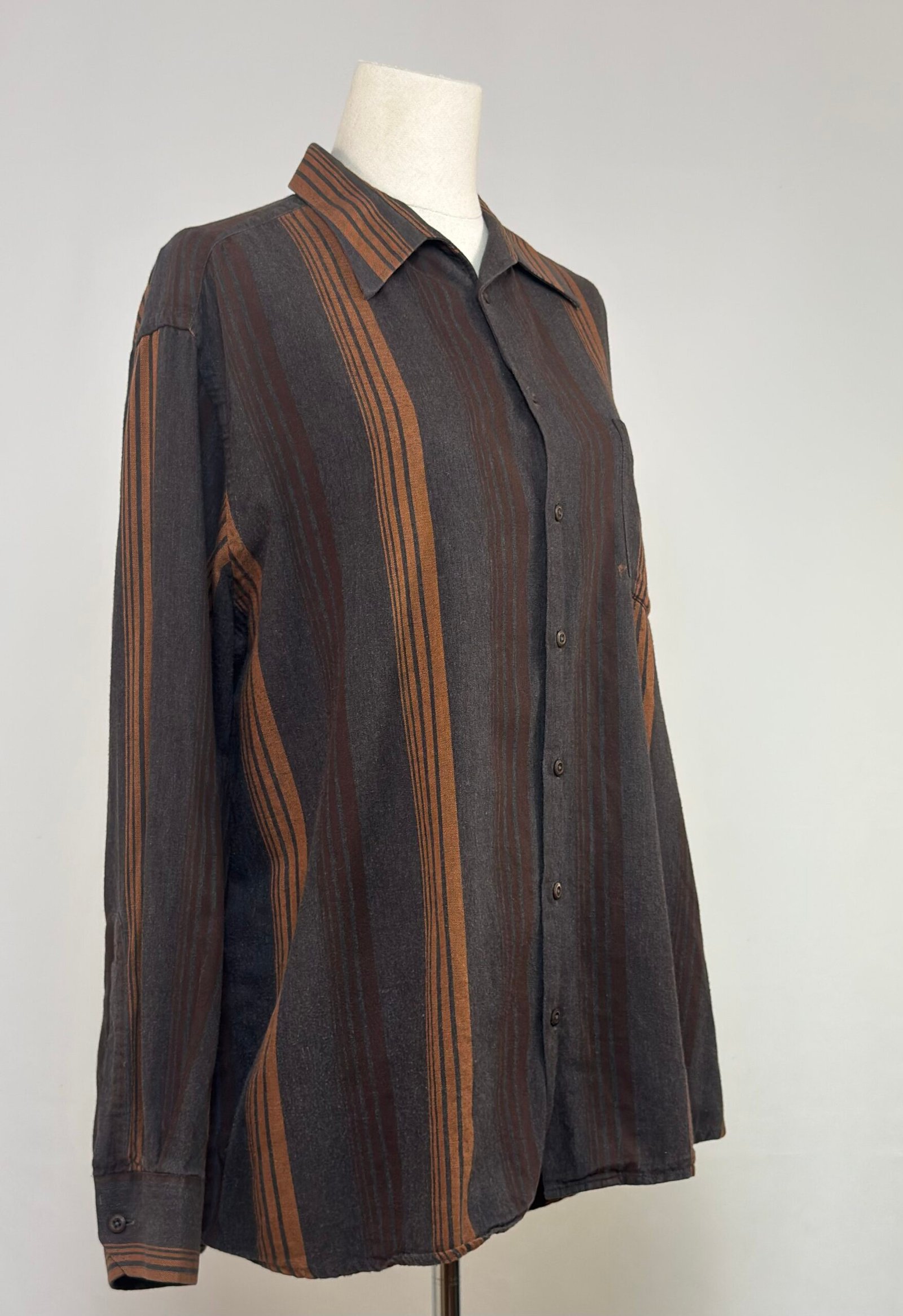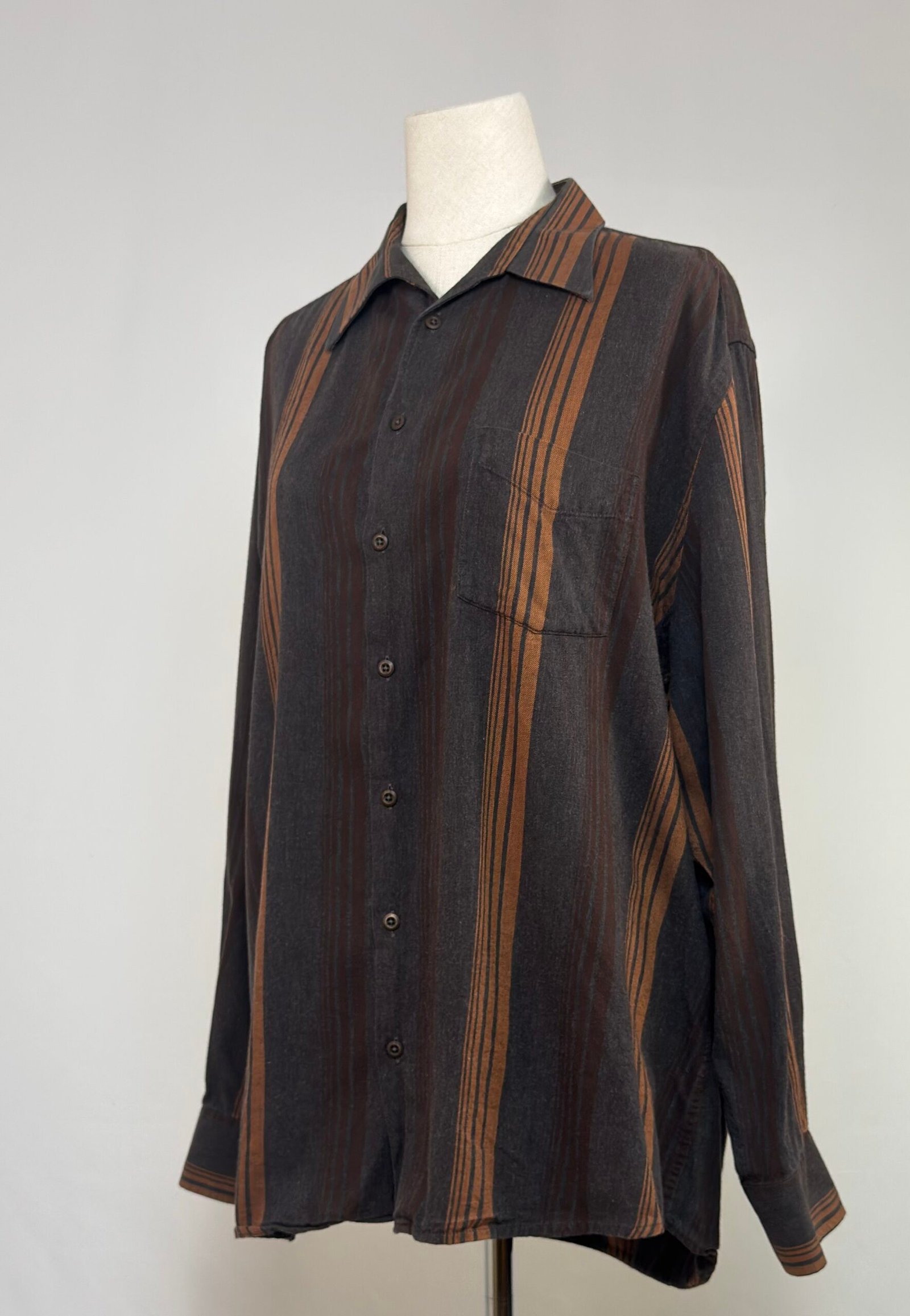 Camisa manga larga de hombre de cuello entre camisero y un poco solapa, marrón con rayas verticales marrón claro. Botones marrones, bolsillo en el delantero. Más larga por detrás que por delante. Tejido con mucha caída y de gran calidad.