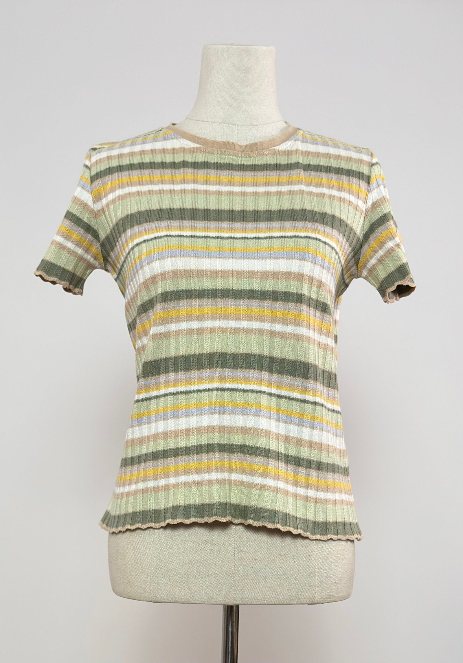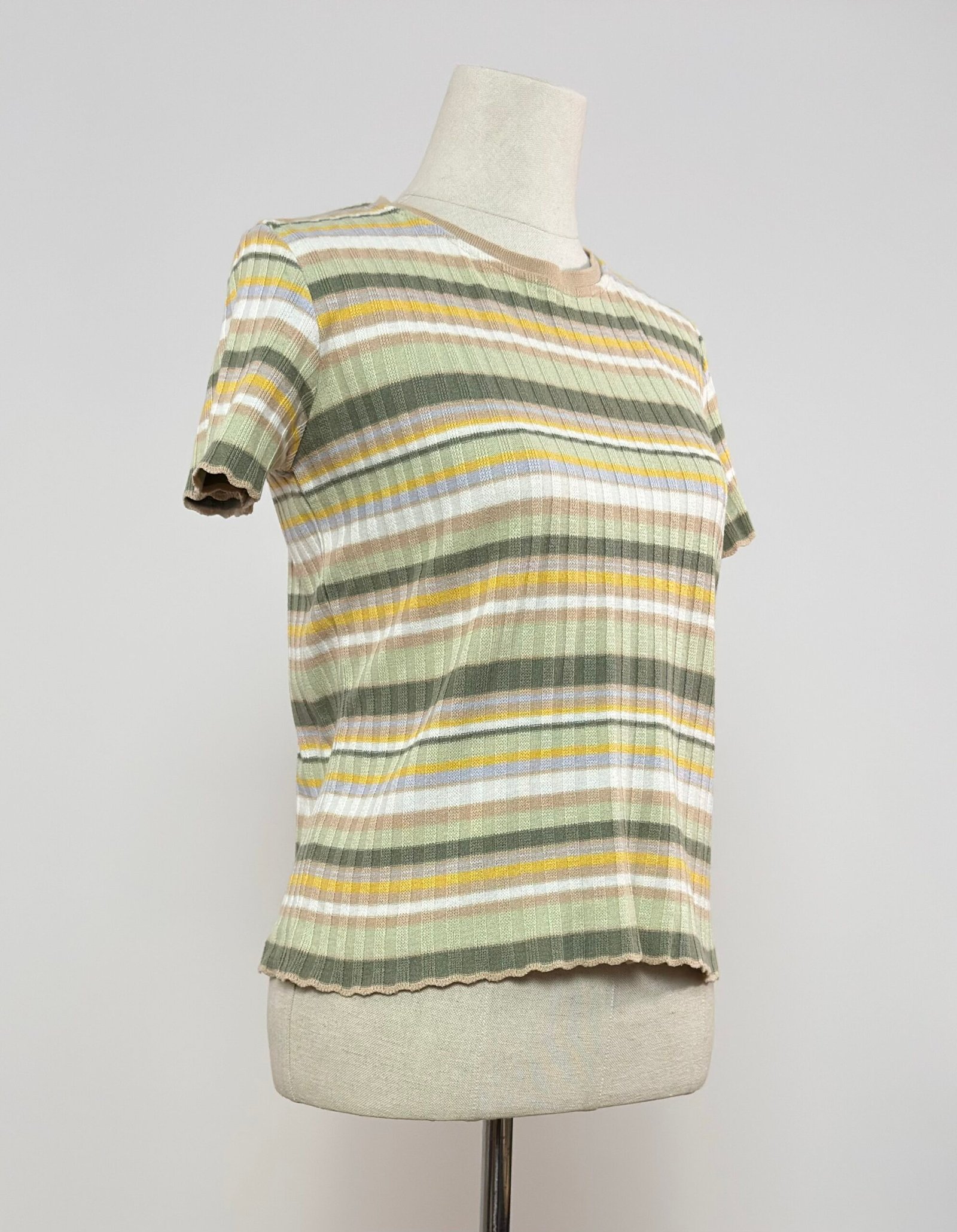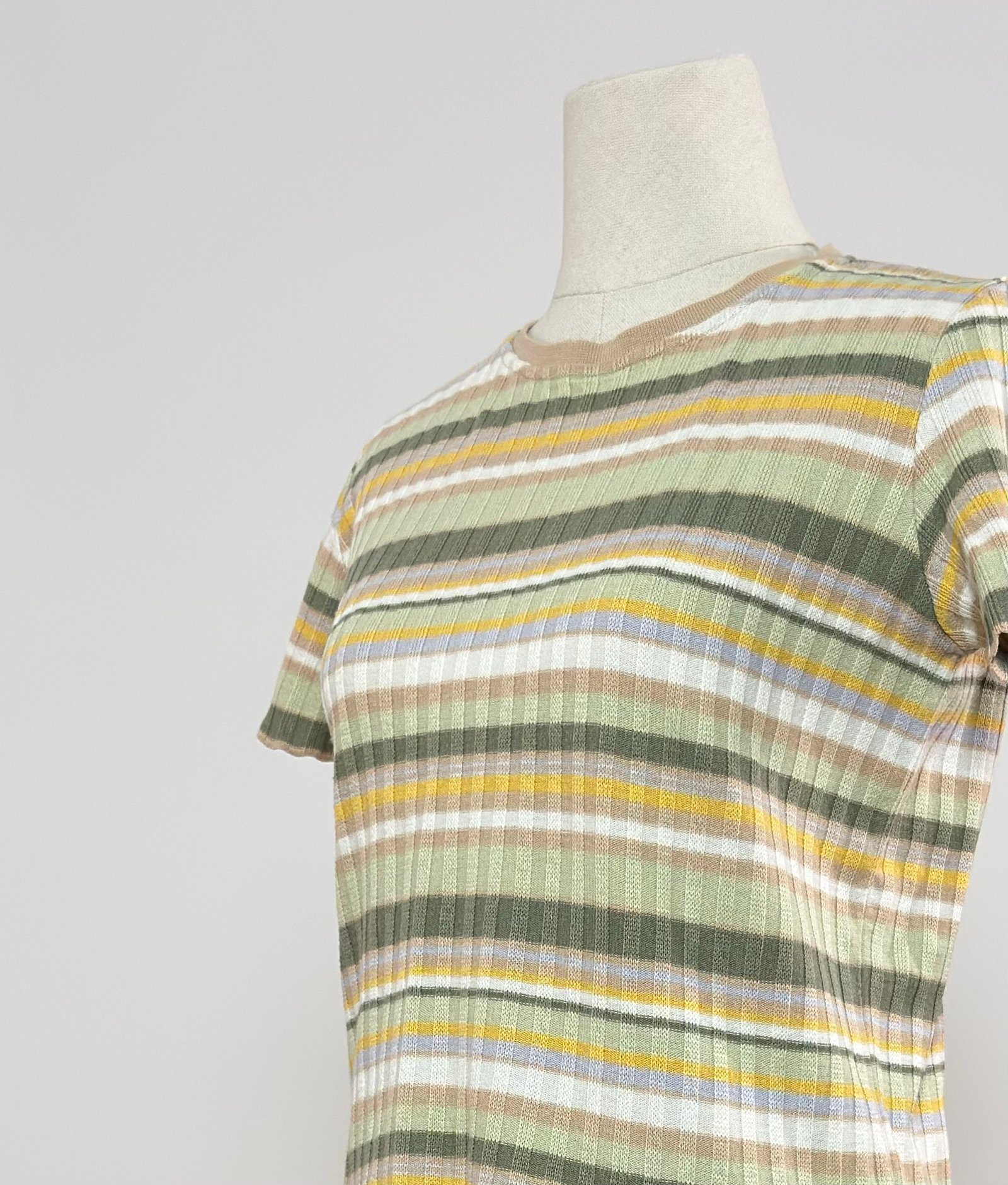 Top de punto acanalado, de manga corta de rayas tonos caquis, amarillo y beige.