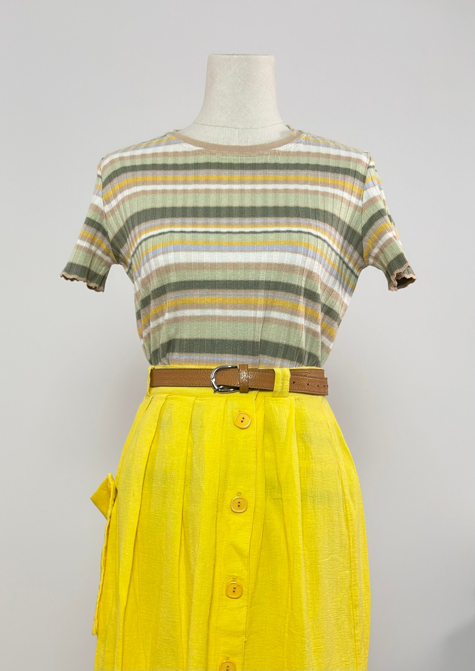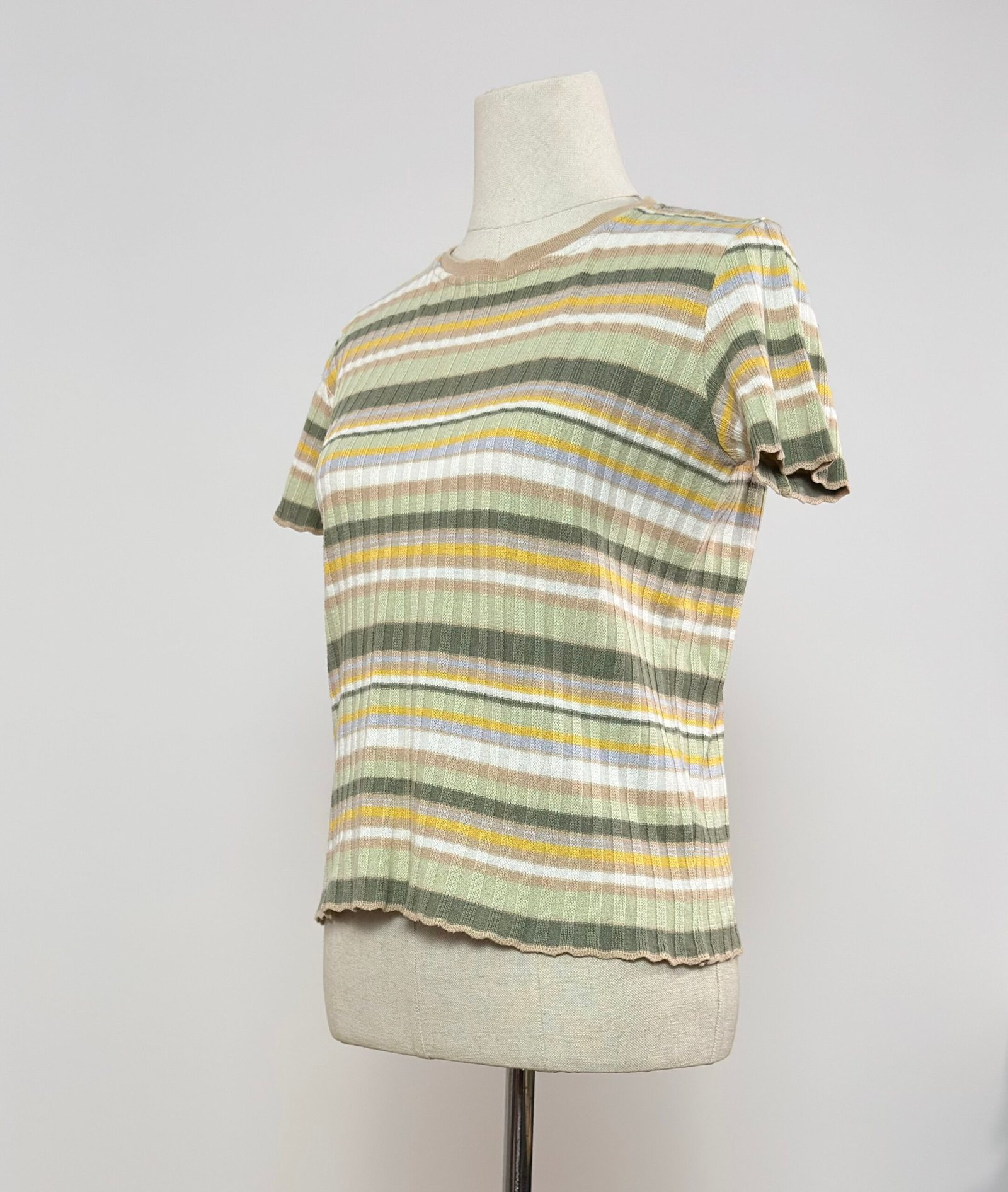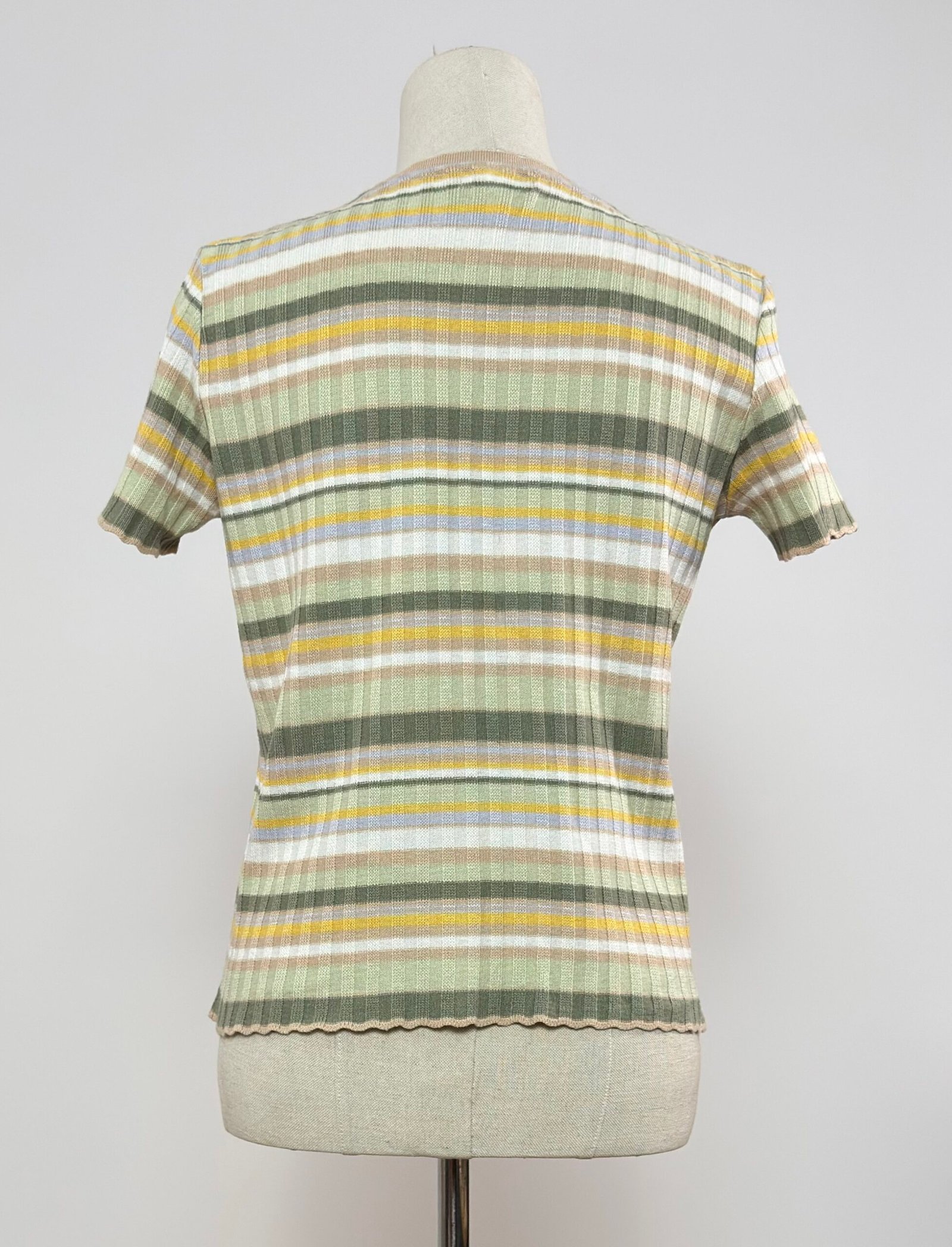 Top de punto acanalado, de manga corta de rayas tonos caquis, amarillo y beige.