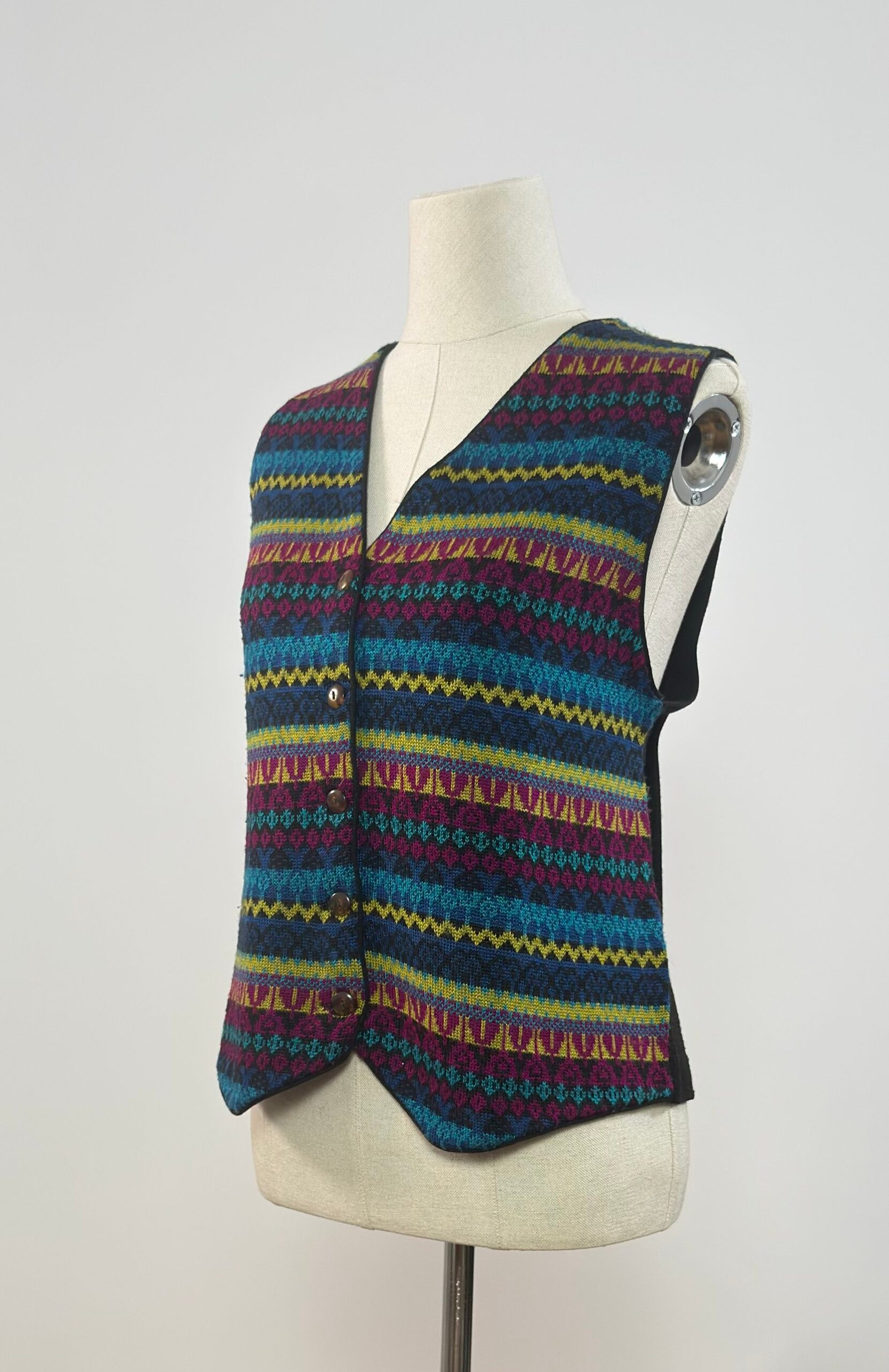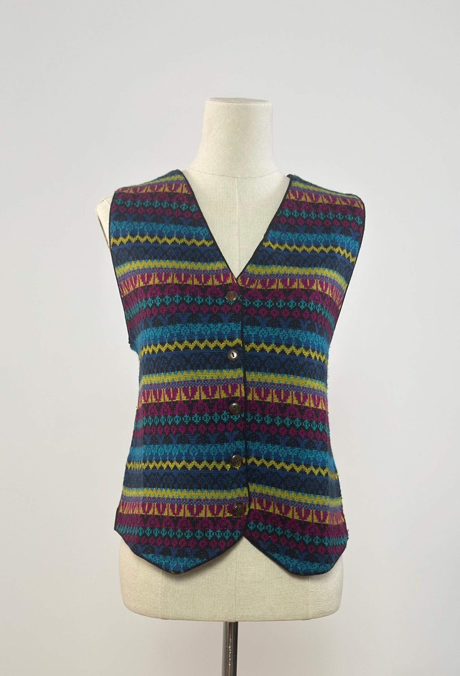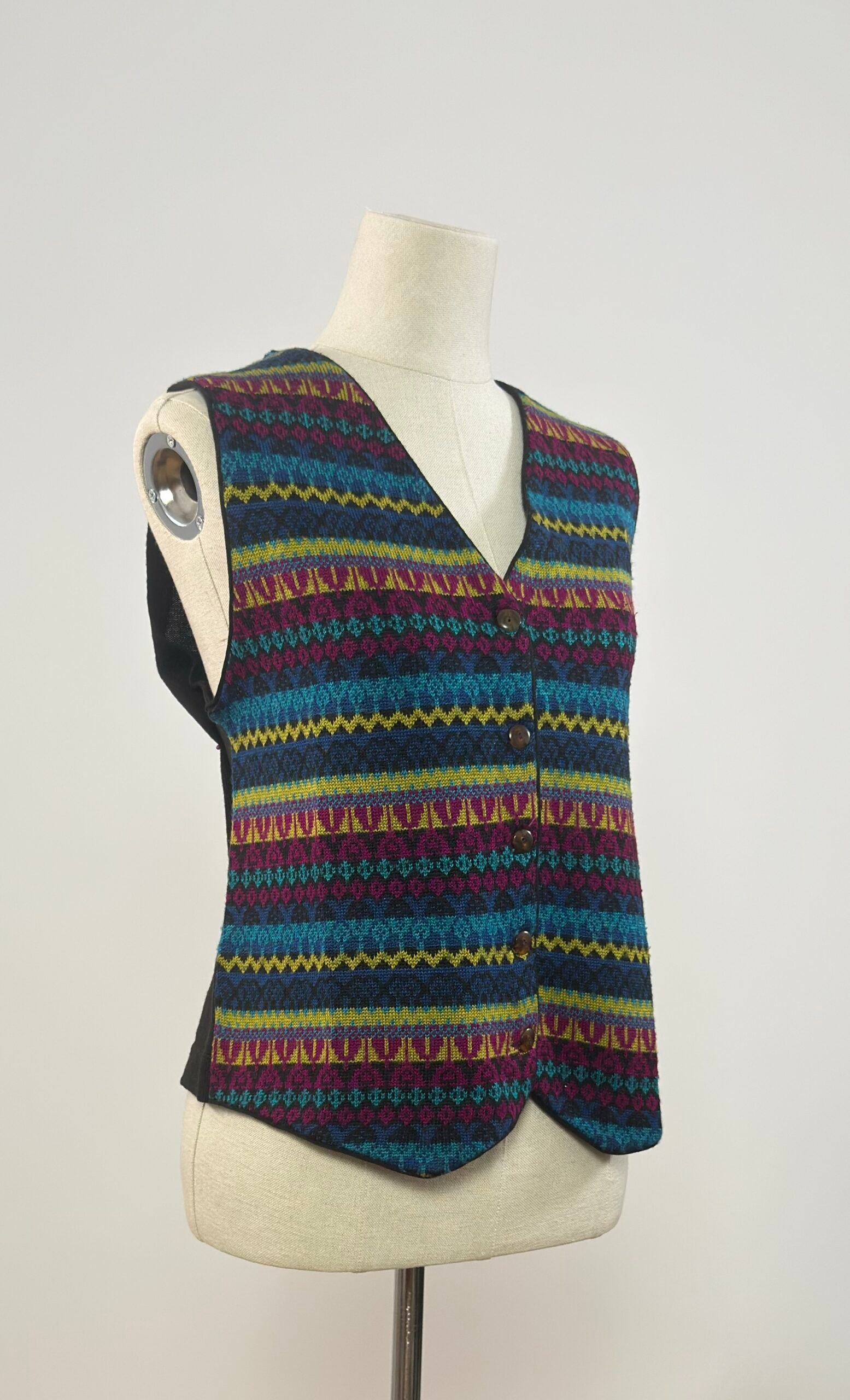 Chaleco de rayas varias, estampado tipo alpino en colores malva, azul y amarillo, con la parte de atrás negra. Abotonado con botones originales marrones.