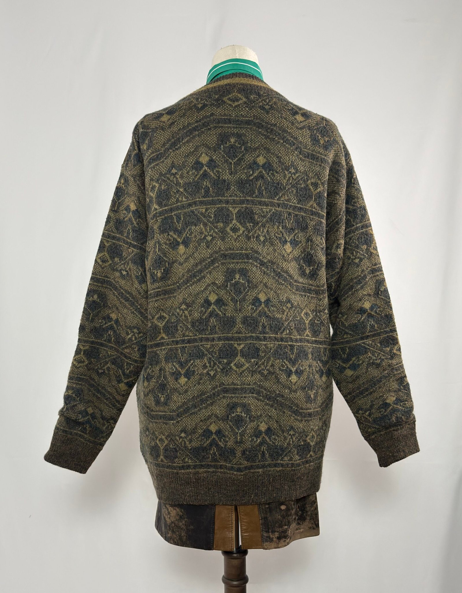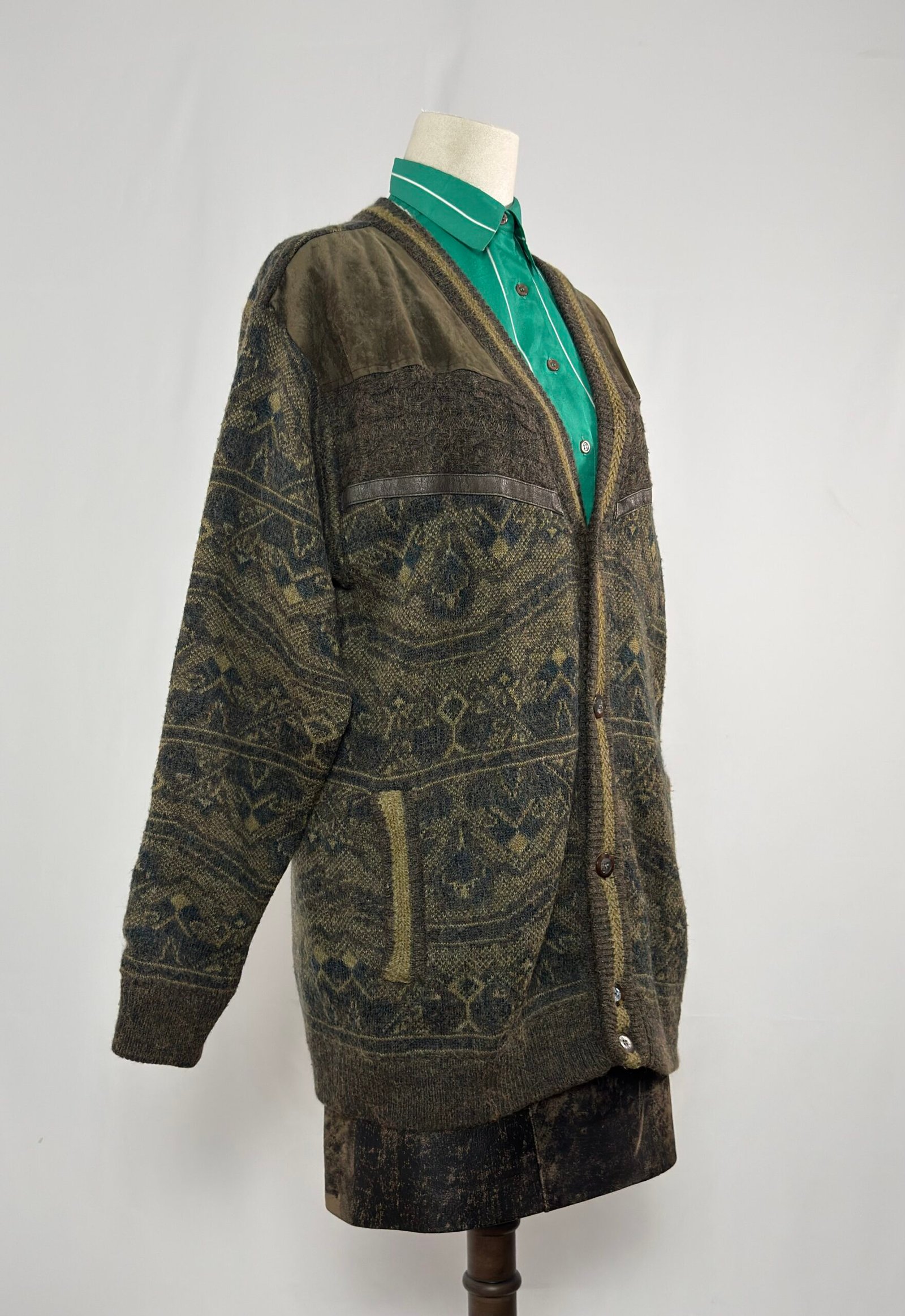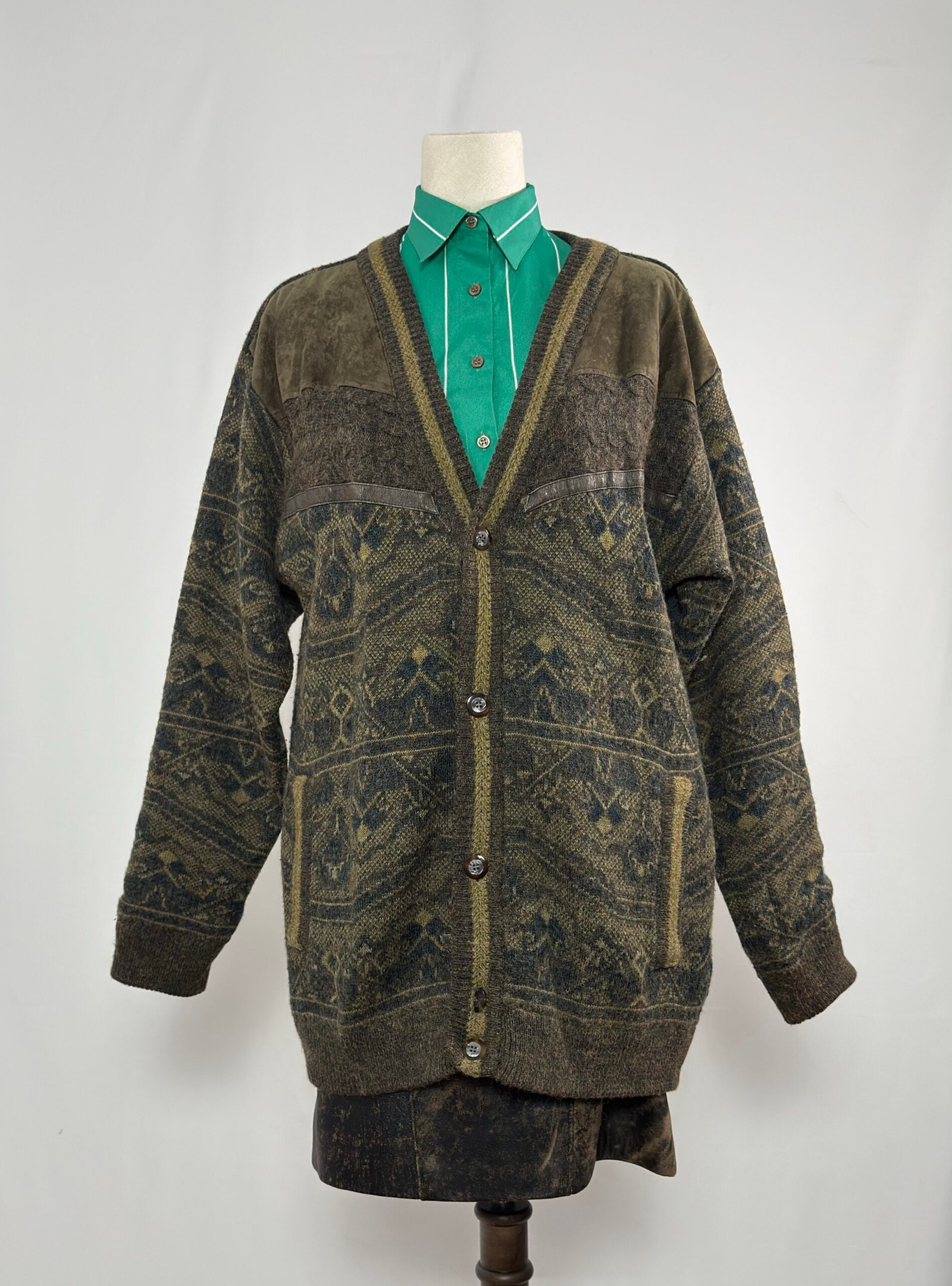 Chaqueta de lana en tonos marrones y verdes, abotonada con botones originales, totalmente forrada y con dos bolsillos. Piezas de canesú frontal y detalles en el pecho de tejido de piel vuelta. Puños y bajo en patente.