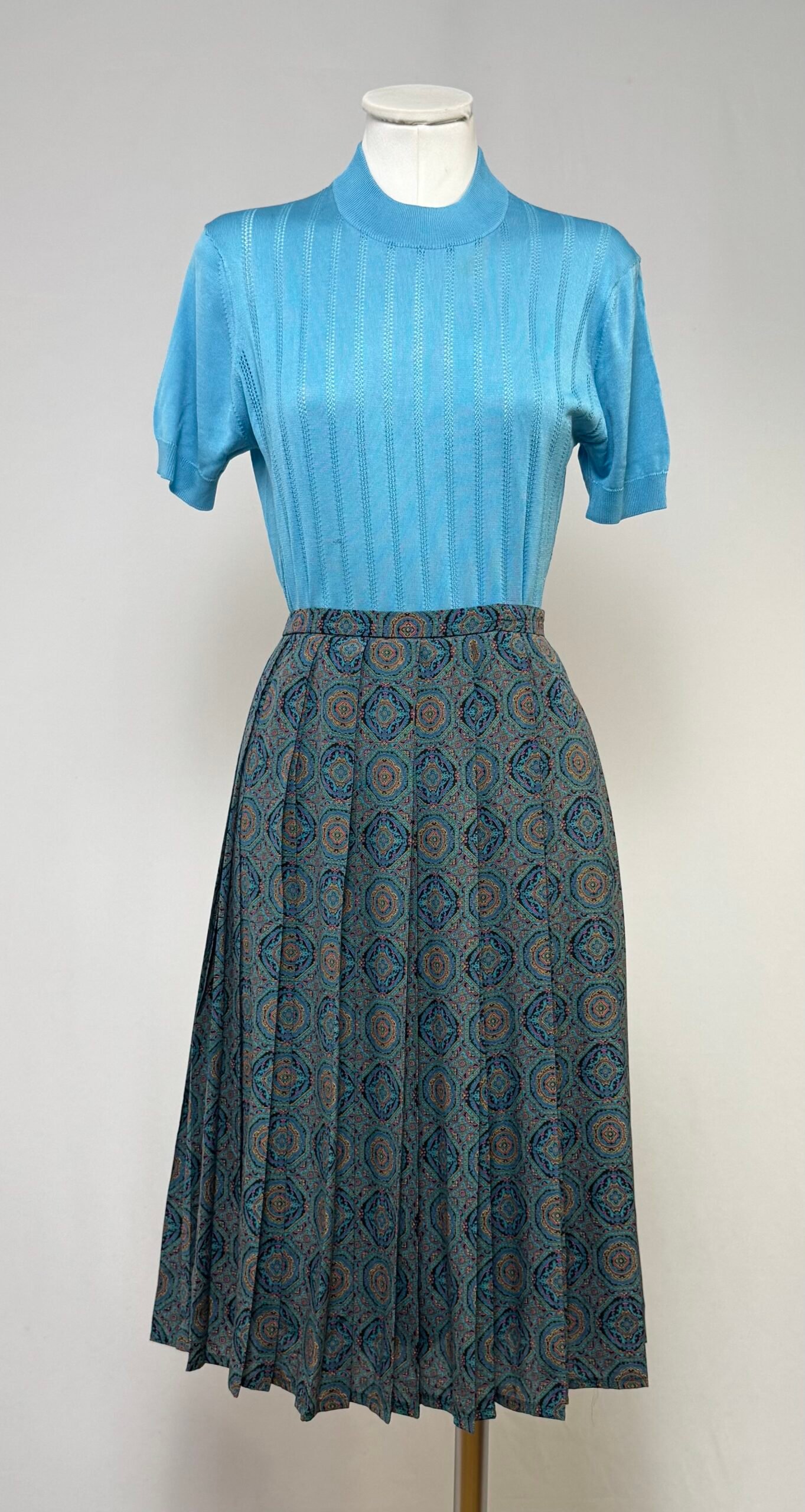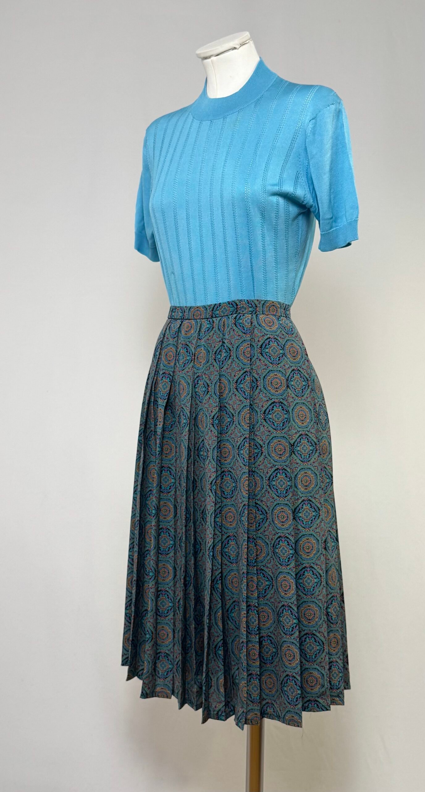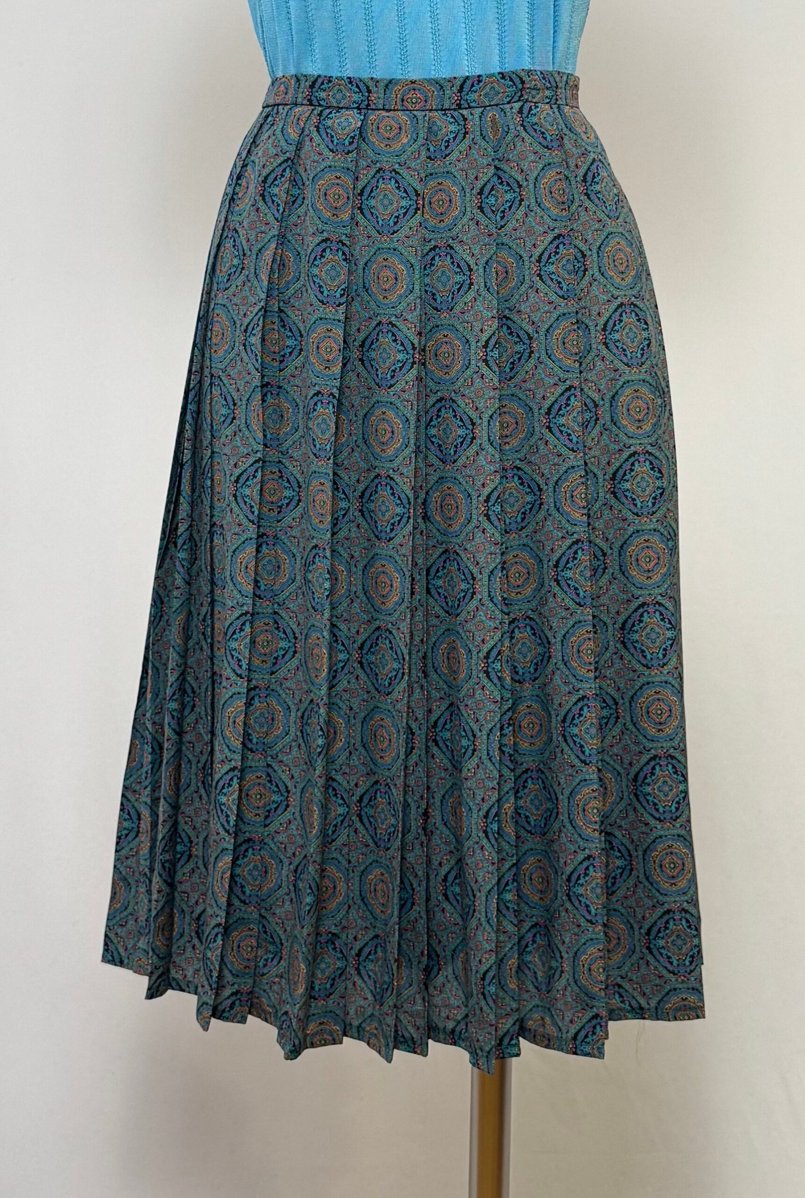 Falda midi plisada estampada multicolor tipo cachemira, con cinturilla elástica y cierre trasero con cremallera. Forrada con forro negro.