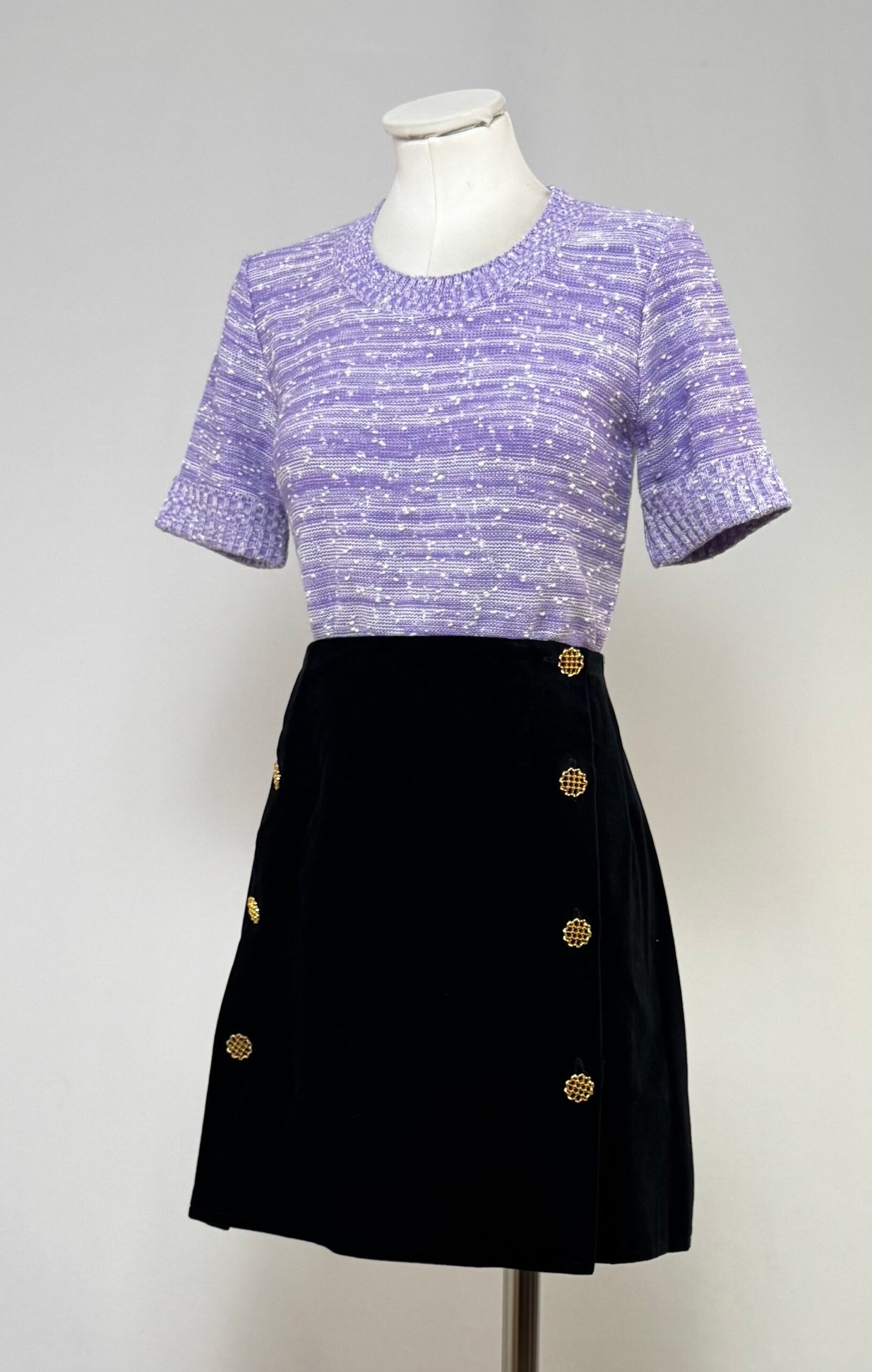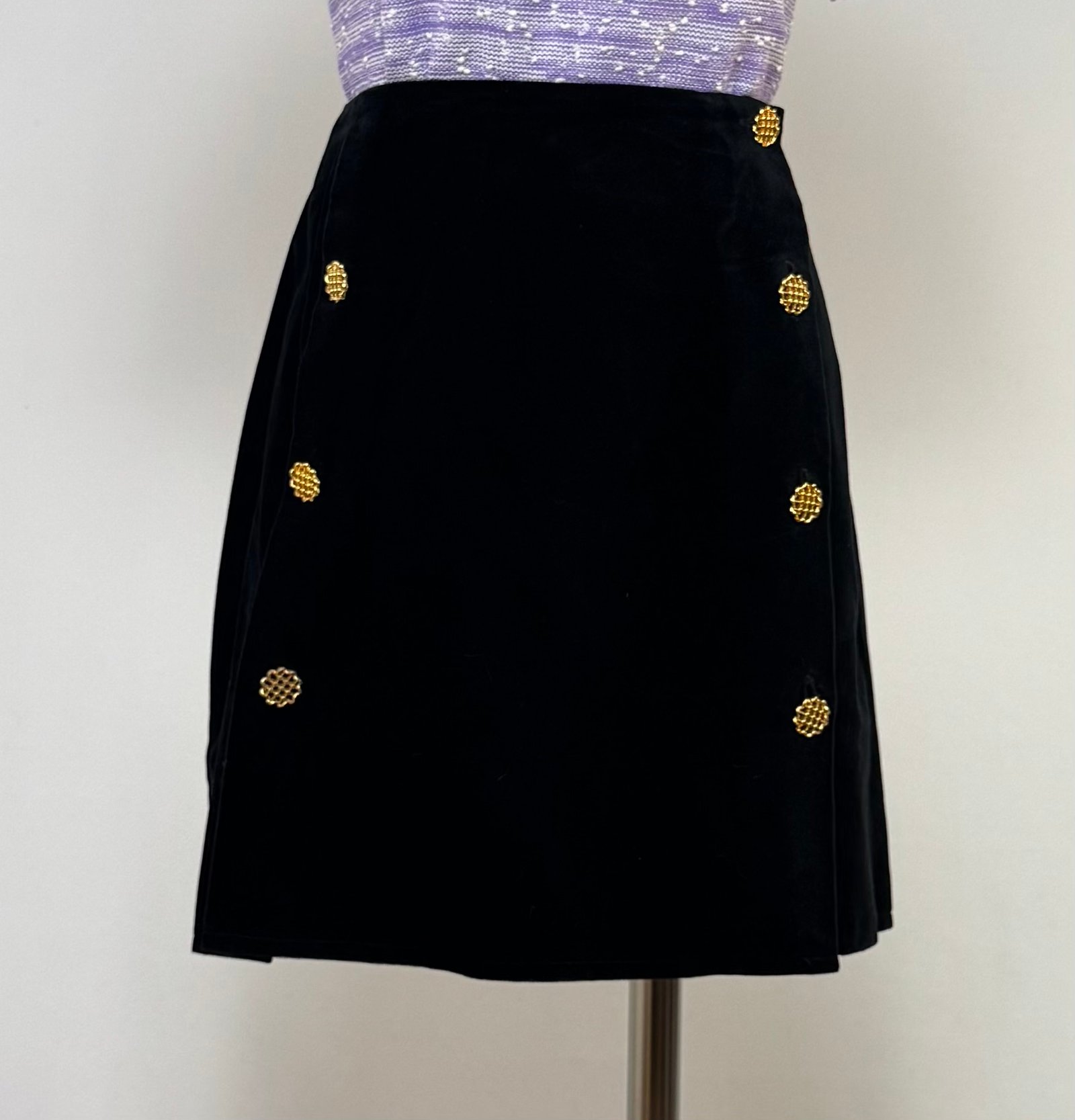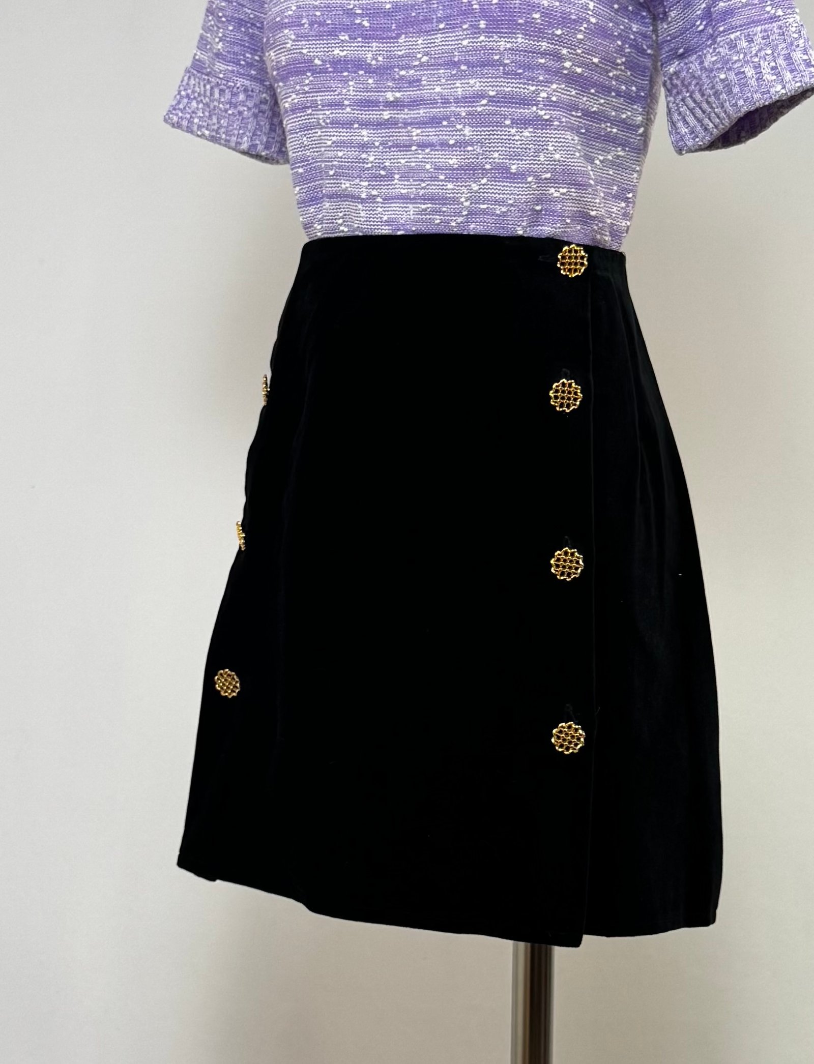 Mini falda negra de terciopelo, abierta al lateral con botones dorados. Sin forro ni cinturilla.