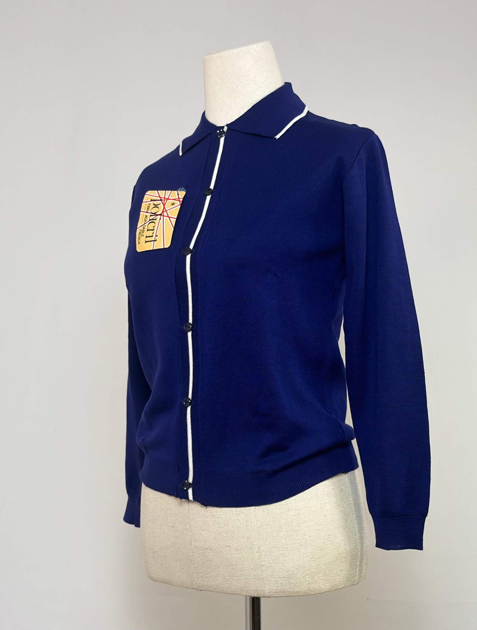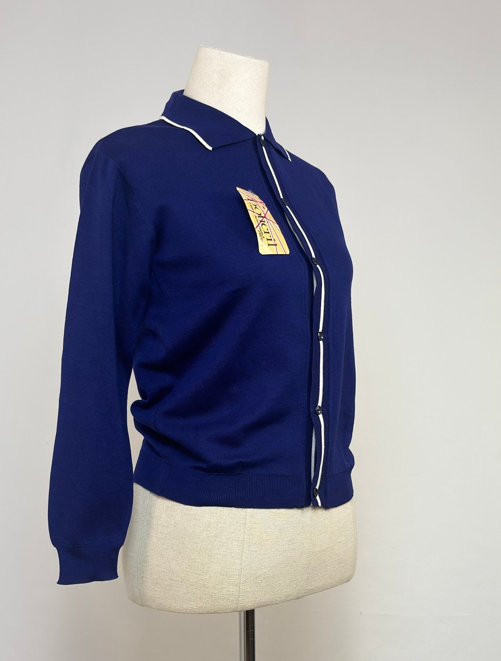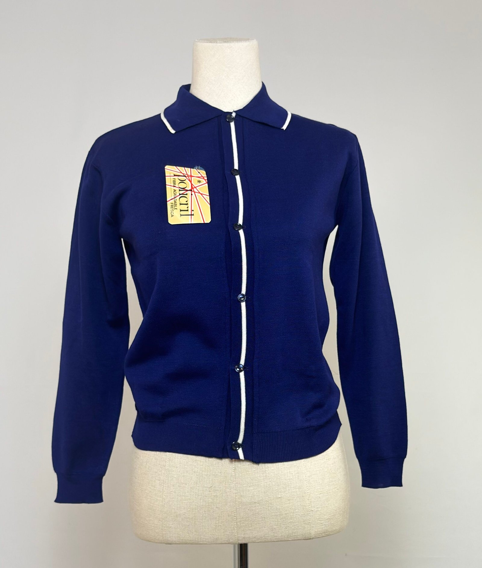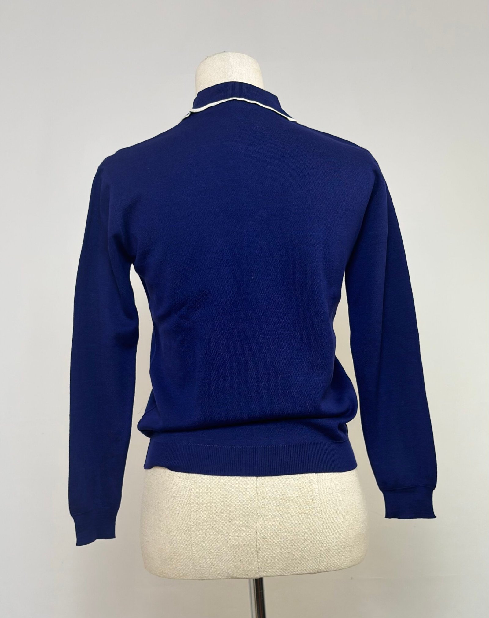 Rebeca de punto azul marino con botones , con cuello caja rematado con filo blanco, al igual que la tapeta. Trama de punto tipo polo, pero mas suave.