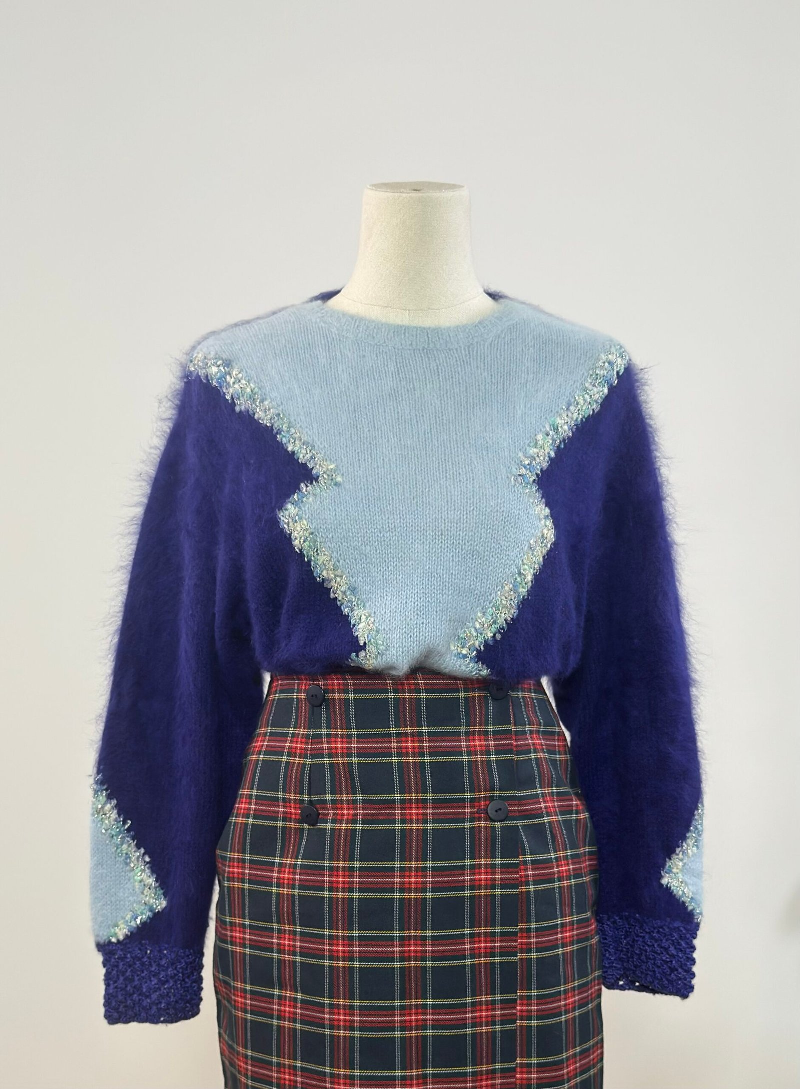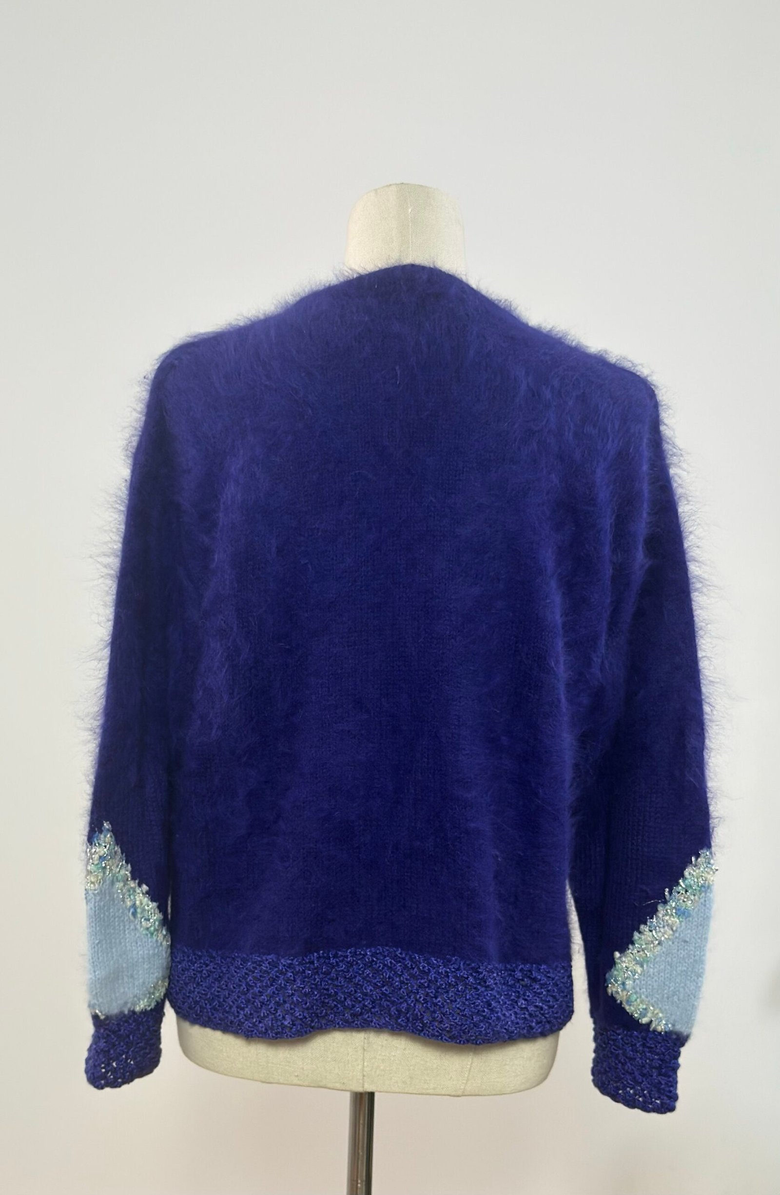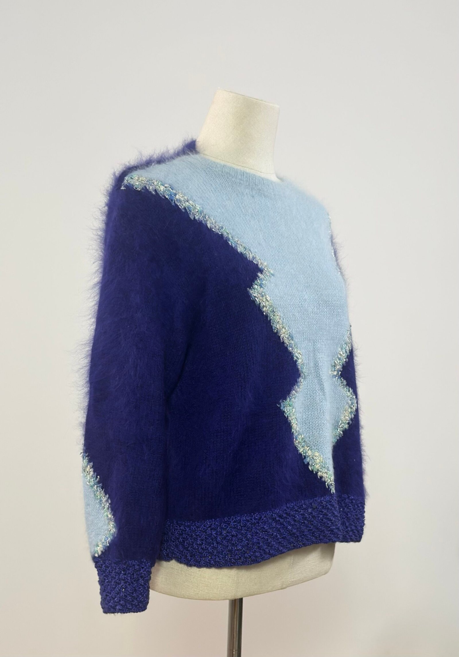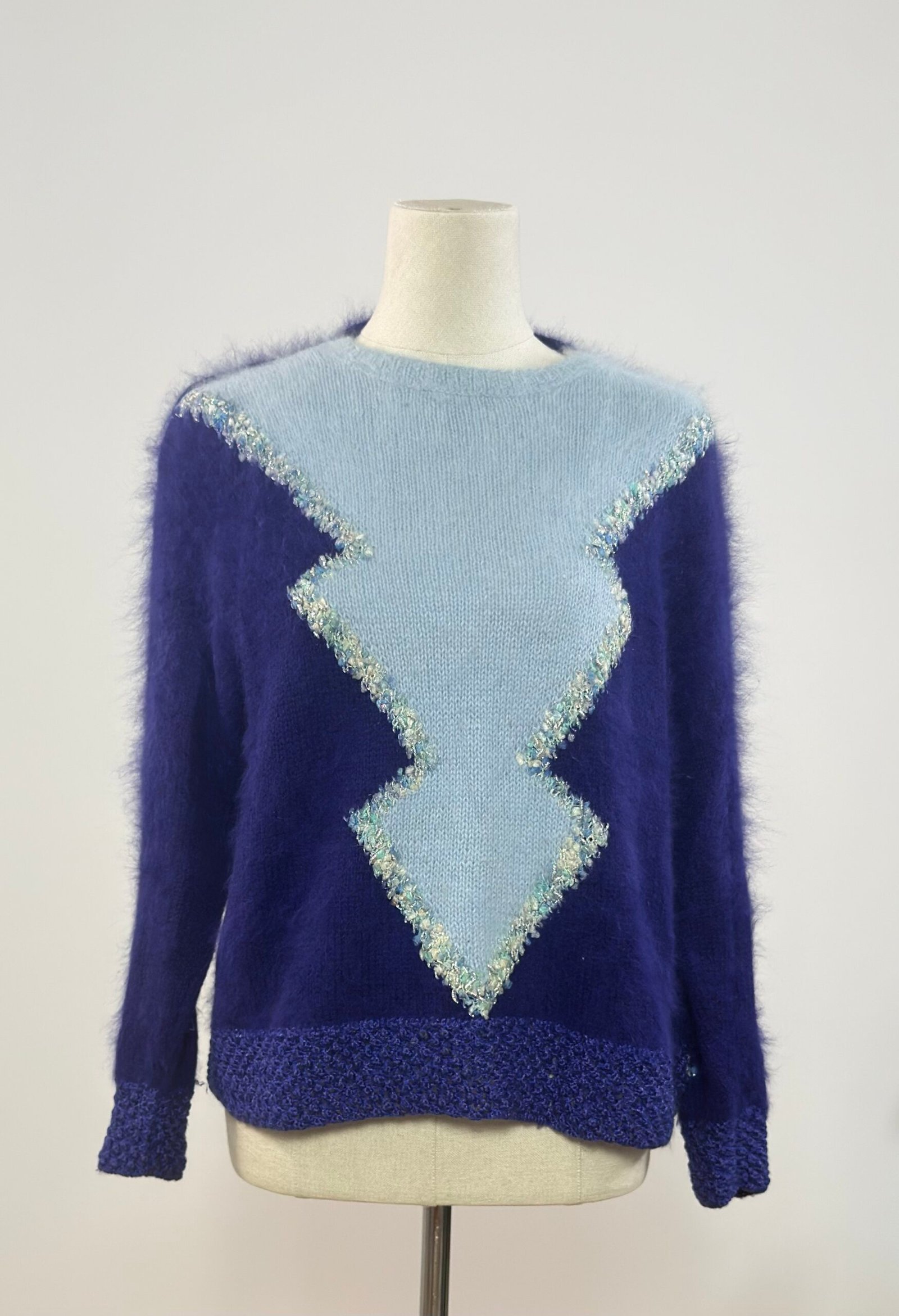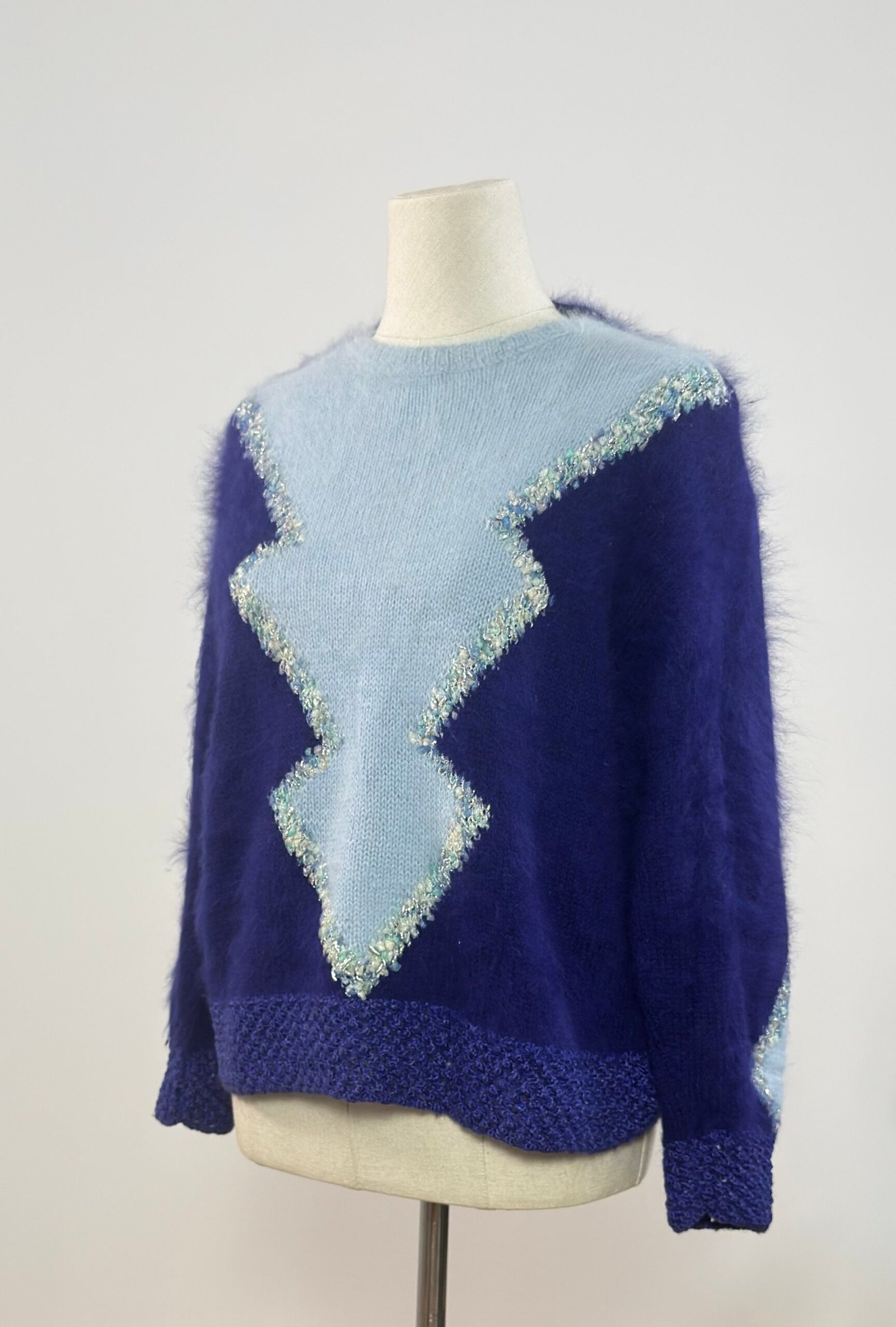 Suéter de manga larga de mohair, en morado y azul cielo. Patente de puños y bajo en crochet del mismo morado. Dibujo frontal realizado con hilatura brillante. Tejido muy cálido.