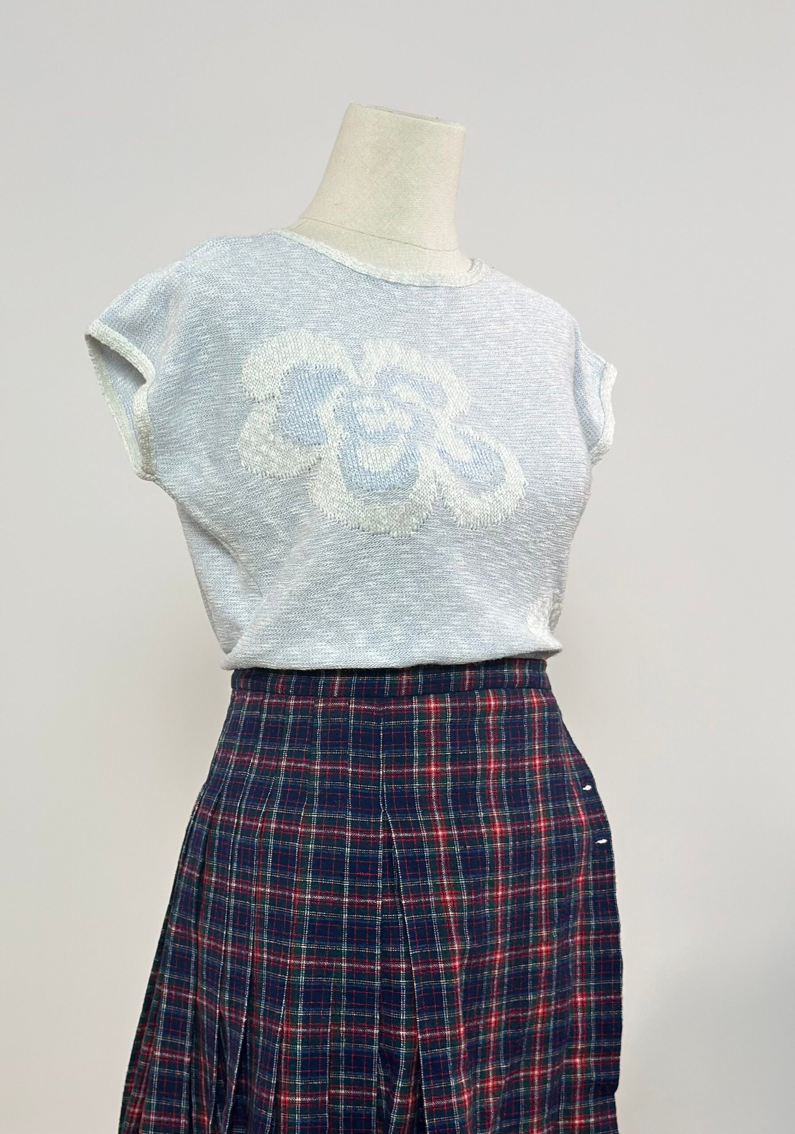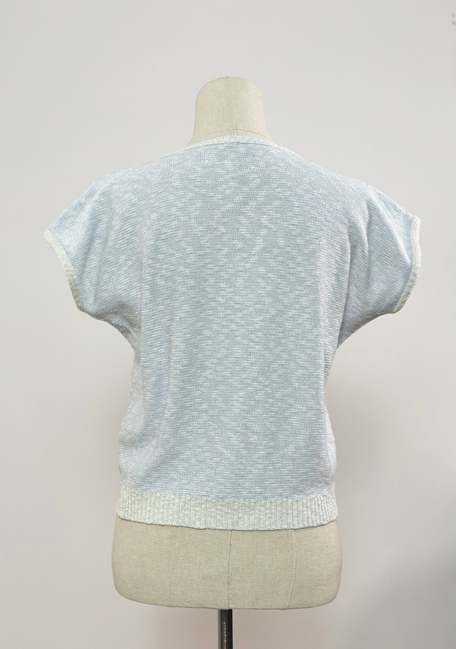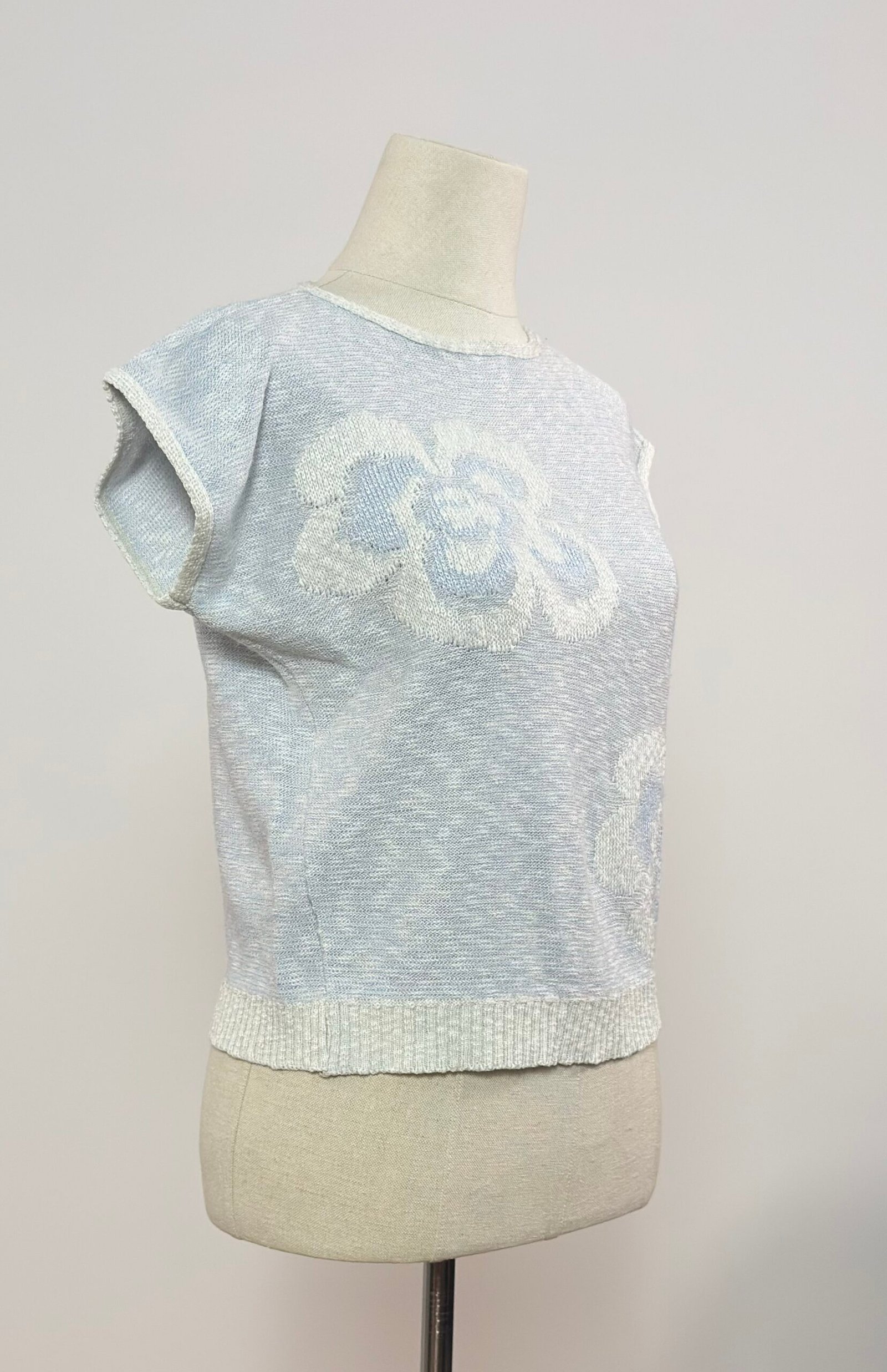 Top de punto manga murciélago, azul claro, con dos flores tejidas en blanco en el delantero. Cuello y mangas rematado en blanco, al igual que la patente. Tejido fresco.