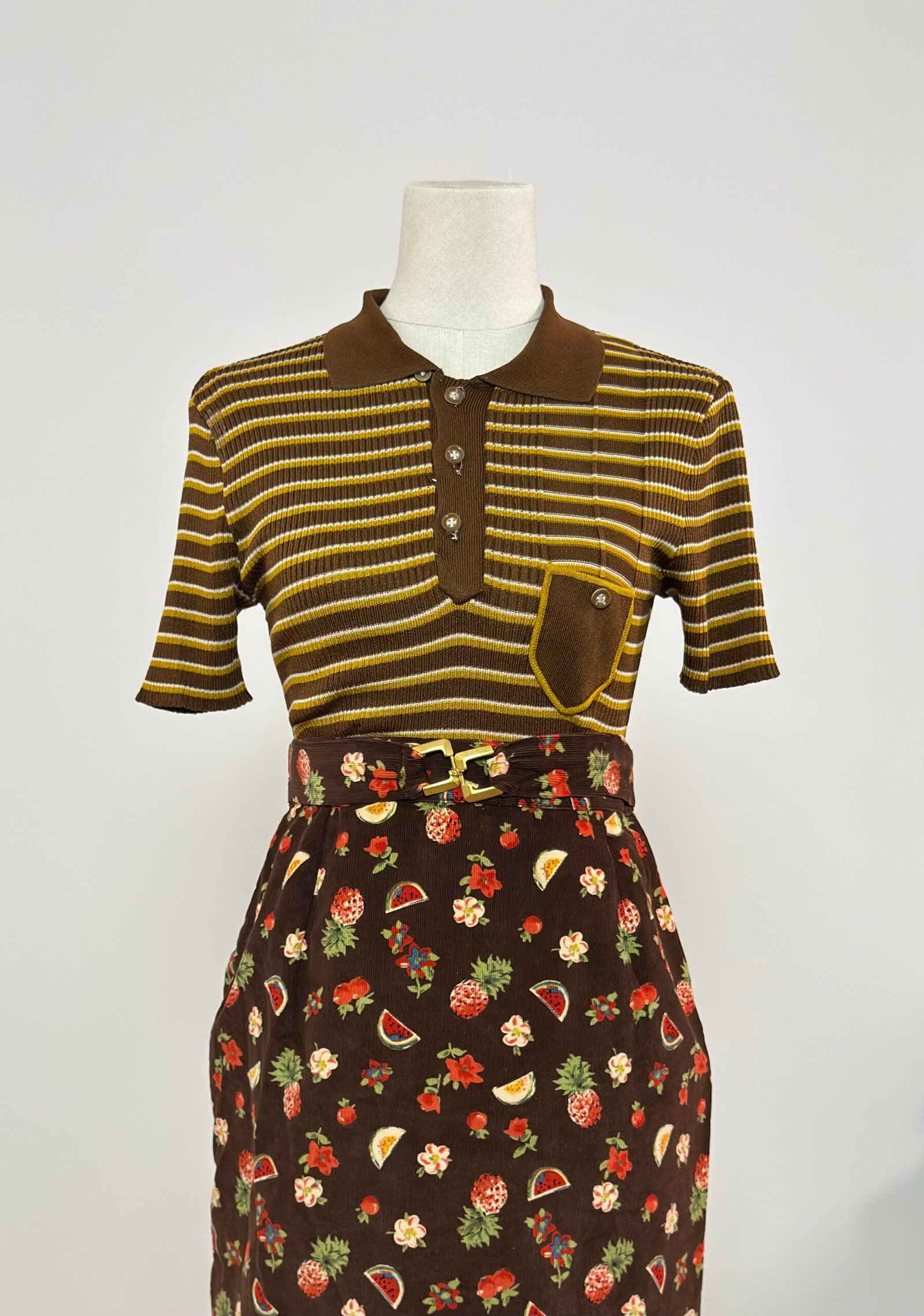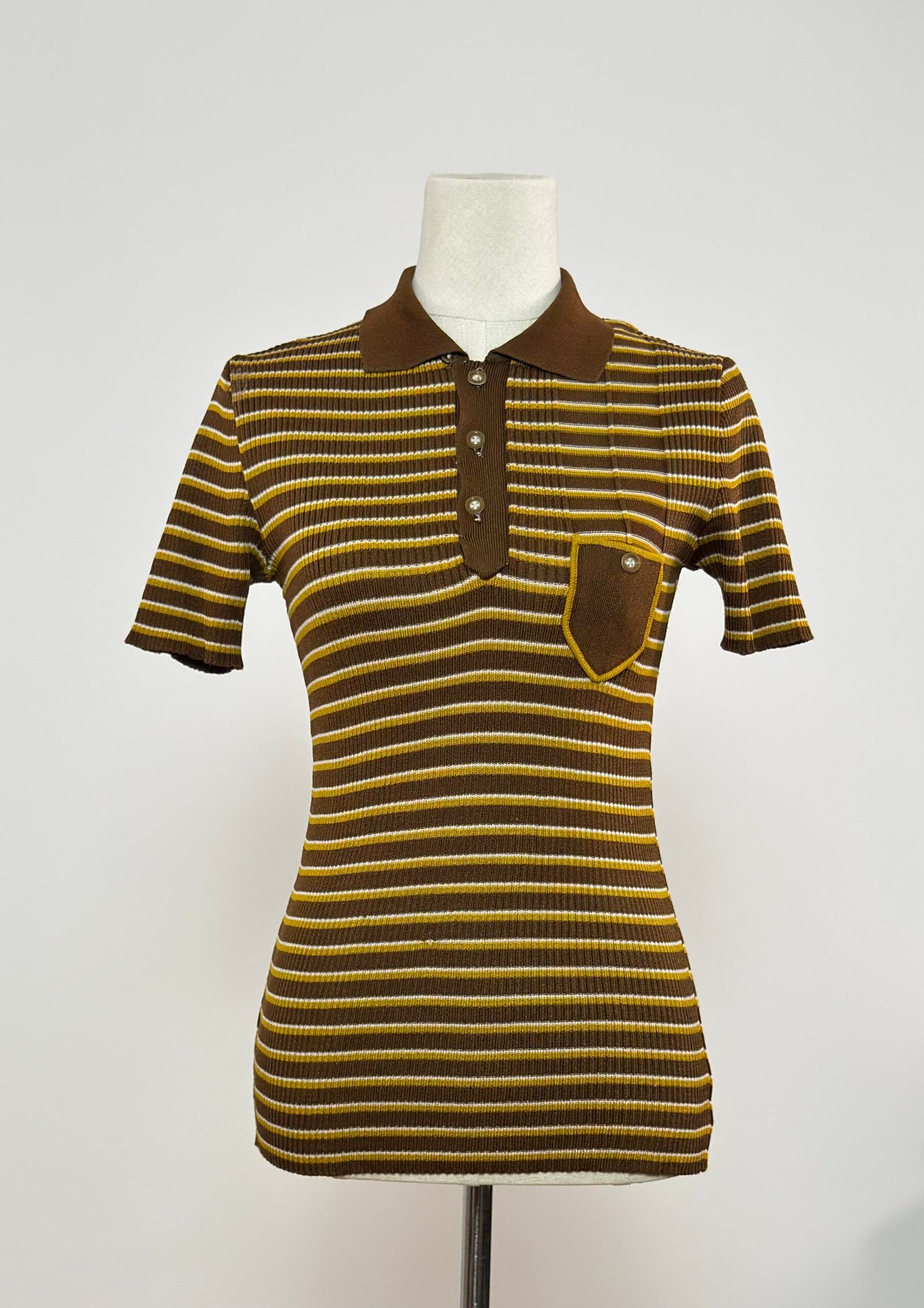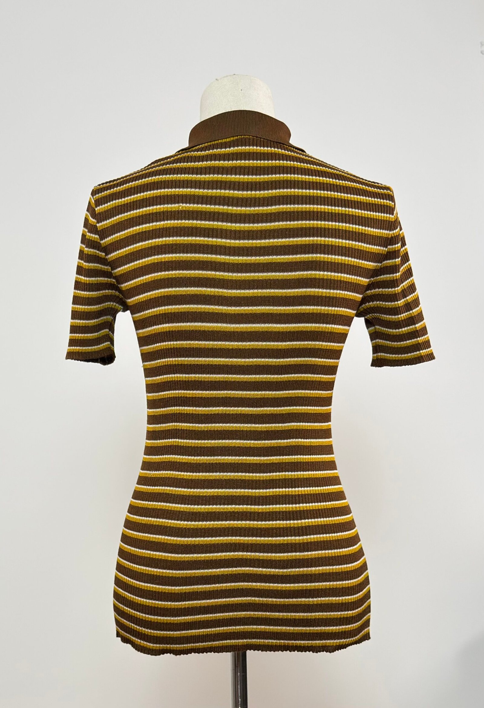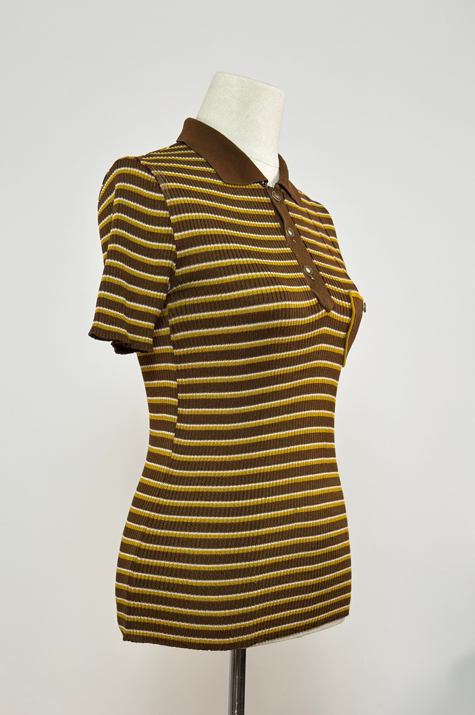 Top tipo polo de punto canalé, cuello camisero, abotonado con botones marrones originales, rayas amarillas y marrón.