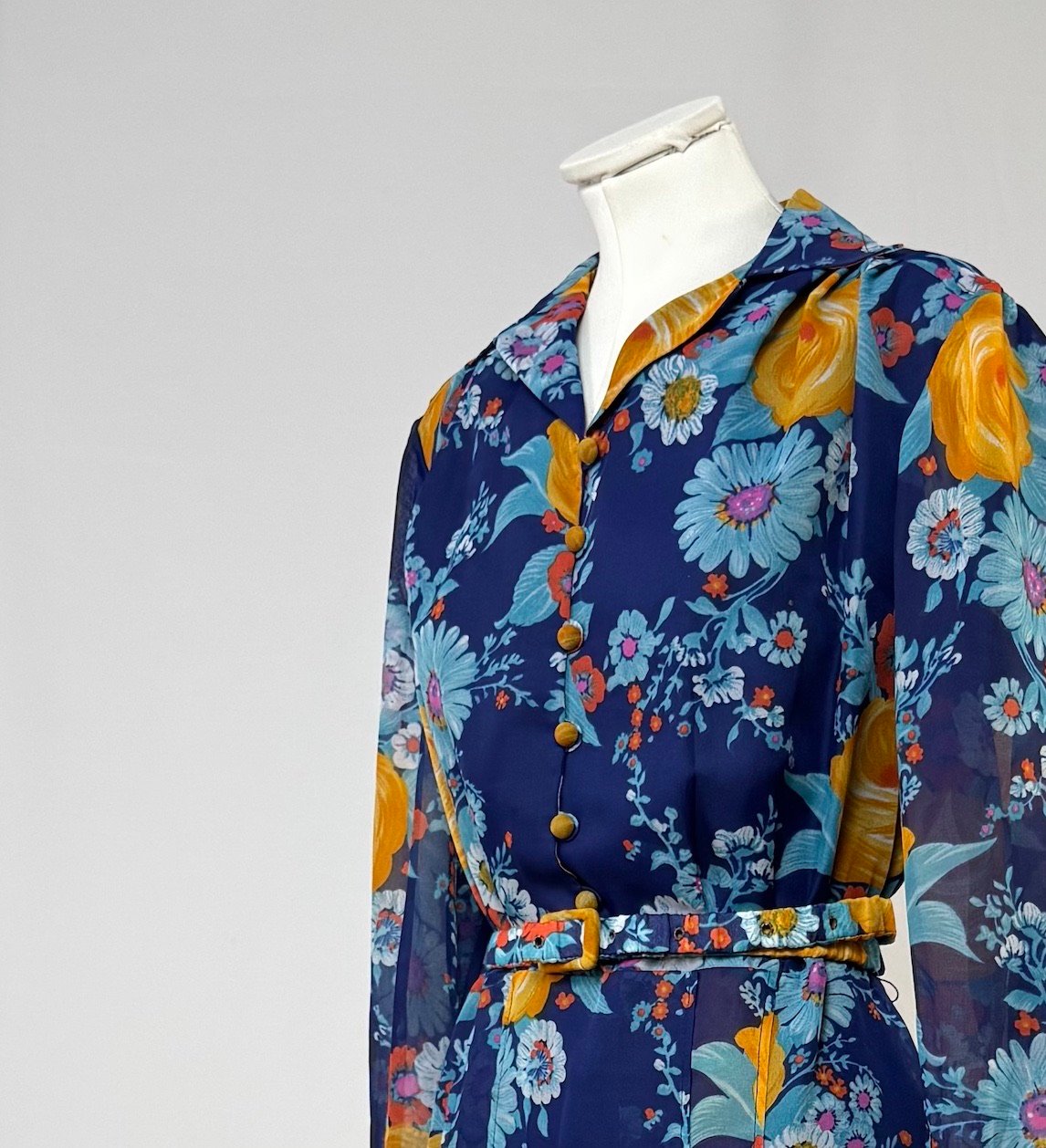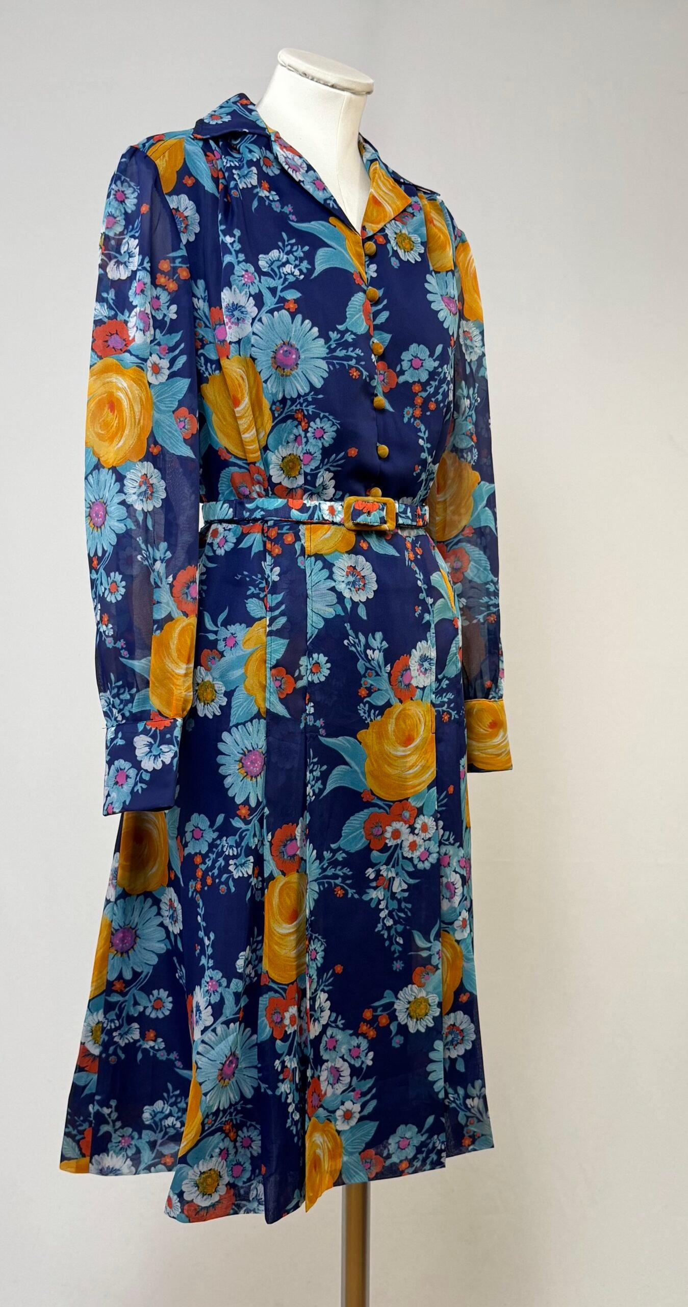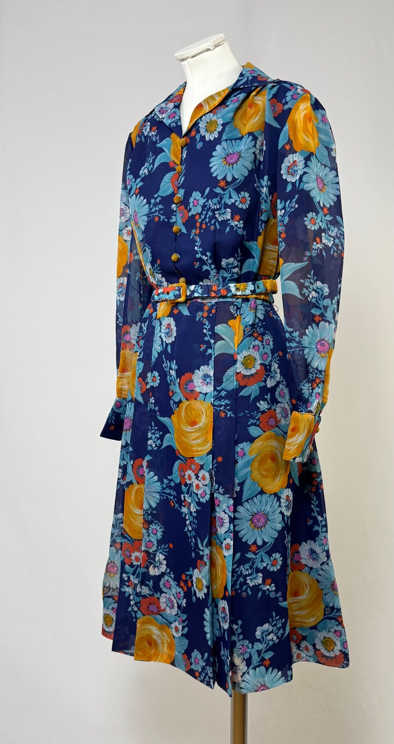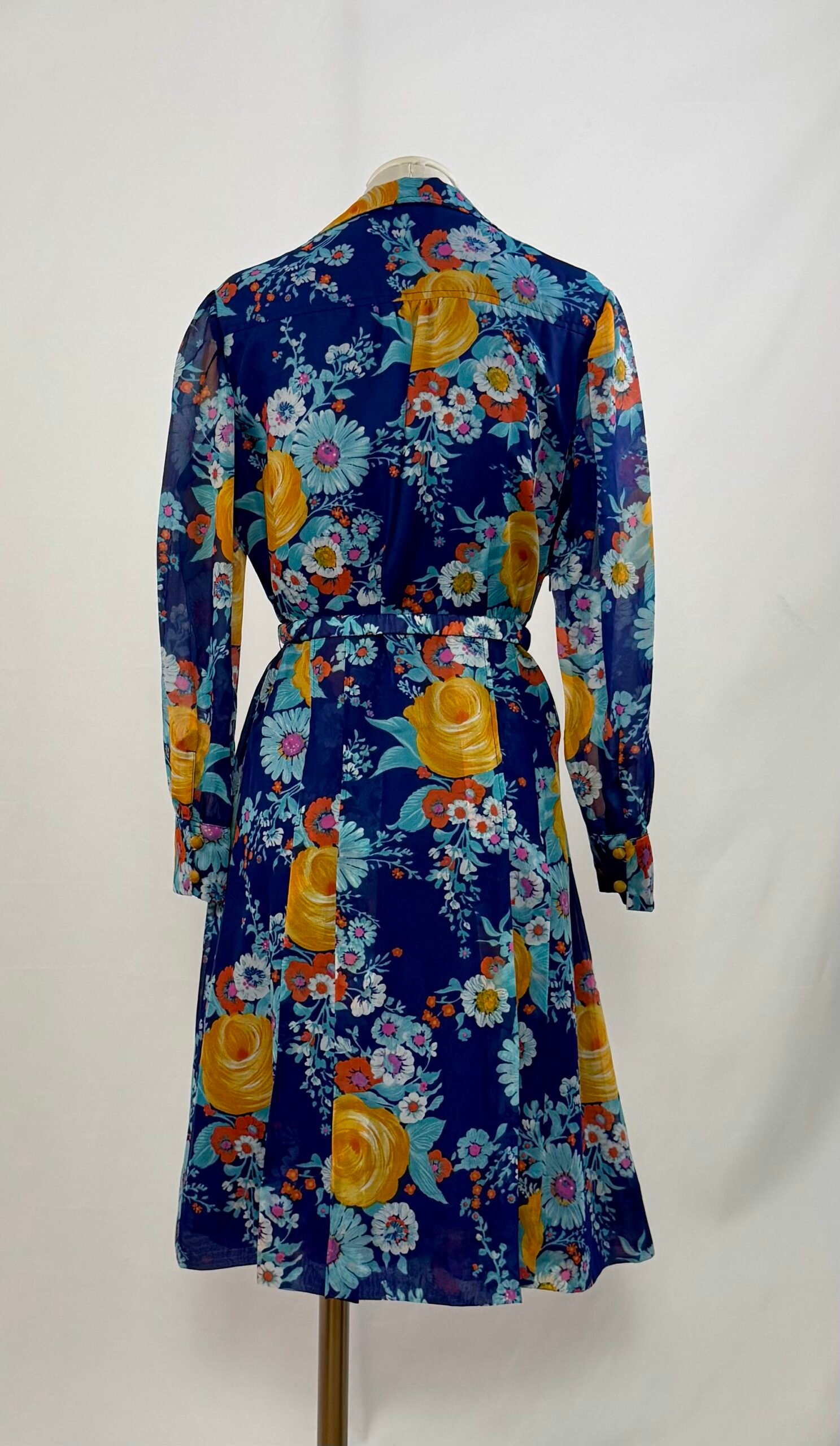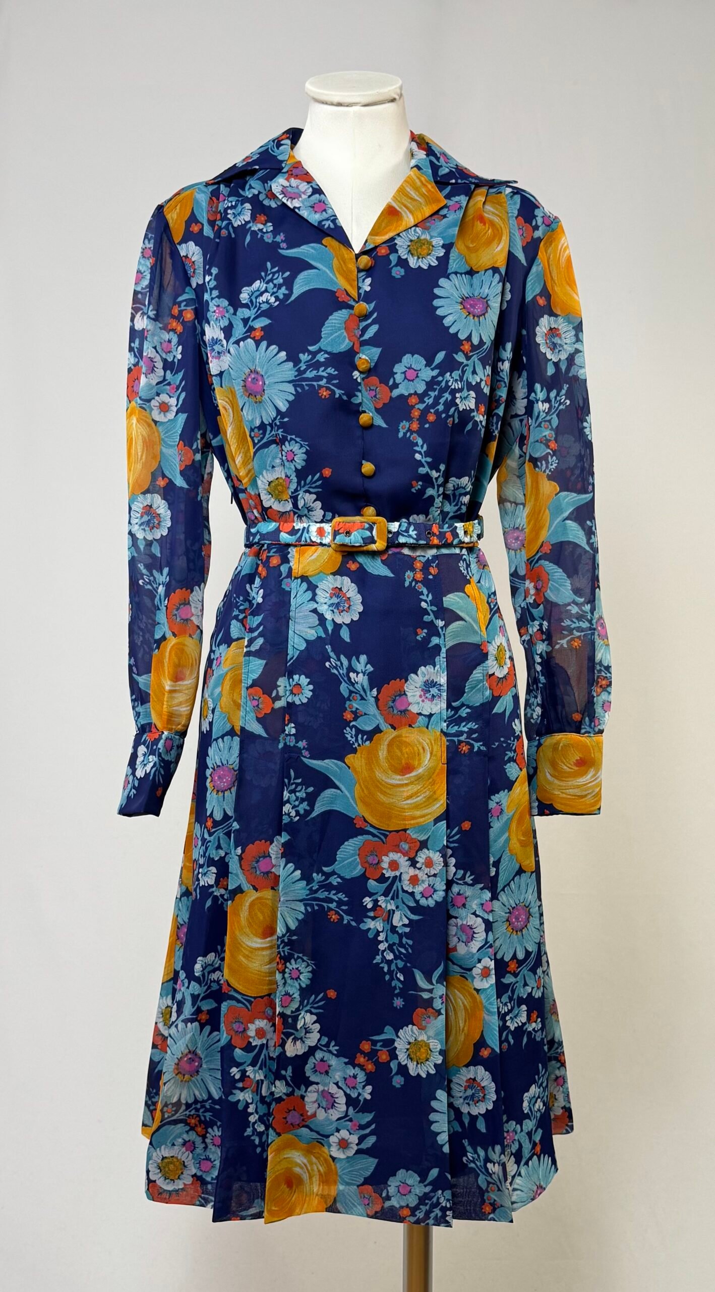 Vestido de los años 70 hecho a mano de manga larga cuello solapa, fondo azulón, estampado de margaritas y flores azul claro y naranja. Abotonado en el delantero, con botones forrados de la misma tela. Falda tableada. Incluye cinturón con la misma tela. Totalmente forrado menos las mangas, que se quedan un poco transparentes. Trebillas y cremallera en un costado.