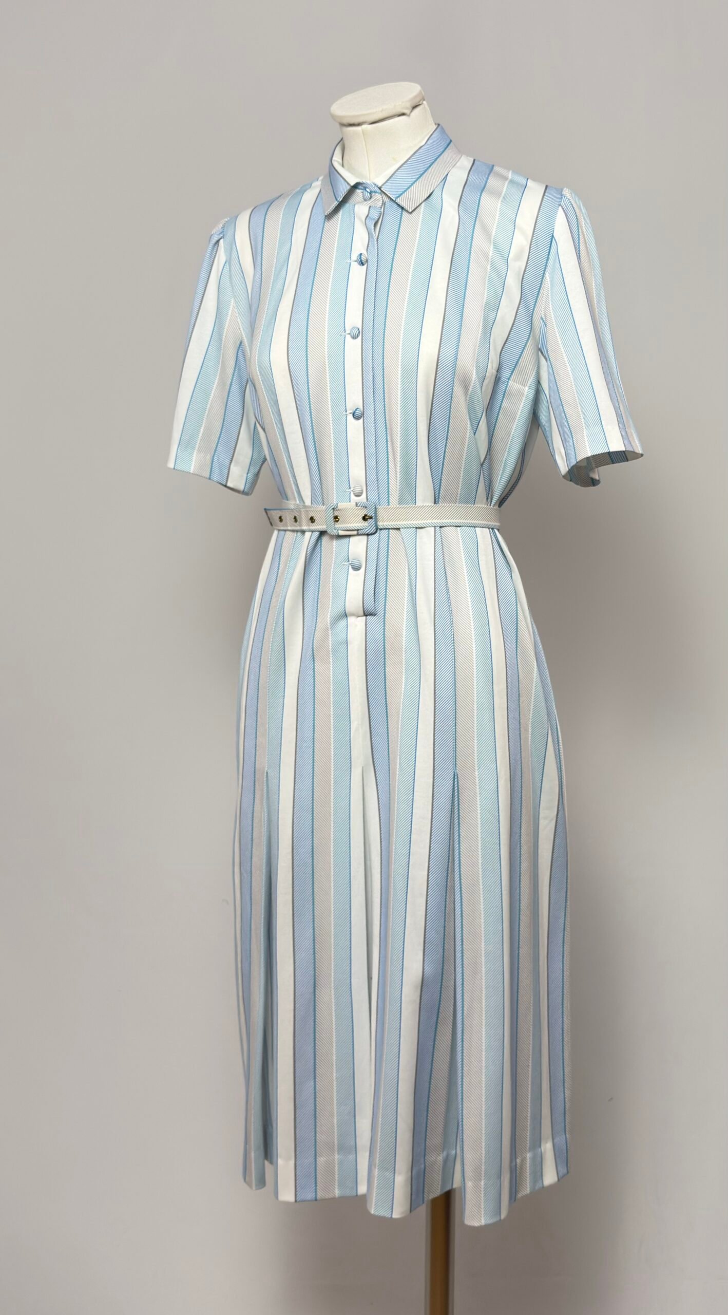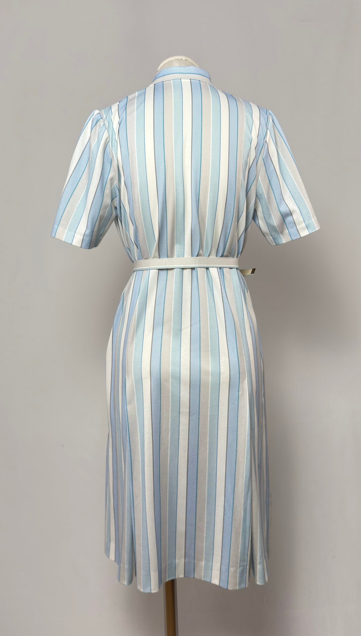 Vestido de punto de manga corta, cuello camisero, rayas azul claro y blanco, botones de la misma tela. Tablas grandes en la falda. Cinturón de la misma tel con hebilla.
