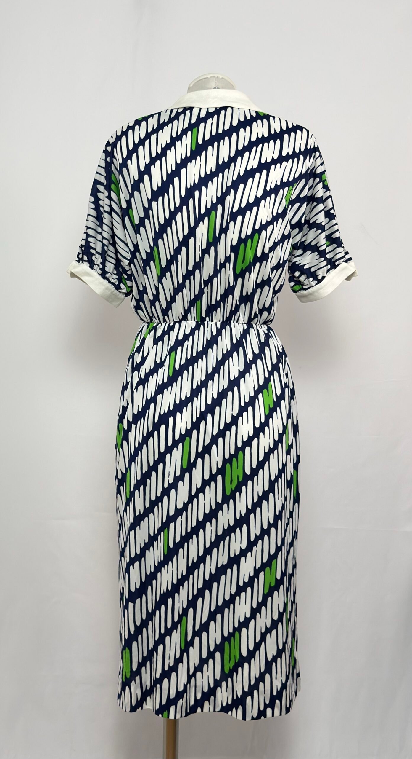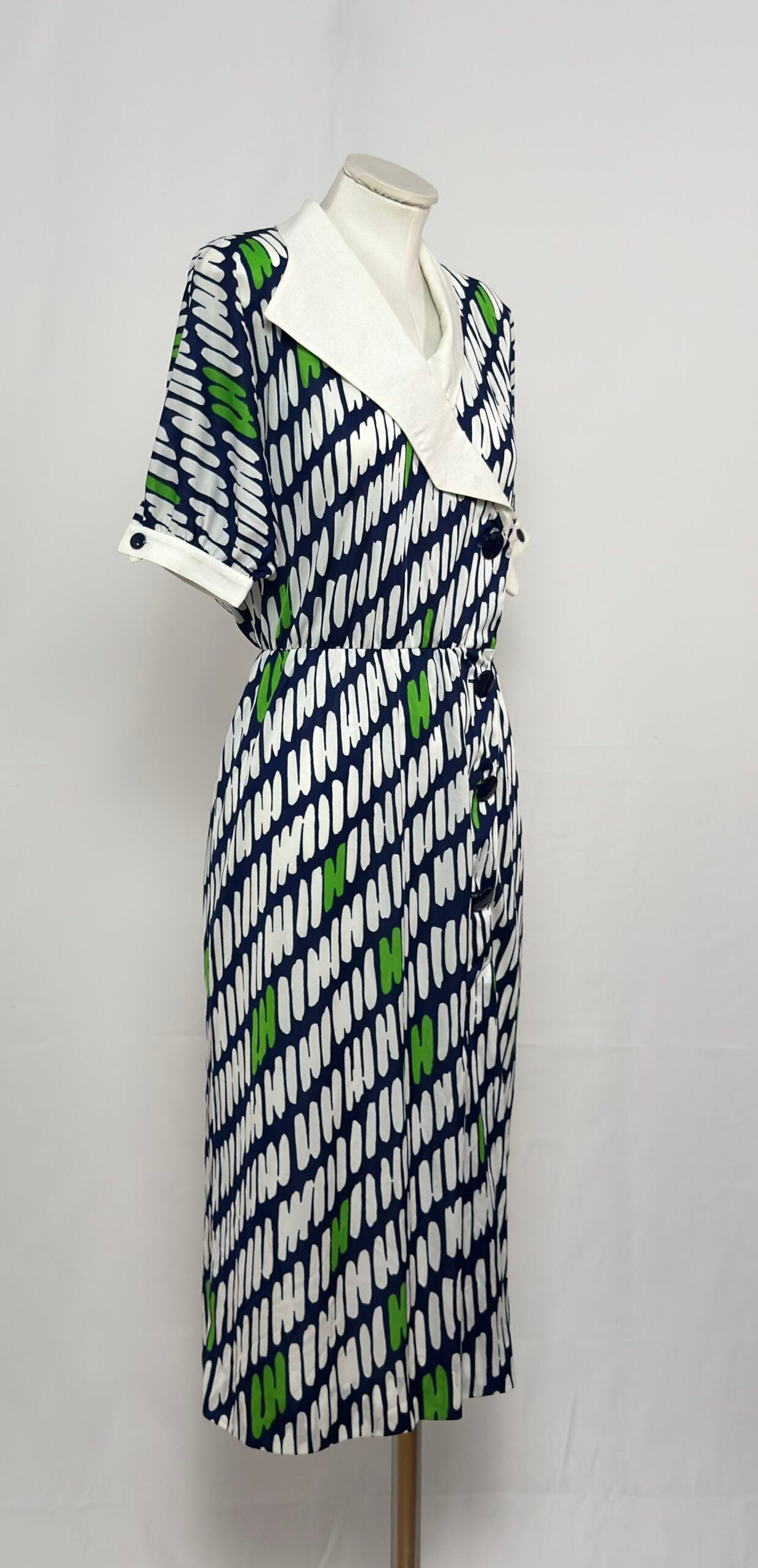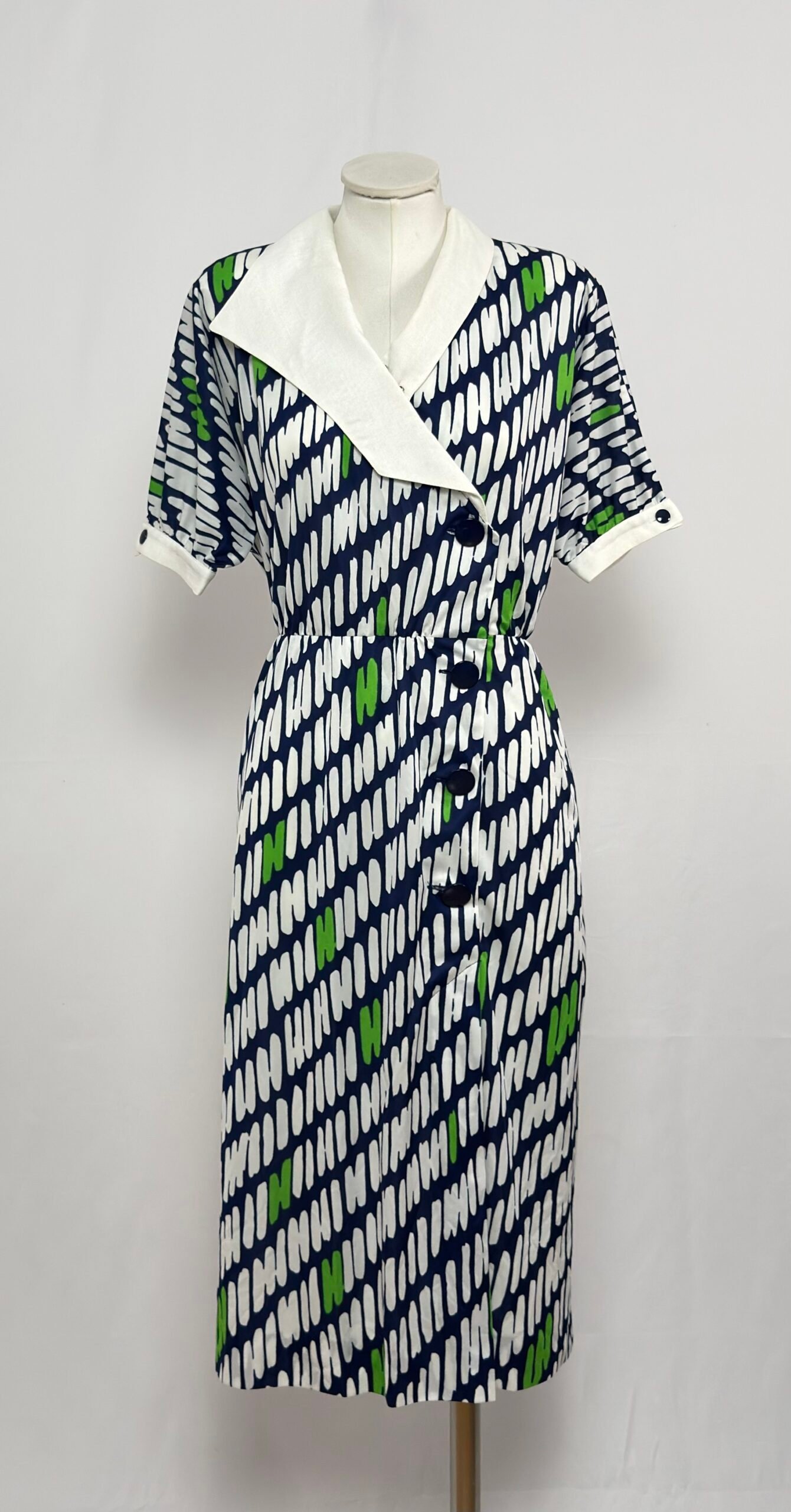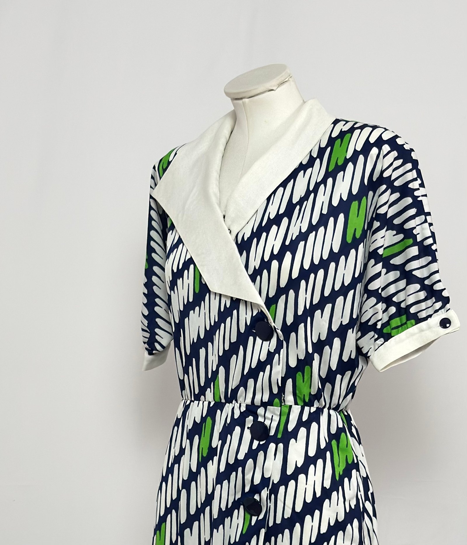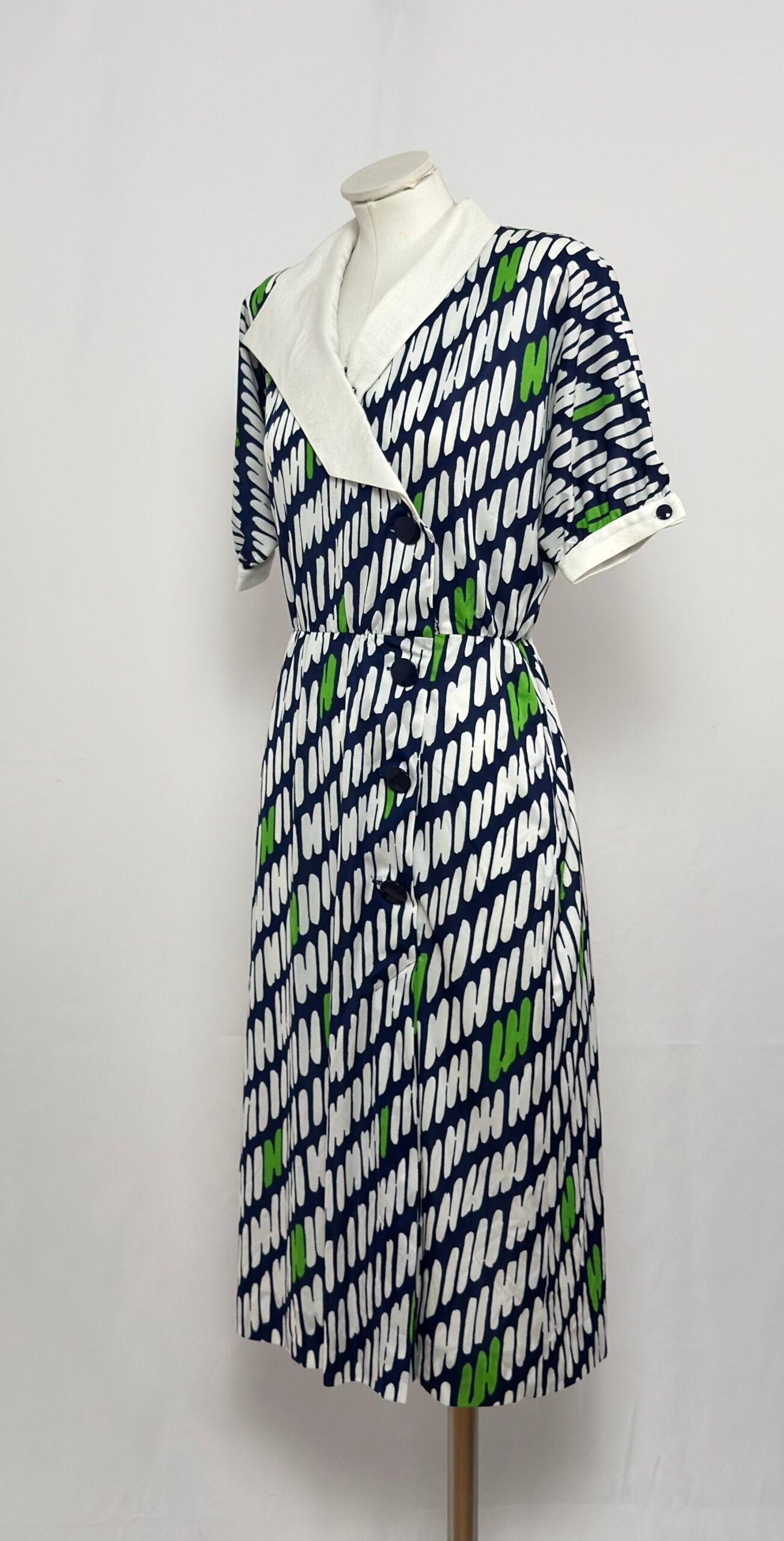 Vestido manga corta cuello solapa blanco, fondo azul marino y estampado blanco y verde. Manga murciélago. Cinturilla elástica. Abotonado por delante hasta mediafalda con grandes botones azul marino. Cierre en manga con botones del mismo color. Sin forro y con hombreras.