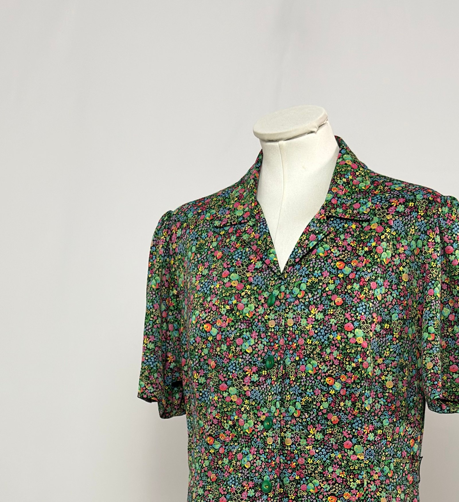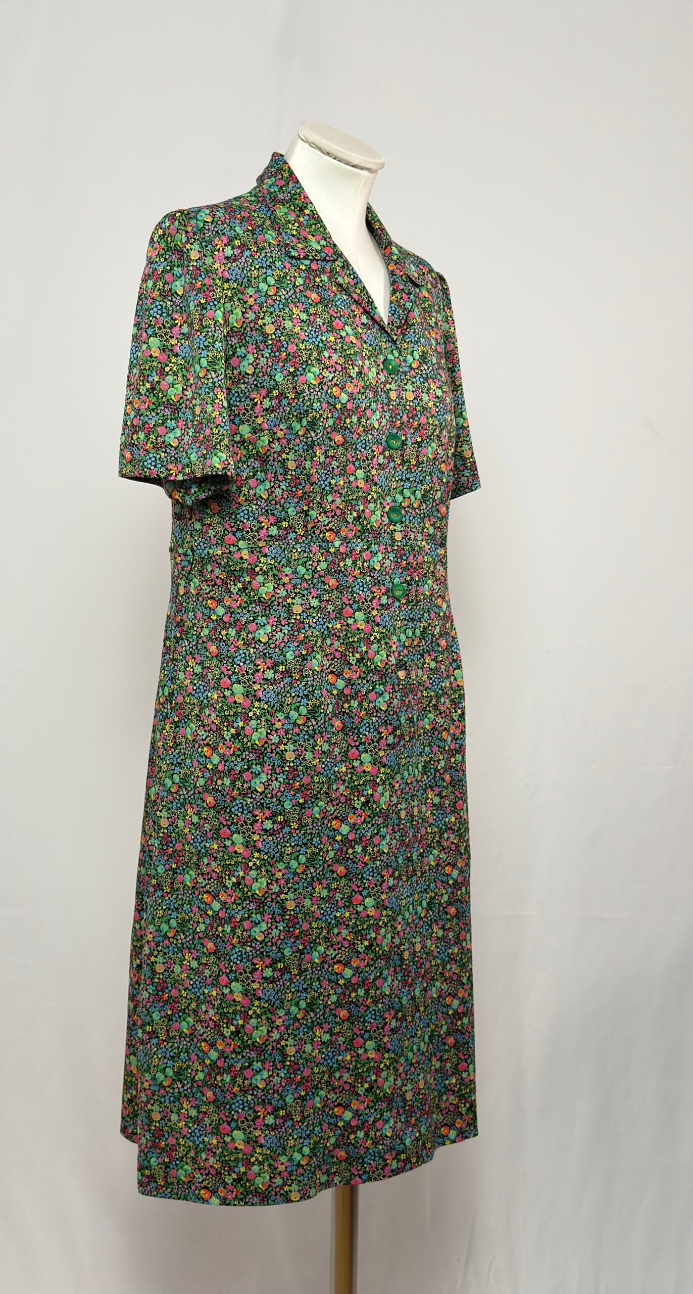 Vestido de manga corta, cuello solapa, estampada florecillas multicolor en predominancia verde y rosa. Abotonado en el cuerpo delantero con botones originales verdes. Falda tipo evasé. Tiene trebillas. Forro en verde en la falda, lleva hombreras pequeñas.