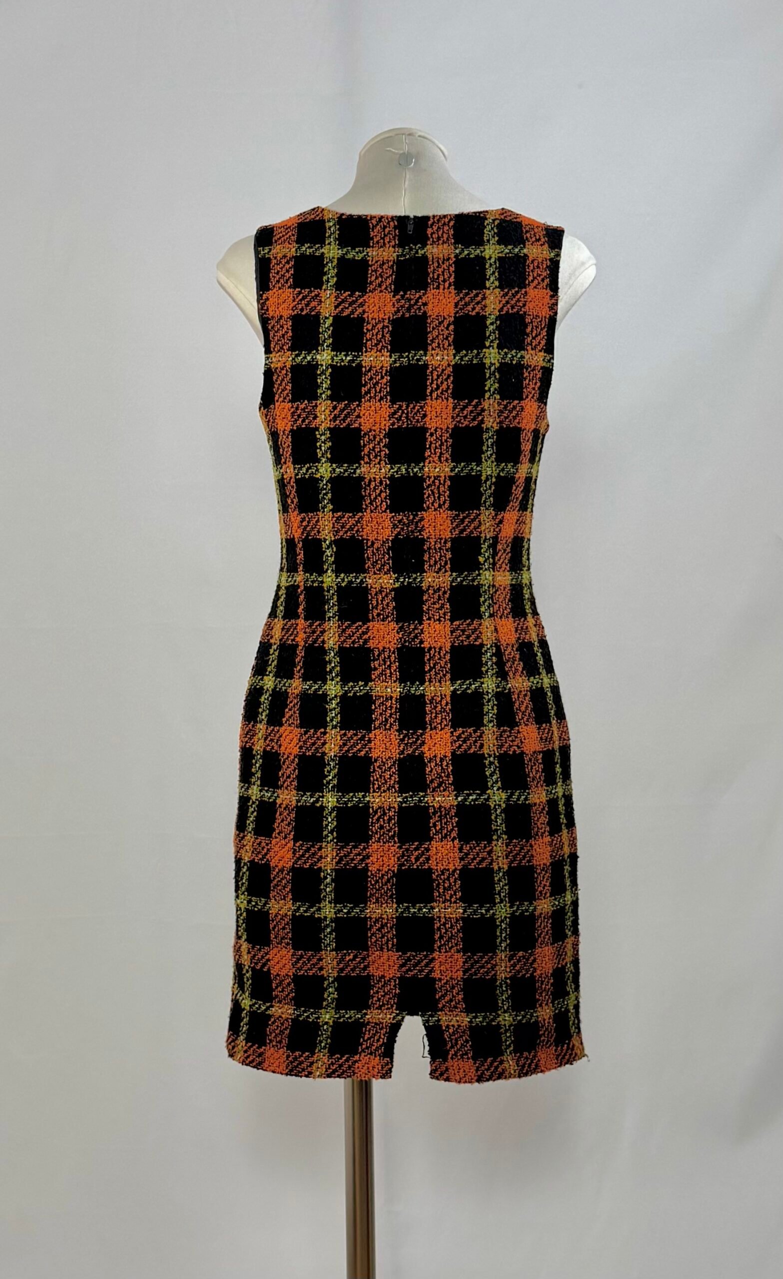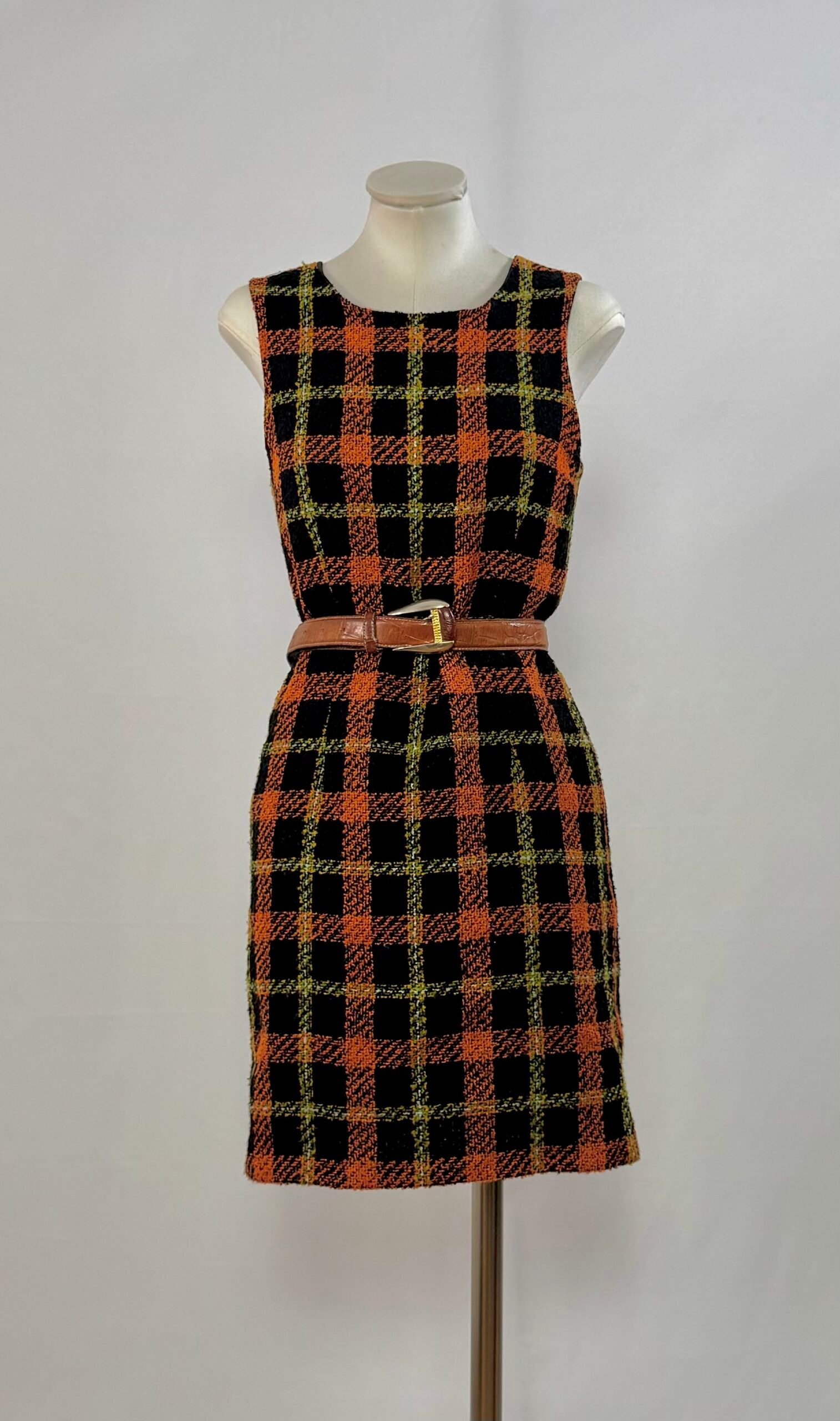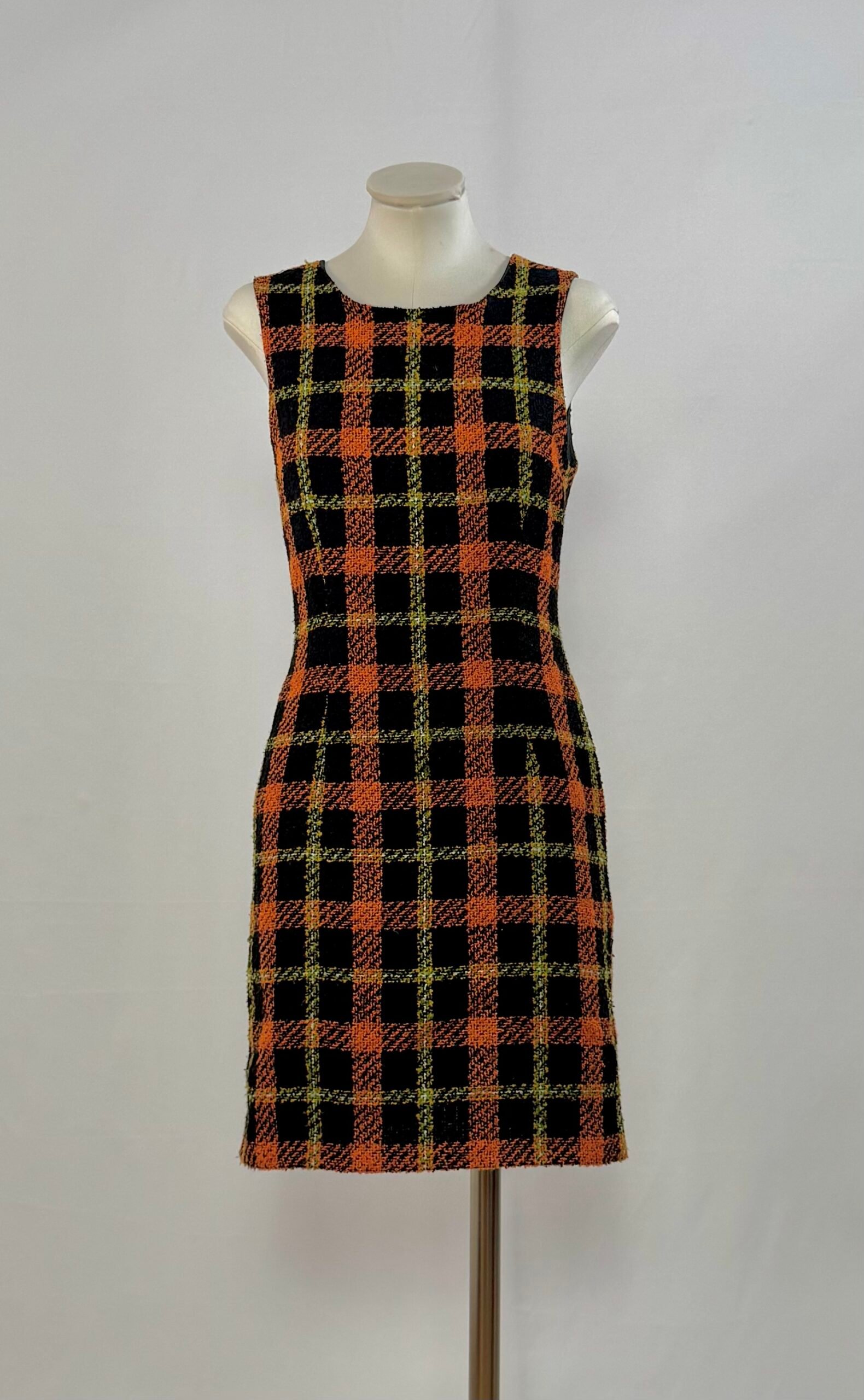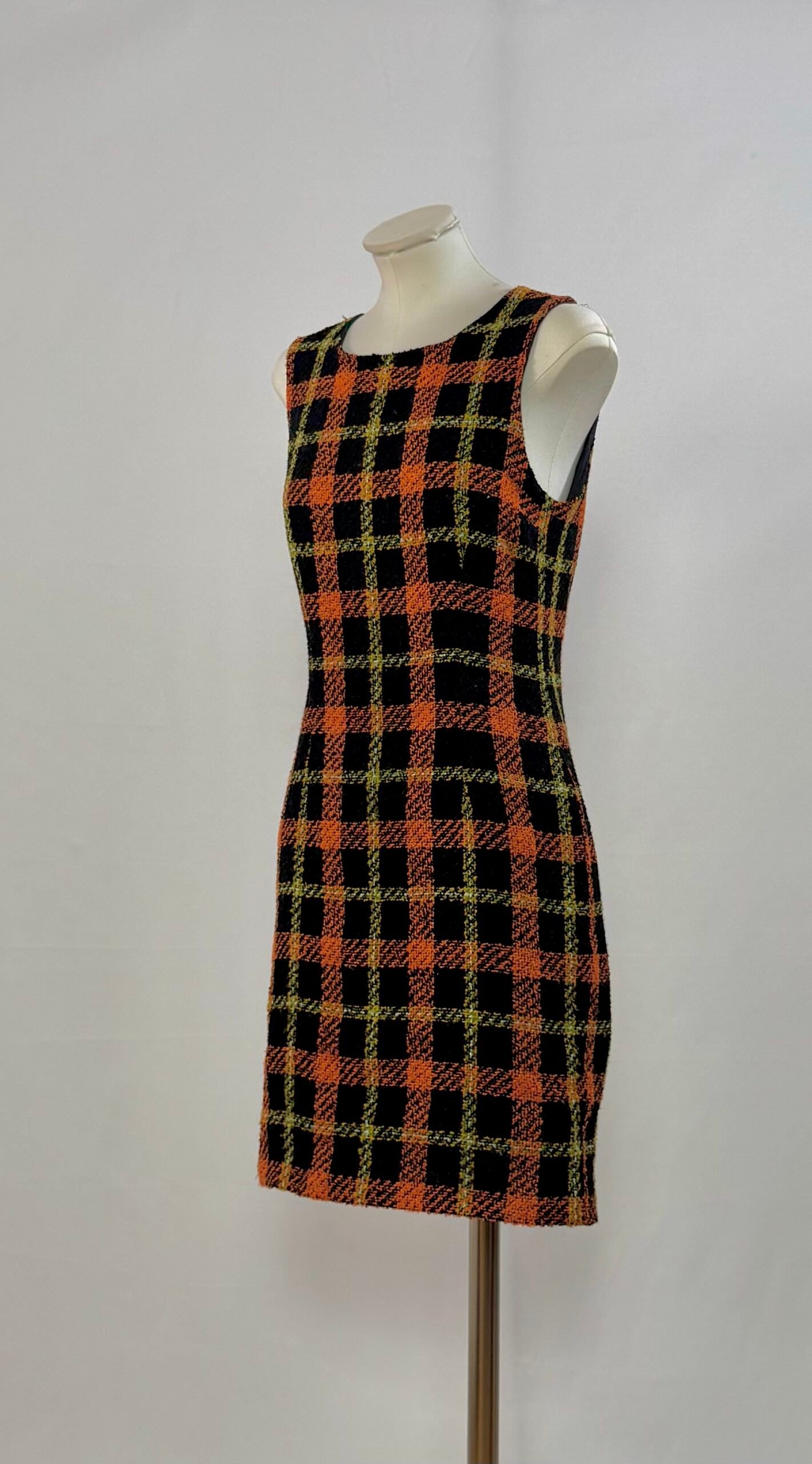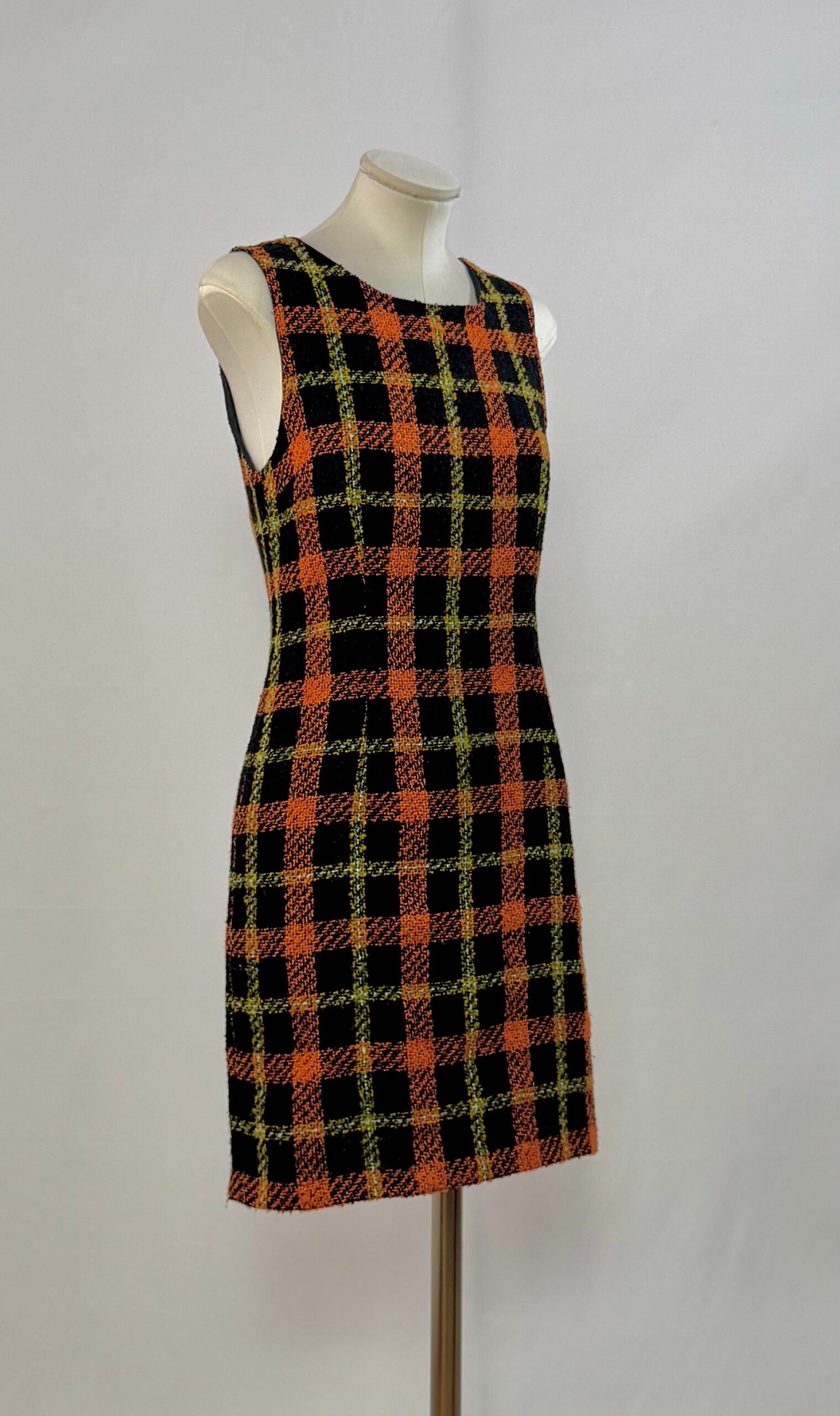 Vestido de manga la sisa, con cuadros naranja, negro y toques amarillos. Cierre trasero con cremallera y totalmente forrado. Es una pieza entallada, que queda ideal ciñéndola a la cintura con cinturón. Tejido cálido, ideal para el invierno.