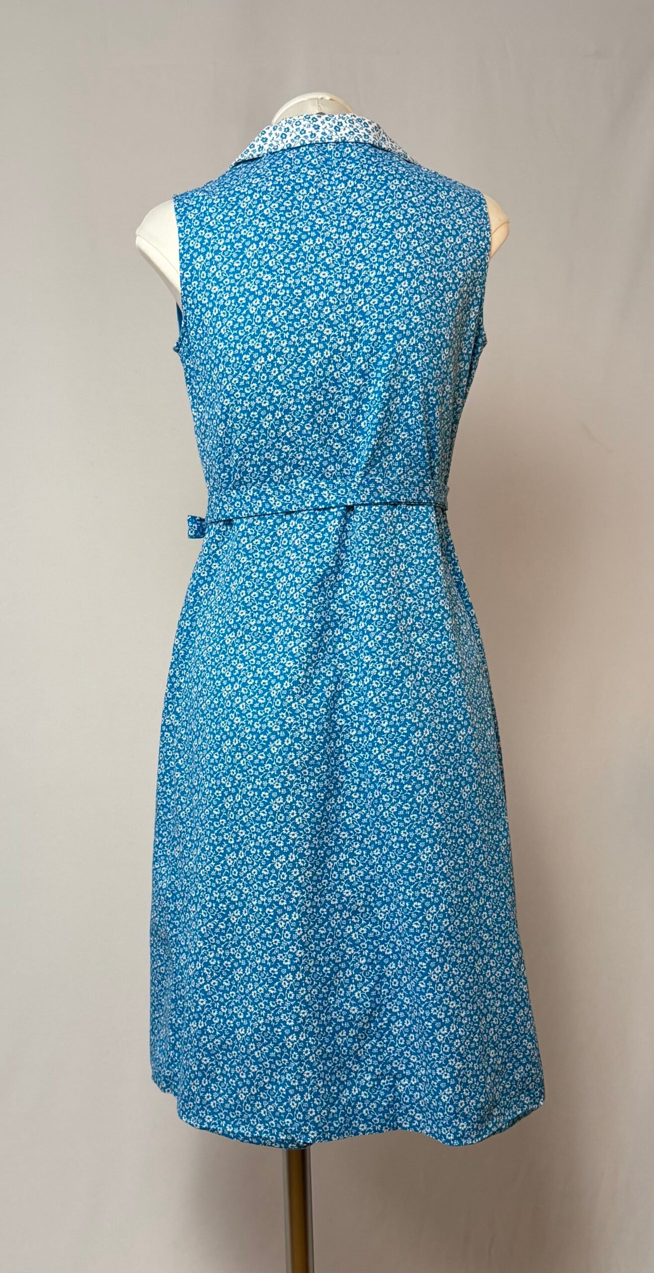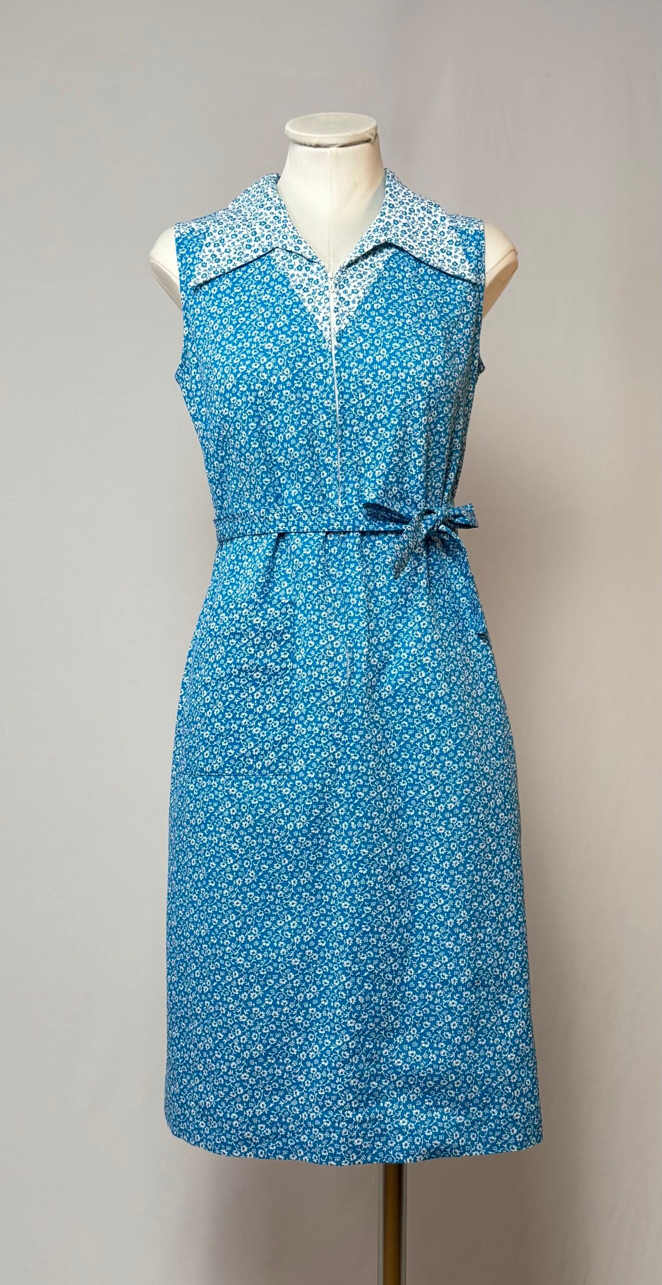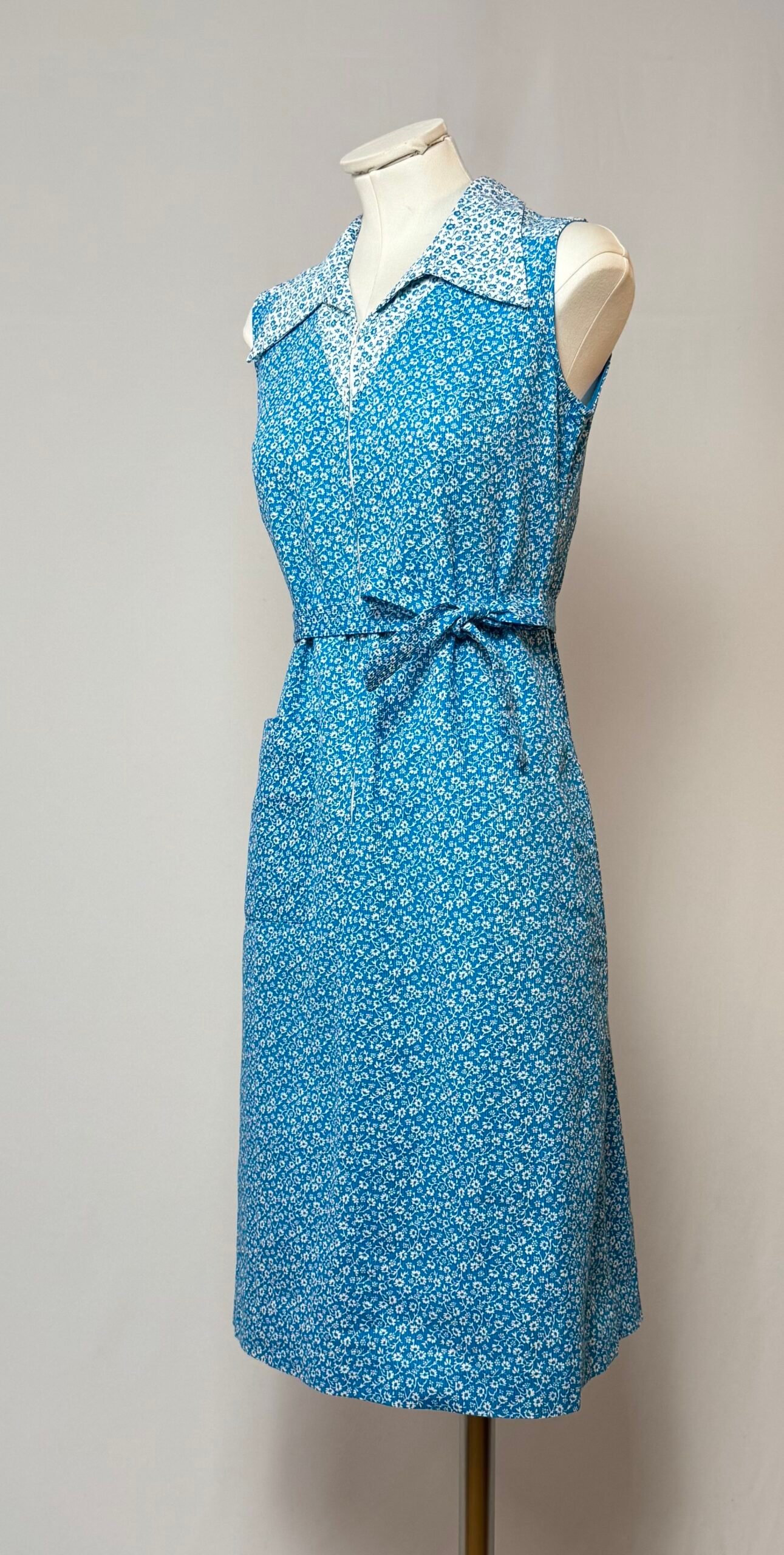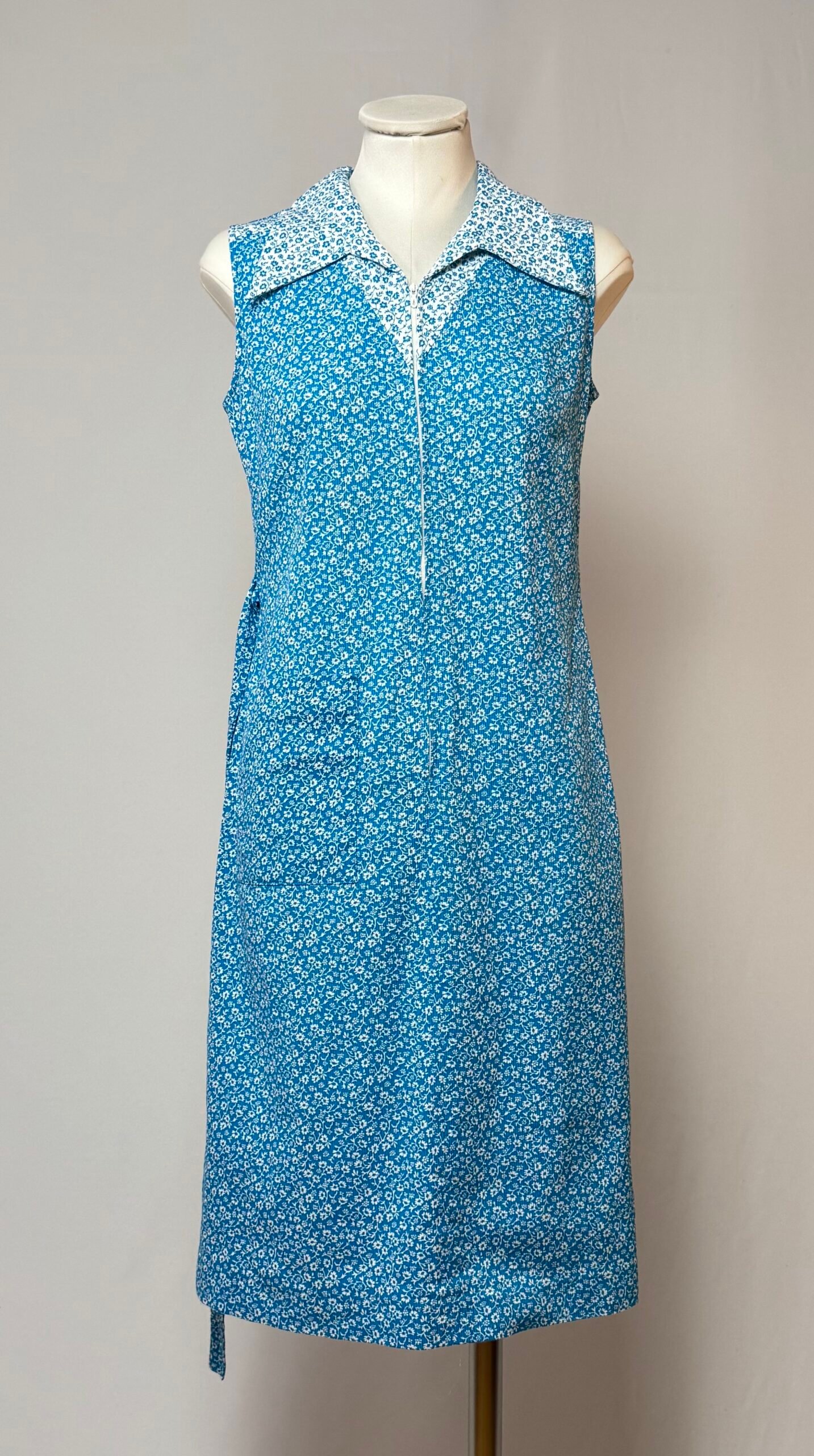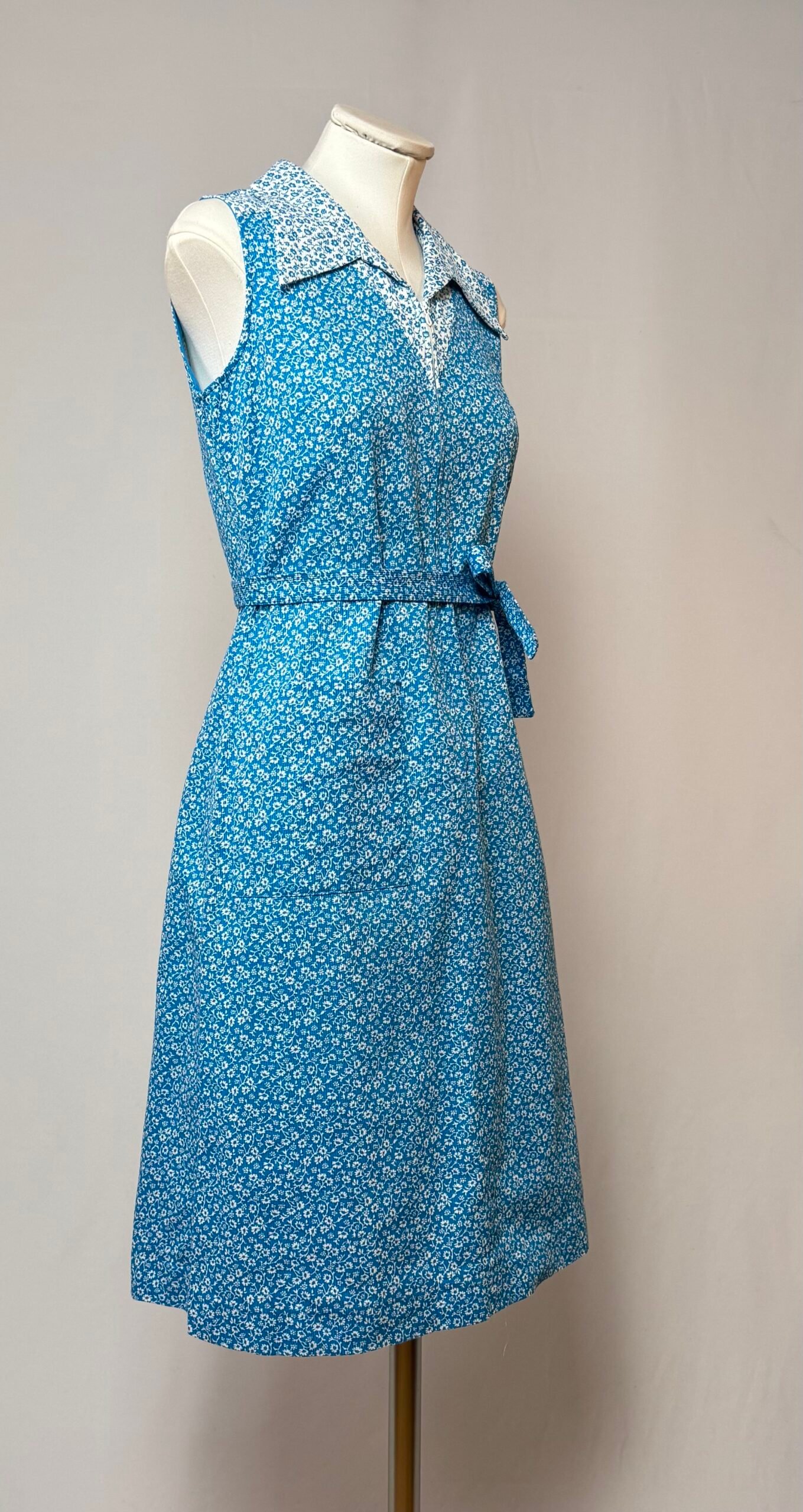 Vestido de manga la sisa, cuello solapa, azul celeste con estampado de flores blancas. Cierre frontal con cremallera, tiene un bolsillo de plastrón y cintura ceñida con cinturón de la misma tela. Sin forro, no transparenta.