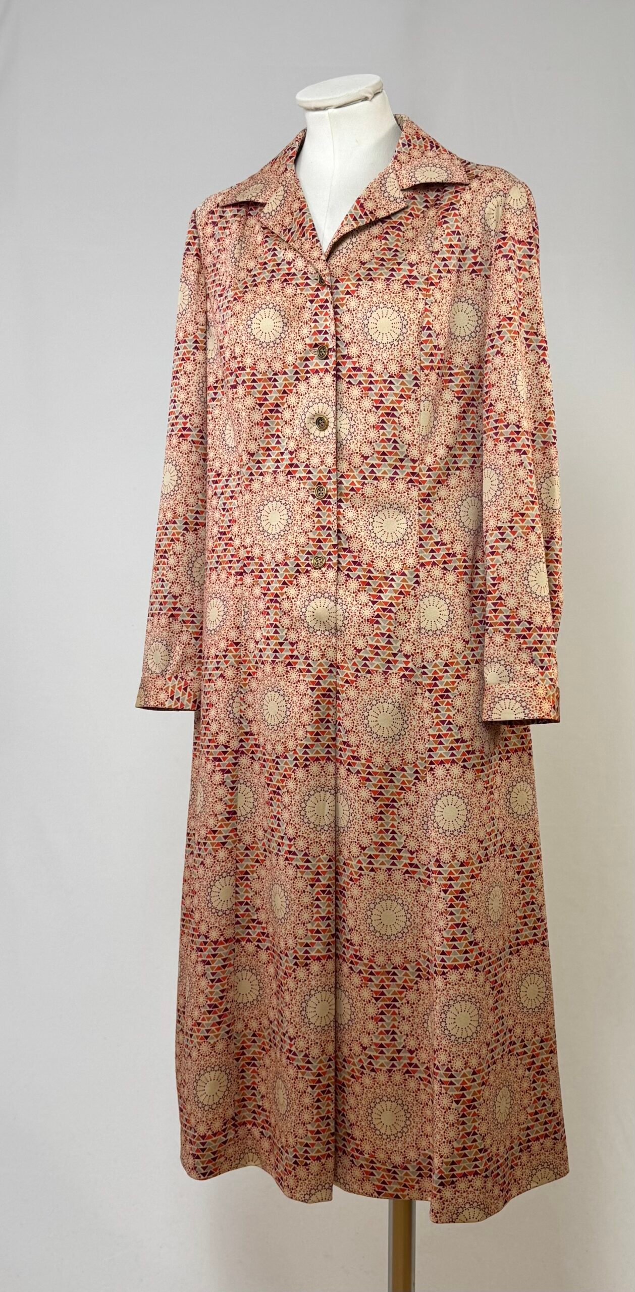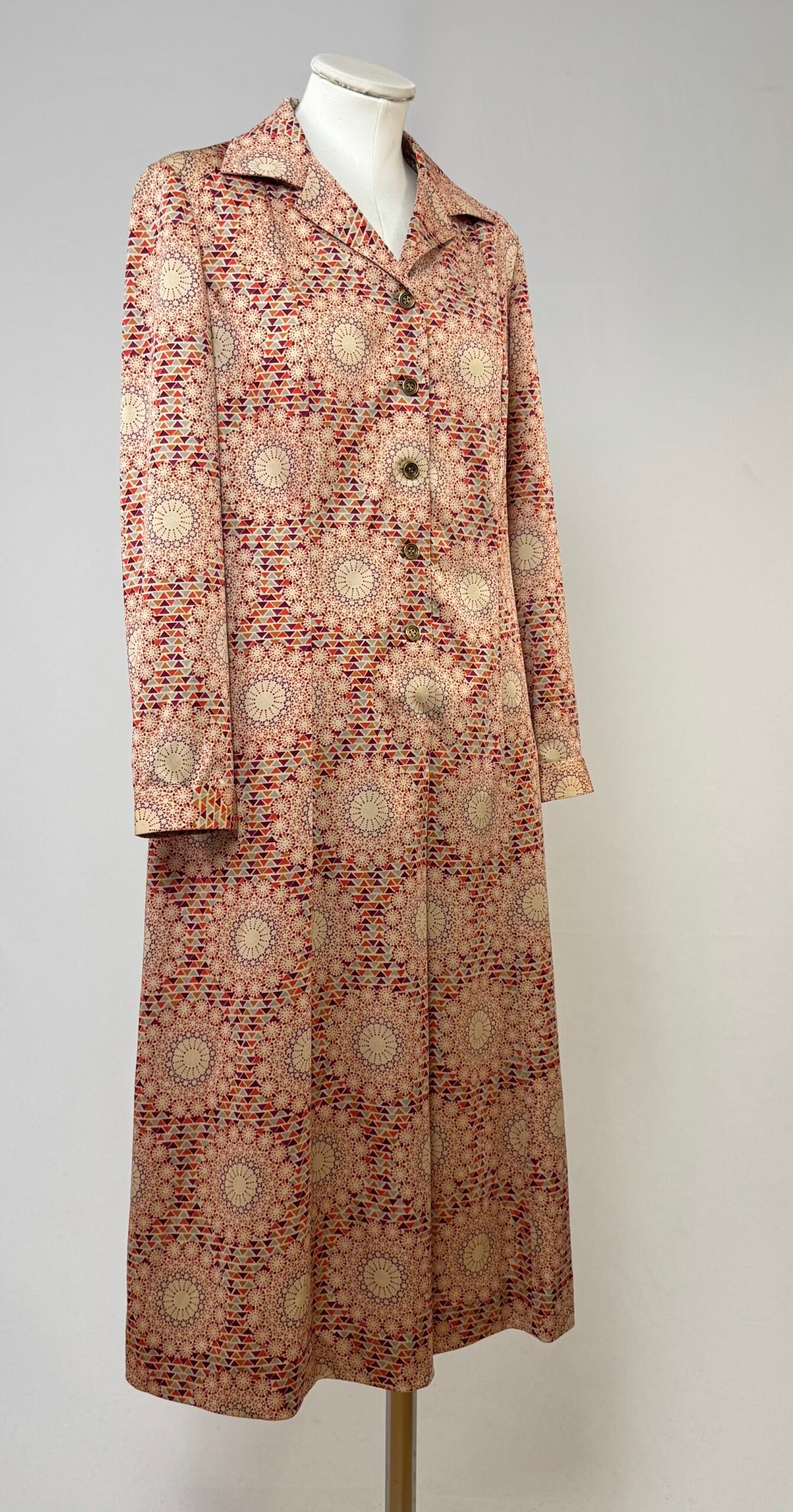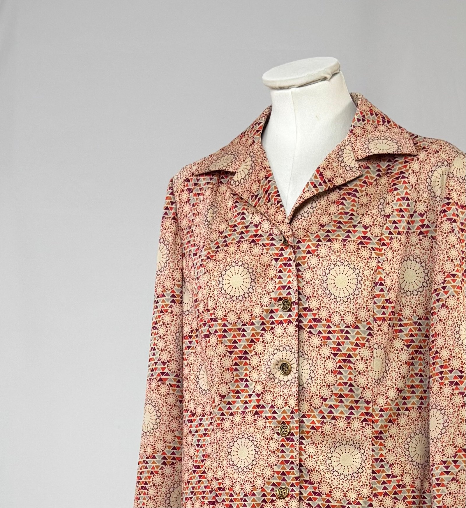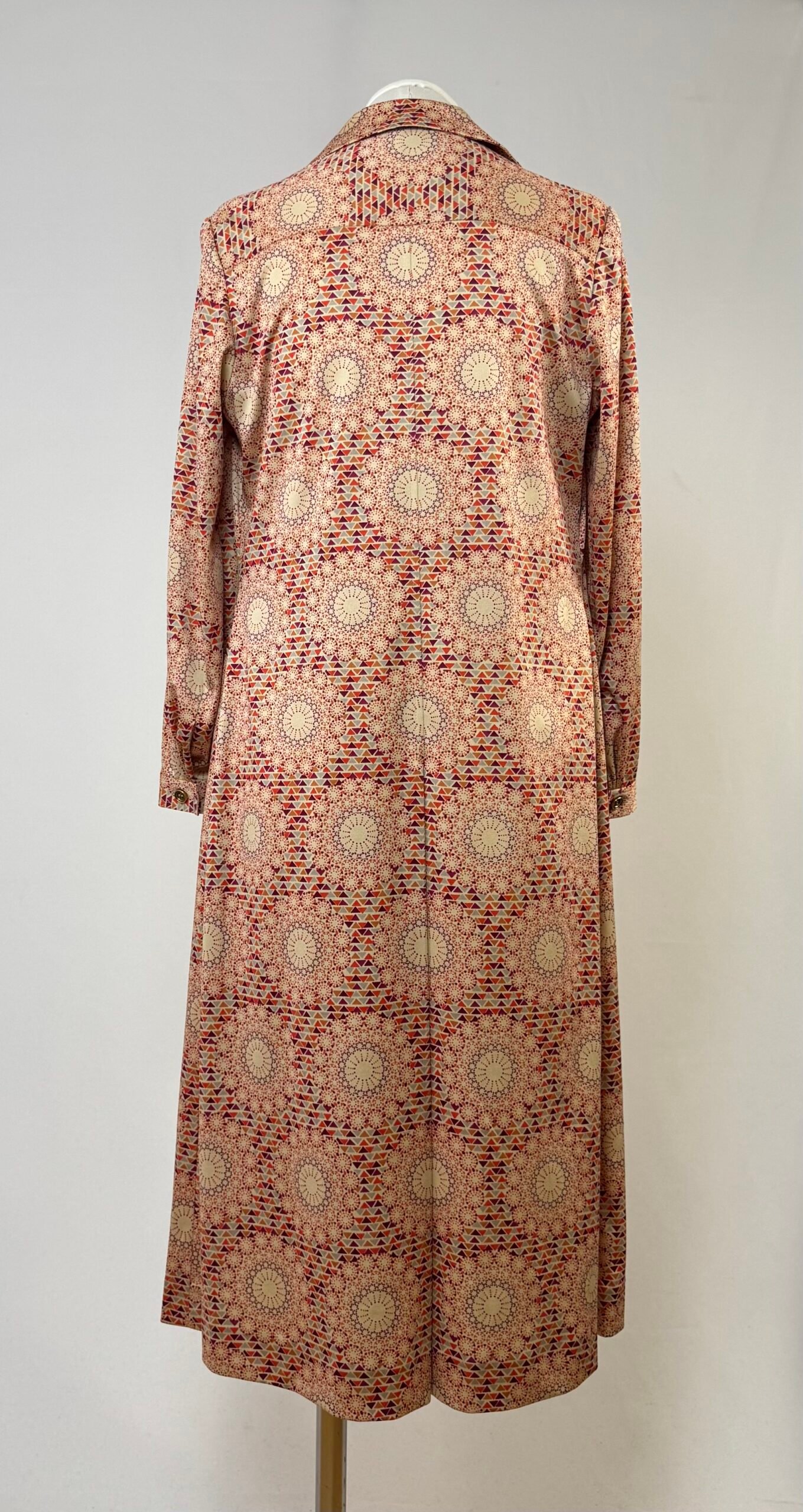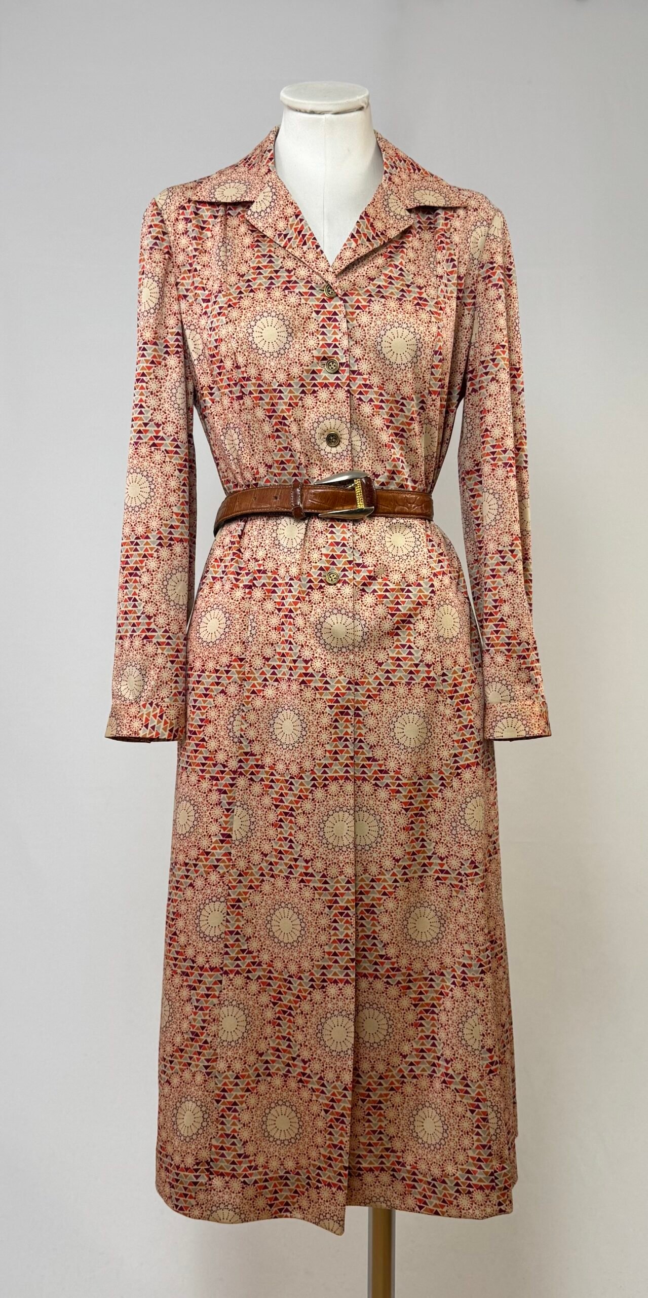 Vestido manga larga, cuello solapa, estampado en rojo y burdeo con puntos y triángulos. Abotonado en el cuerpo delantero con botones originales dorados, al igual que en los puños. Falda evasé con pliegue. Sin forro, pero no transparenta. Lleva trebillas para cinturón.