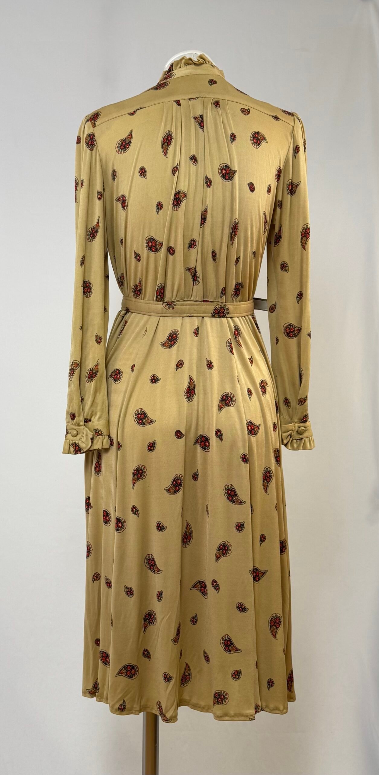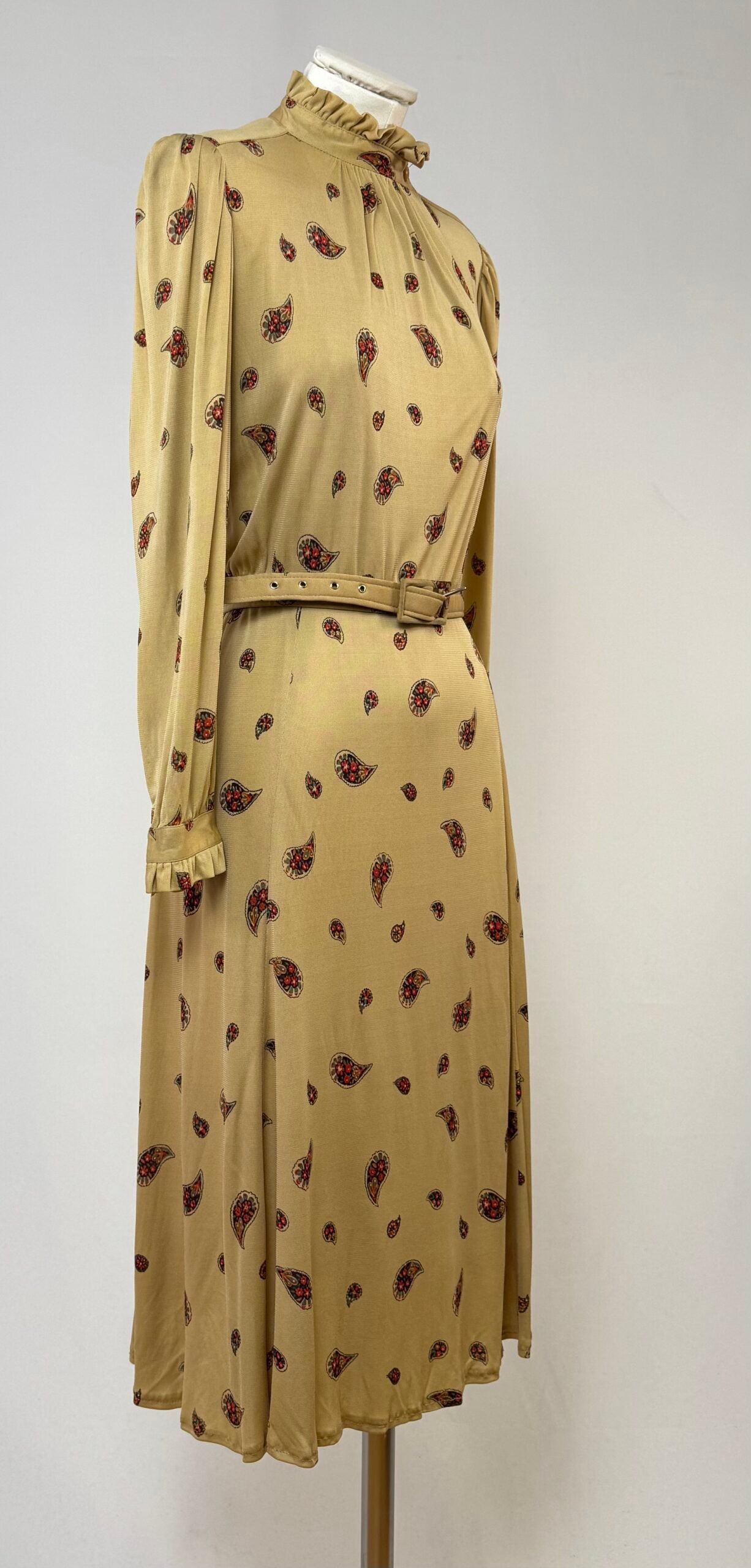 Vestido manga larga color moca estampado tipo cashemira, con cuello cisne con detalle fruncido tanto en cuello como en puños. Cierre lateral en el pecho con botón en la tirilla. Botones originales en cuello y puños del mismo color. Falda de vuelo. Cinturón de la misma tela. Sin forro y con hombreras.