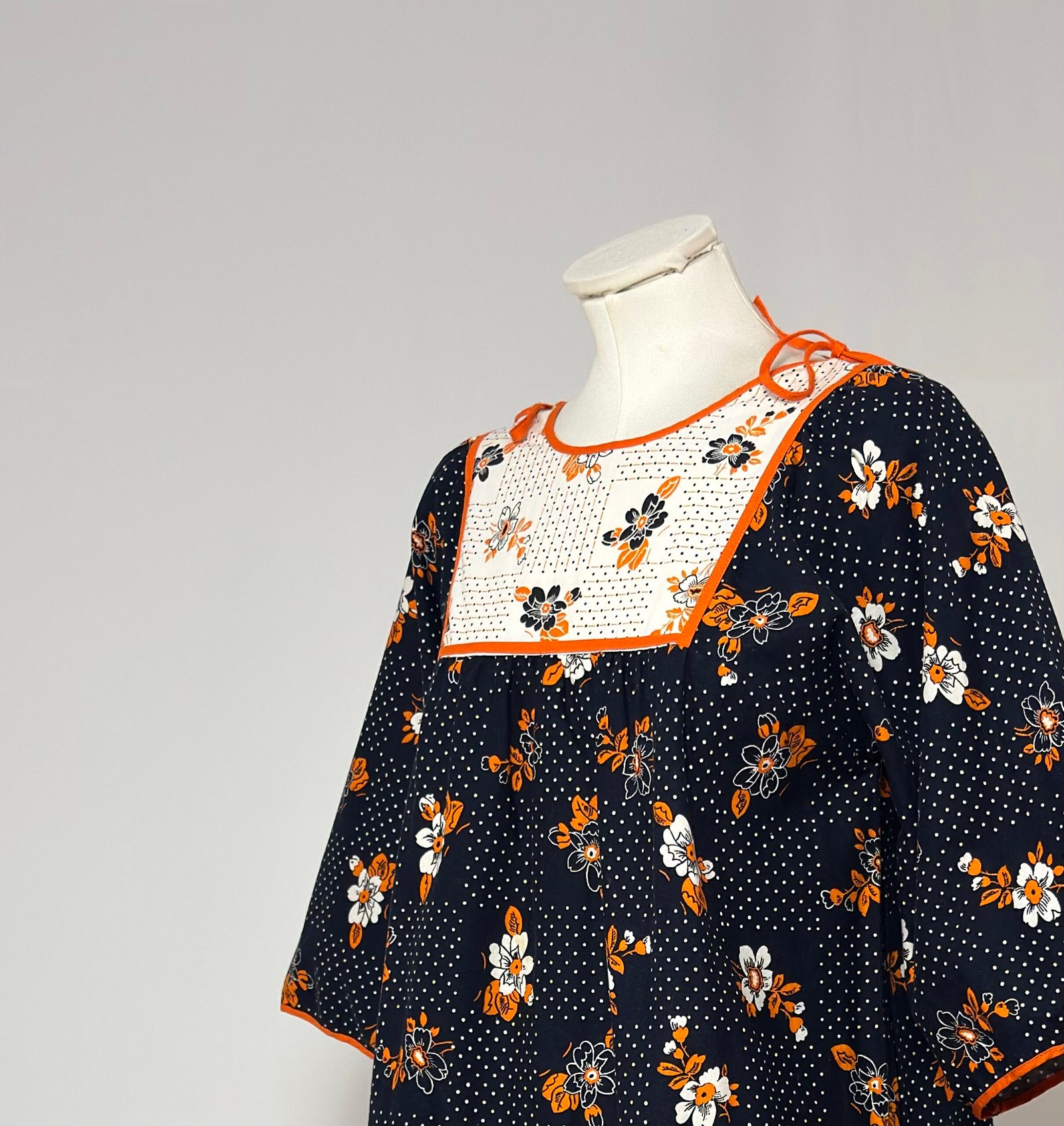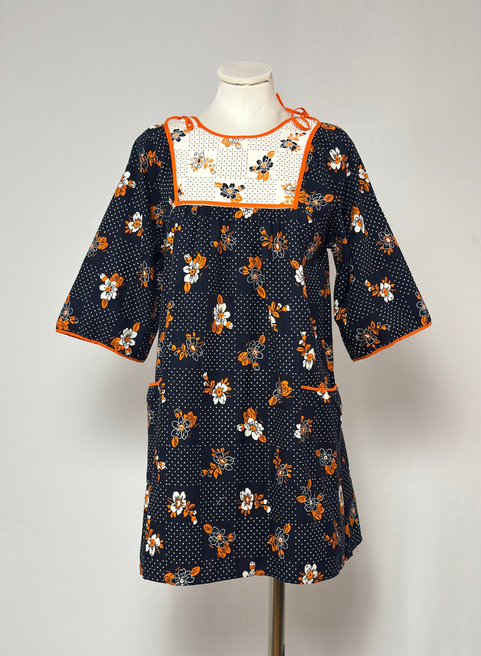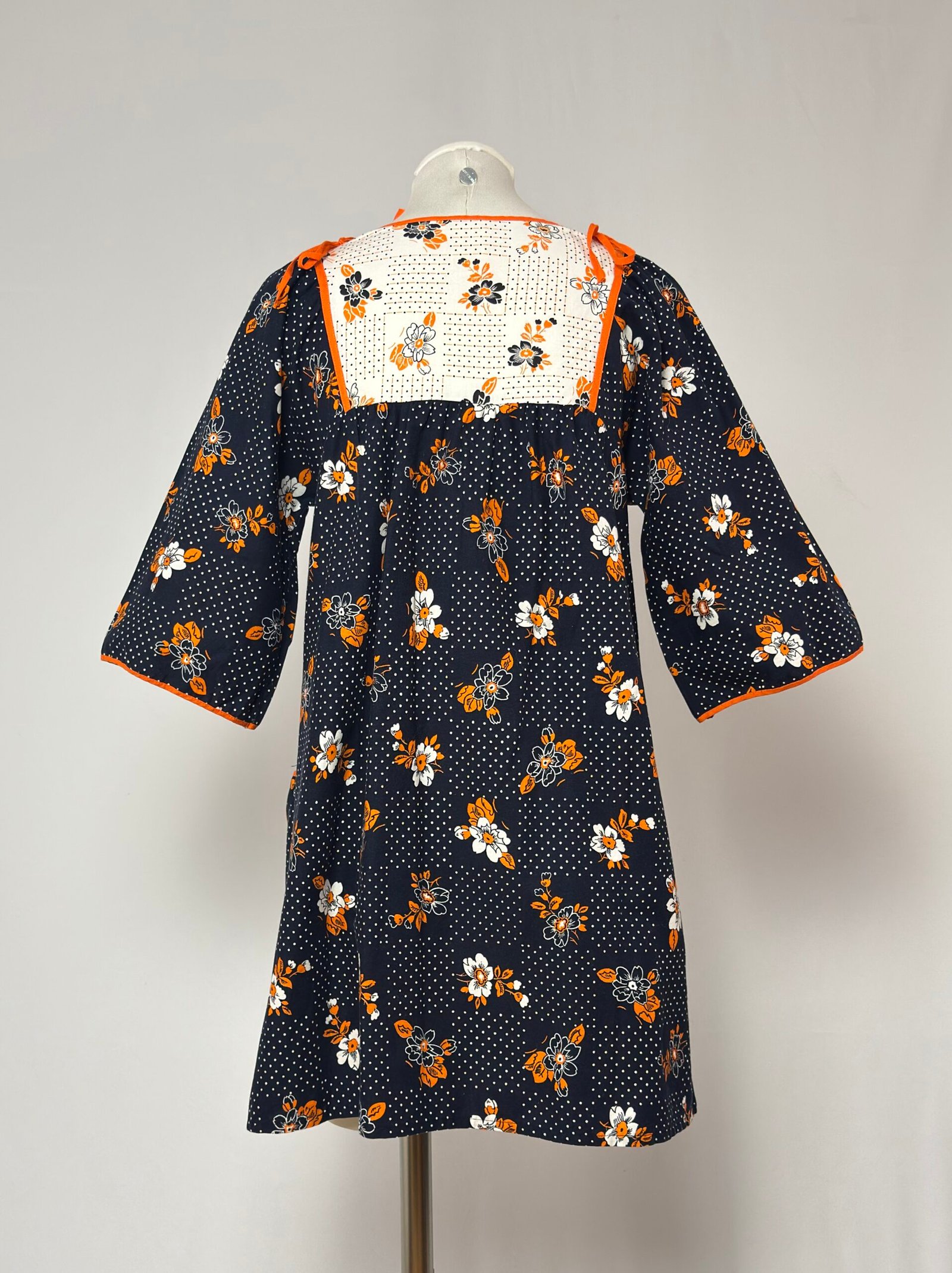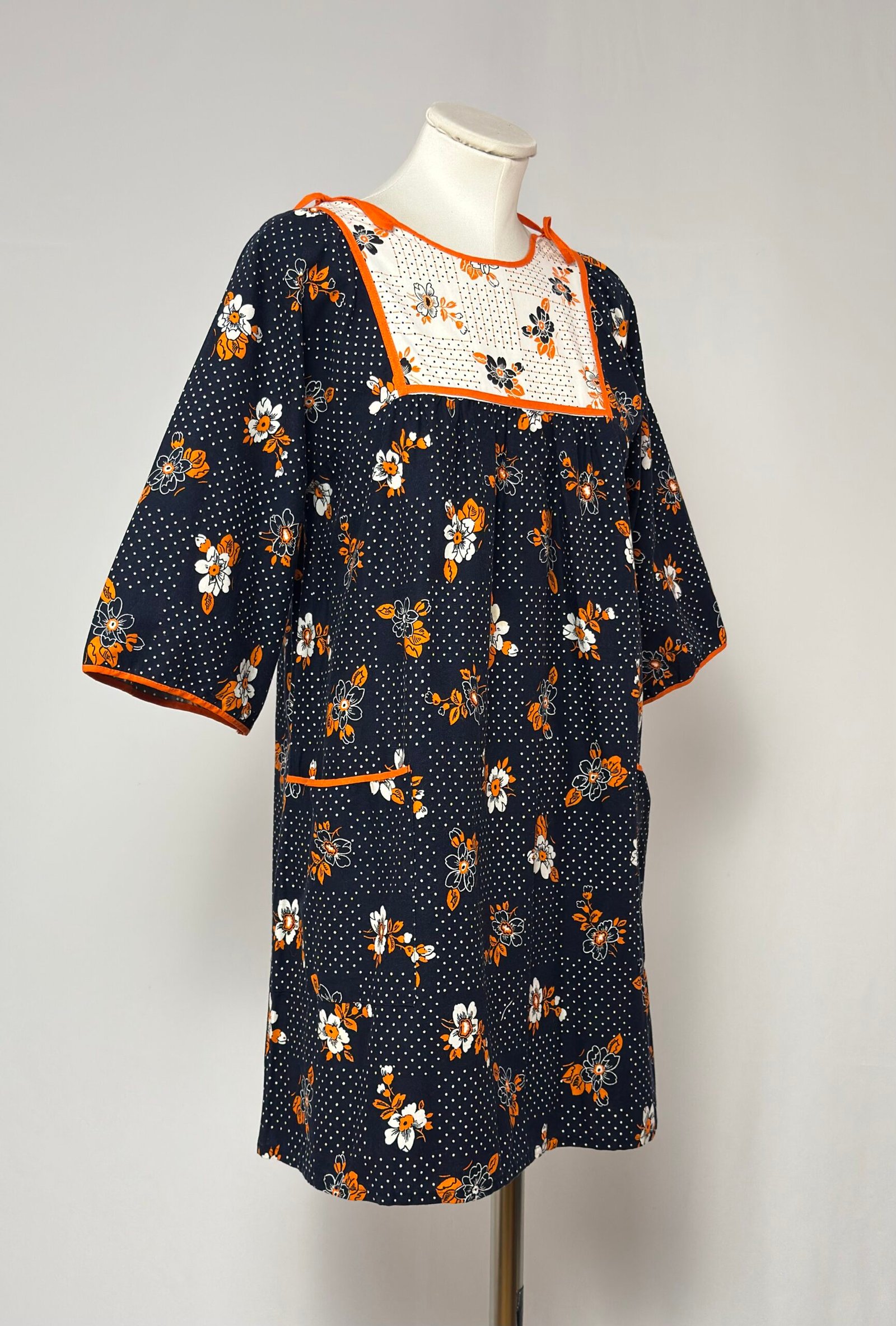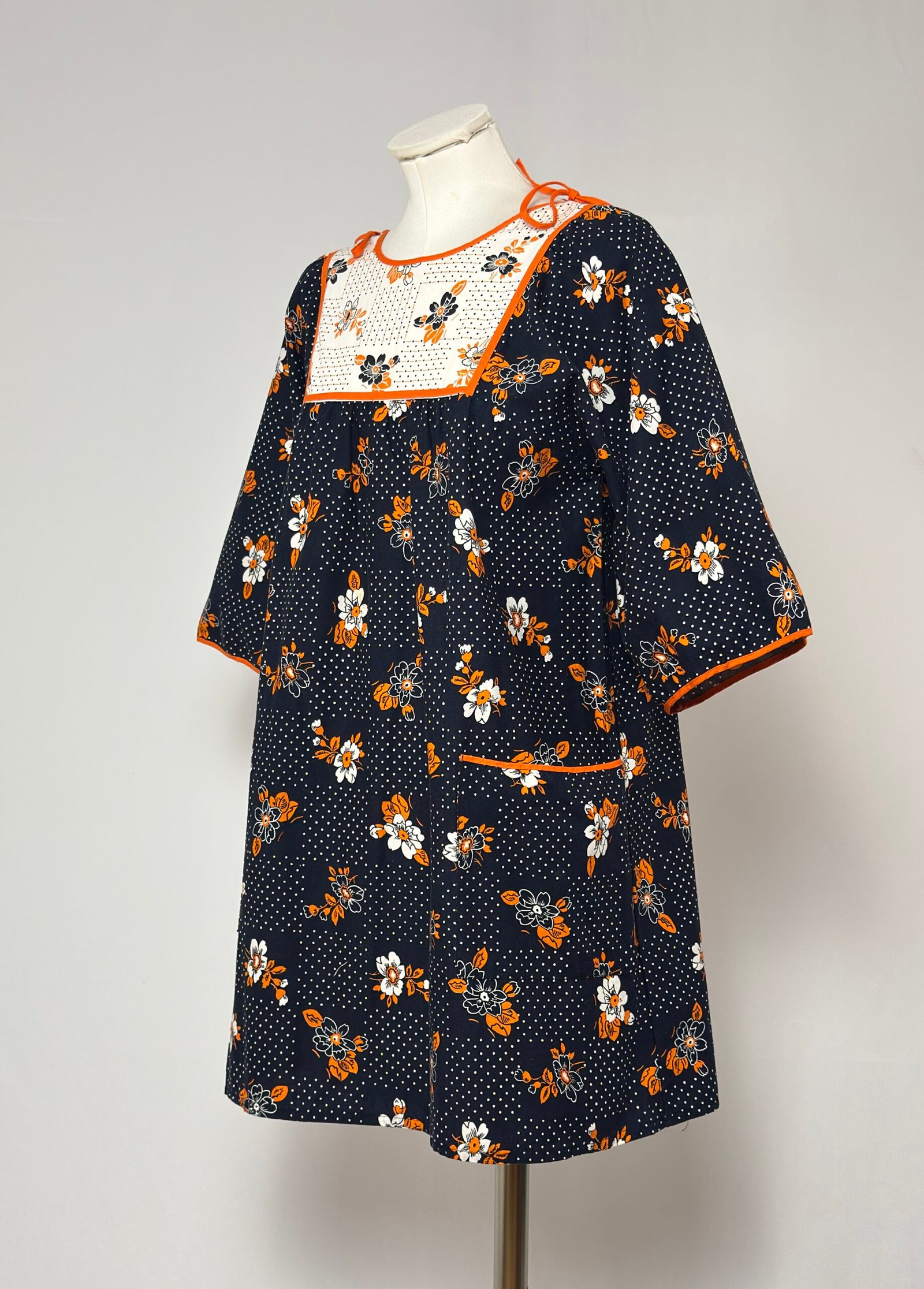 Vestido delantal manga al codo, fondo azul marino con estampado de puntos y flores naranjas. Pechera en tela blanca fruncido con el mismo estampado, y ribeteado en pecho, mangas y bolsillo en naranja. Una prenda muy original para combinarla de forma creativa y arrasar con tu look.