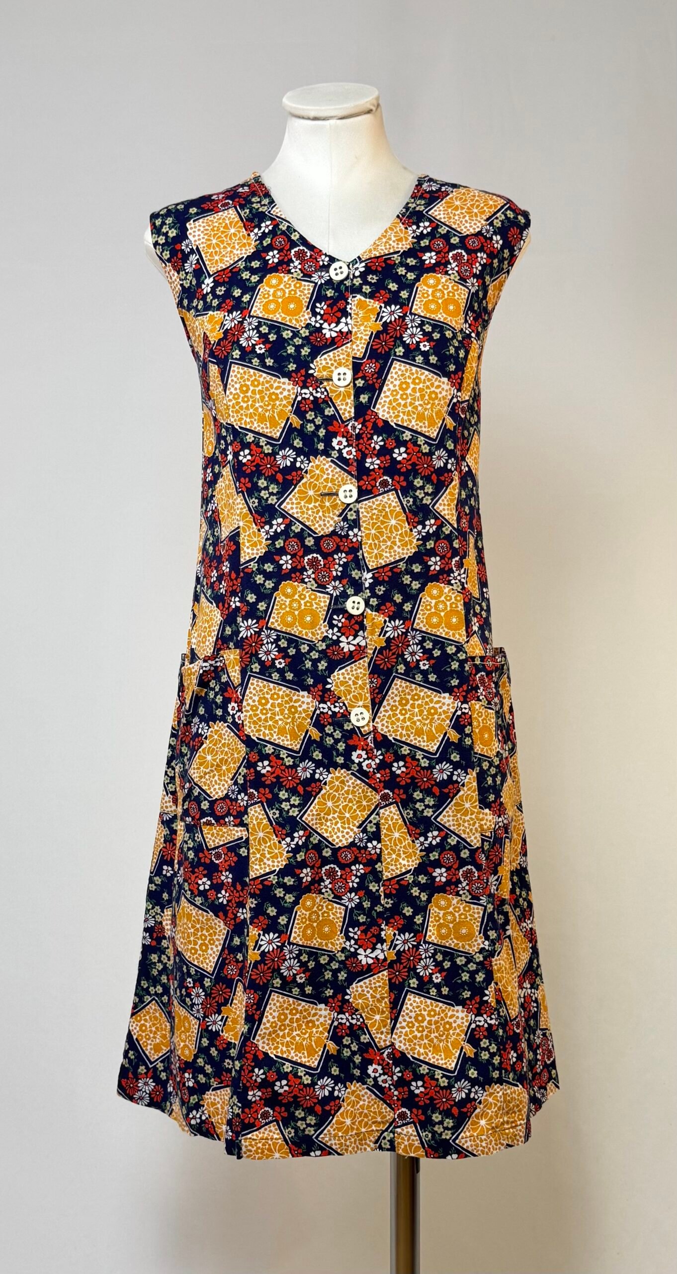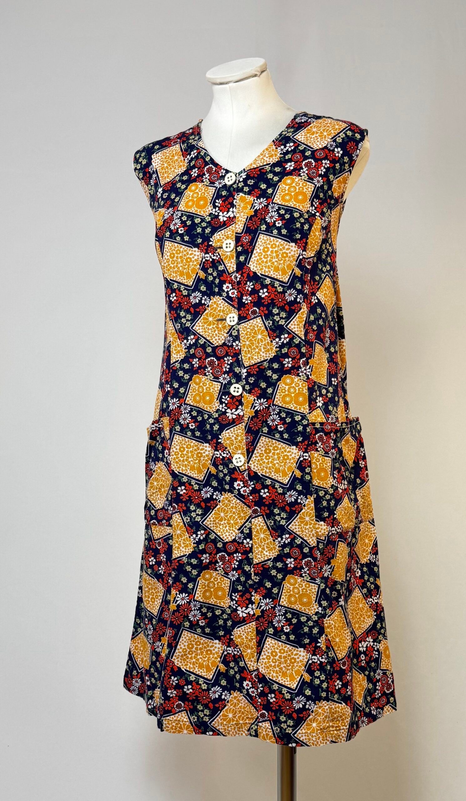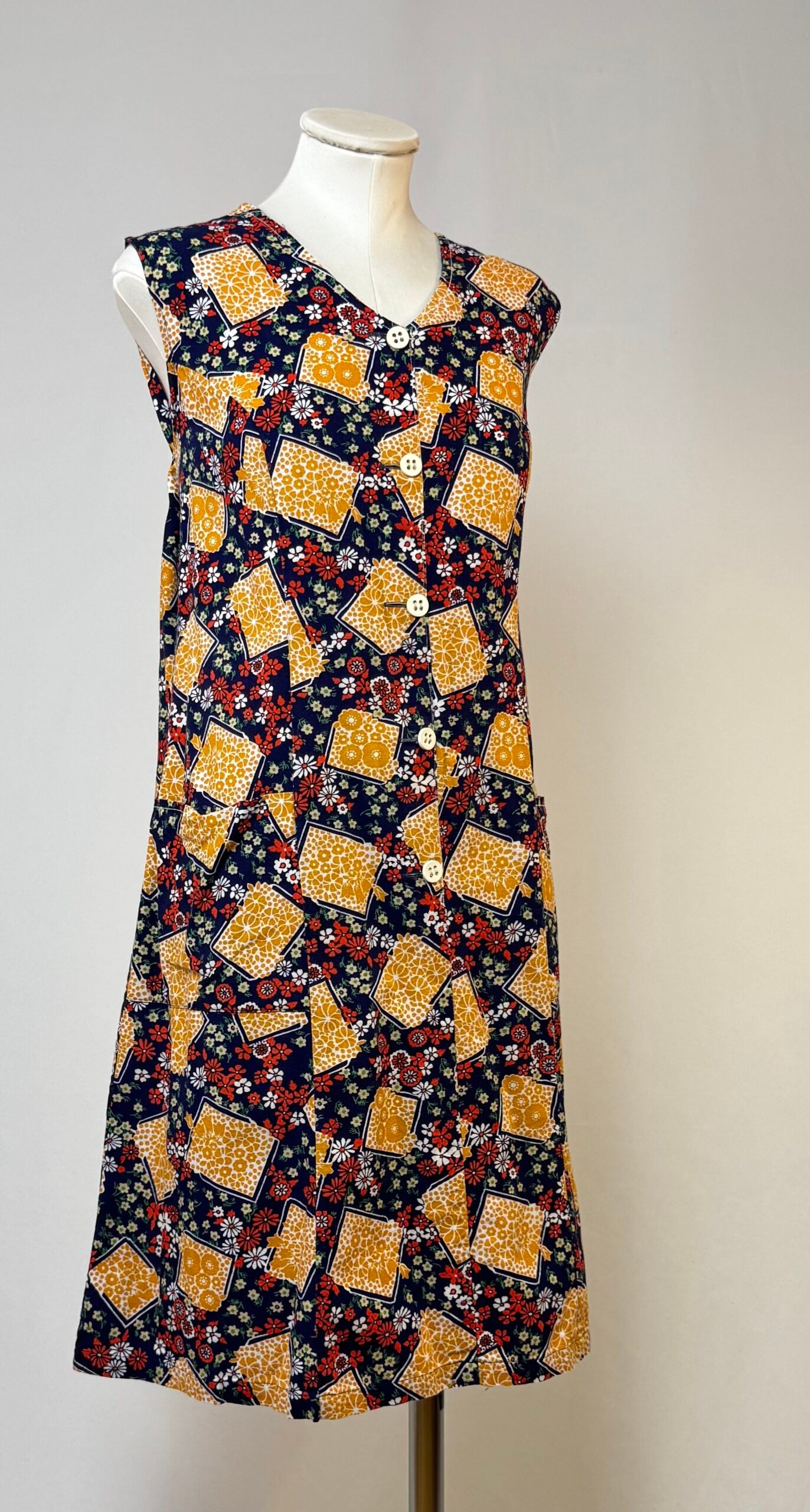 Vestido de manga la sisa, fondo azul marino y estampado de flores blancas y rojas, y naranjas en recuadros. Botones decorativos originales blancos solo en el delantero. Bolsillo de plastrón.