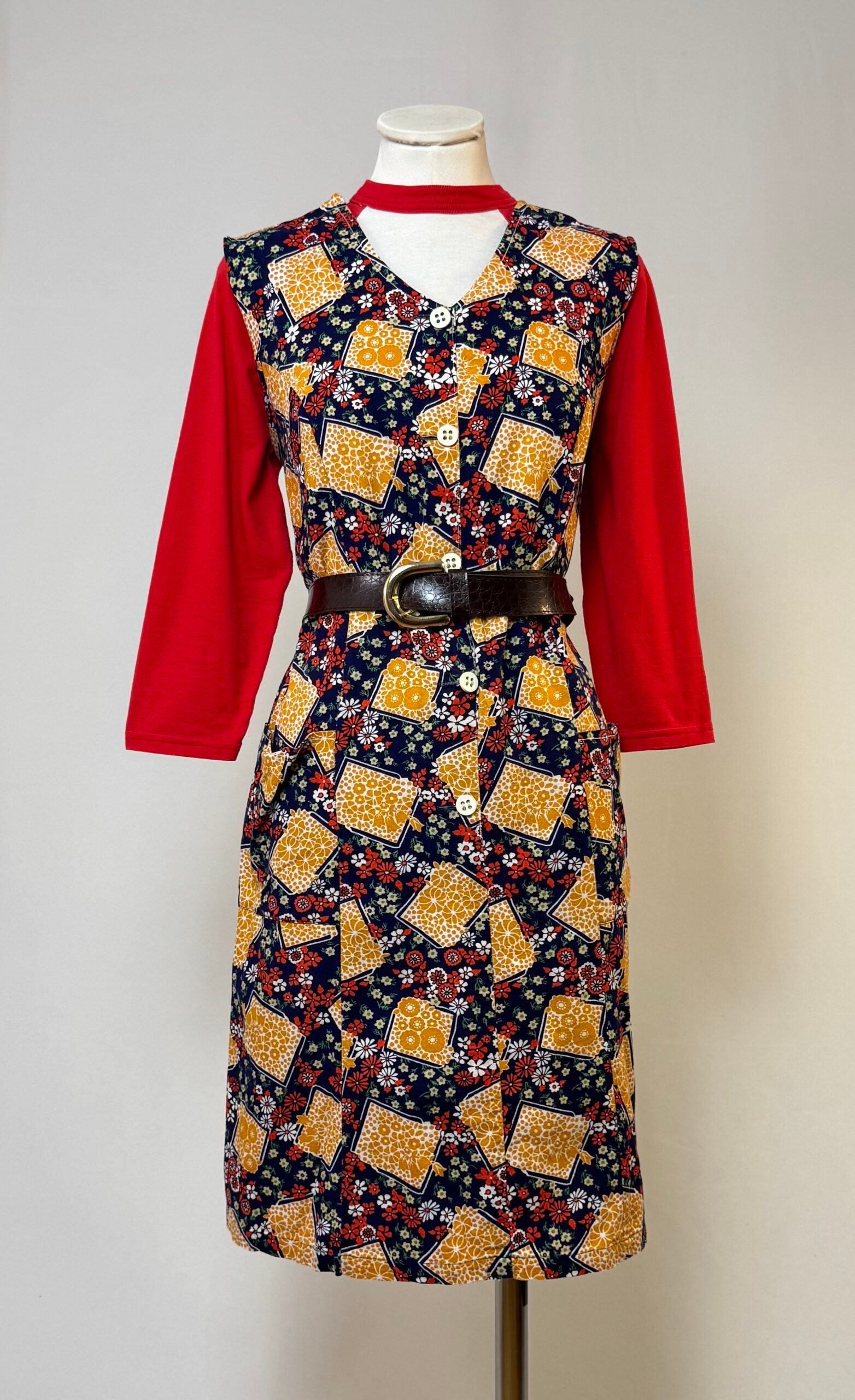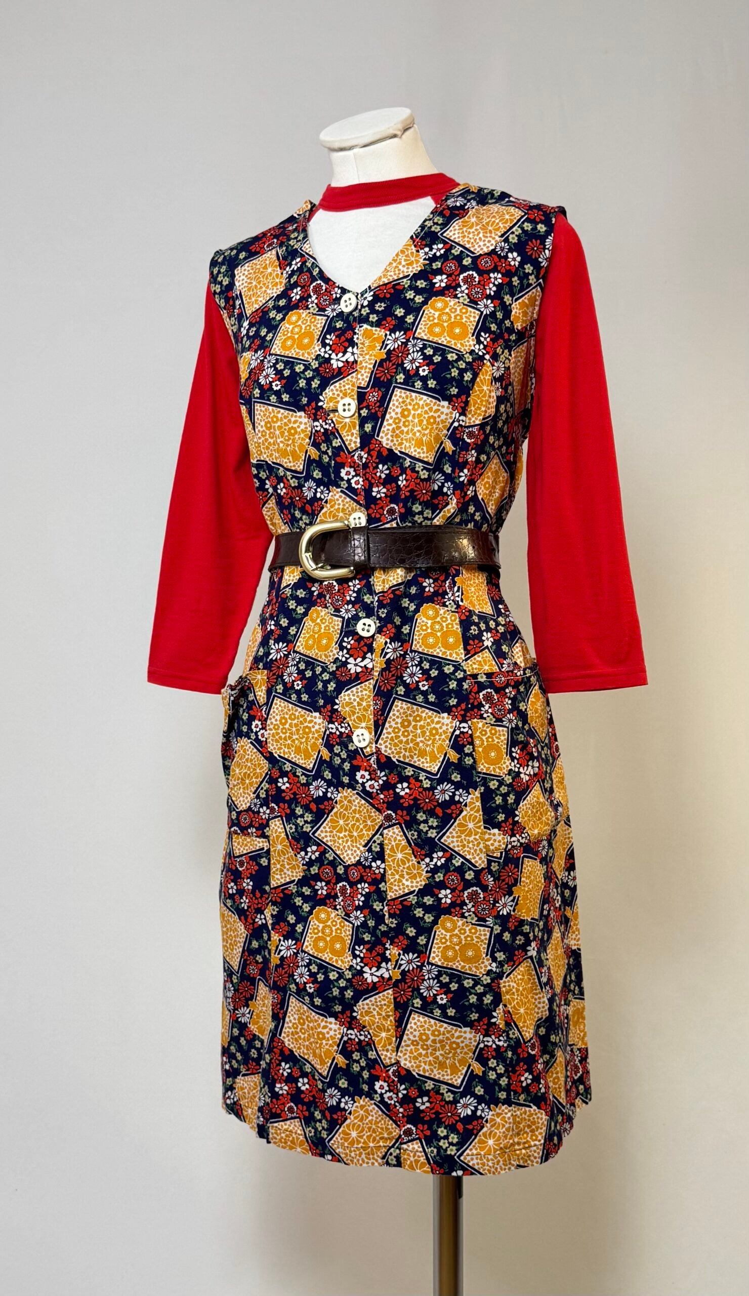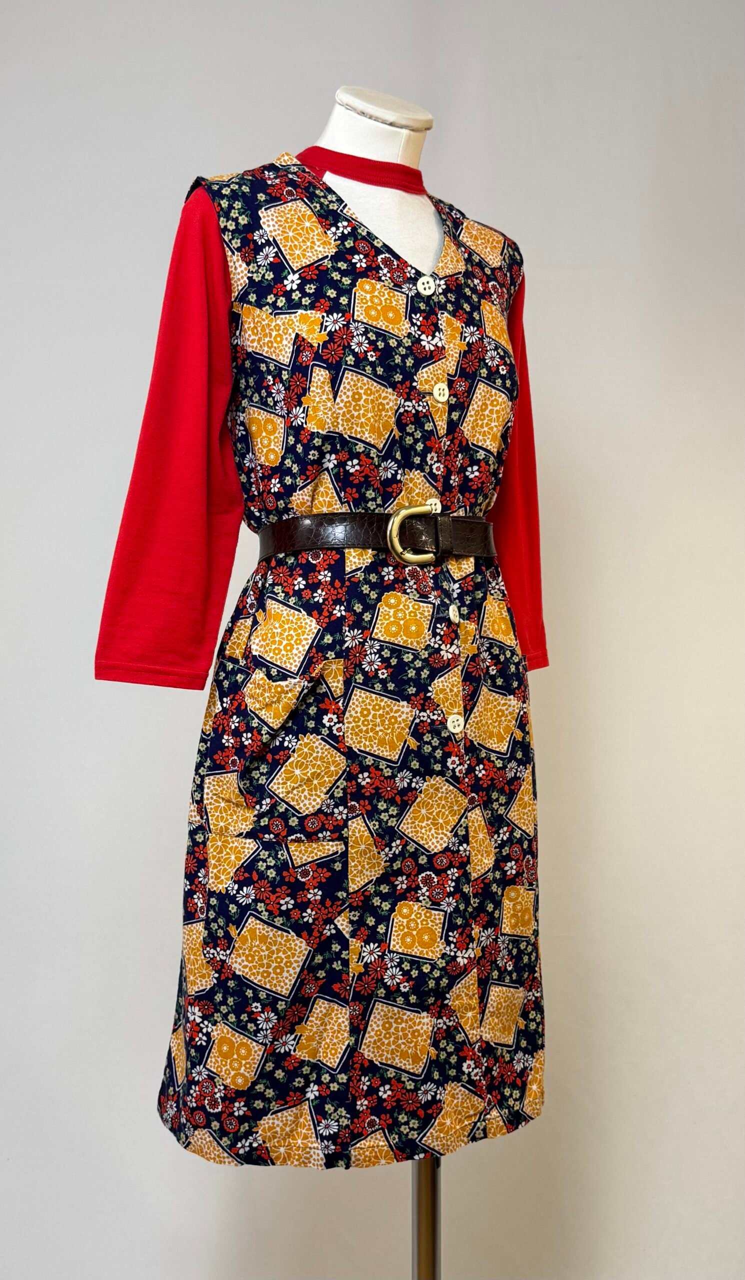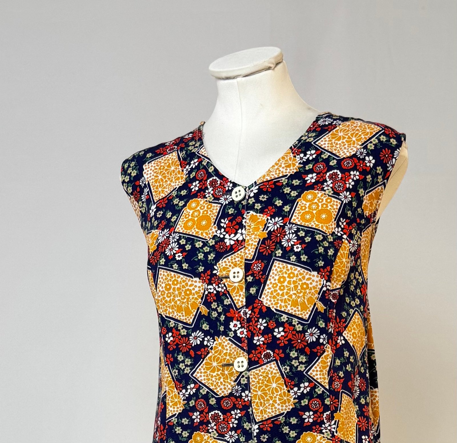 Vestido de manga la sisa, fondo azul marino y estampado de flores blancas y rojas, y naranjas en recuadros. Botones decorativos originales blancos solo en el delantero. Bolsillo de plastrón.