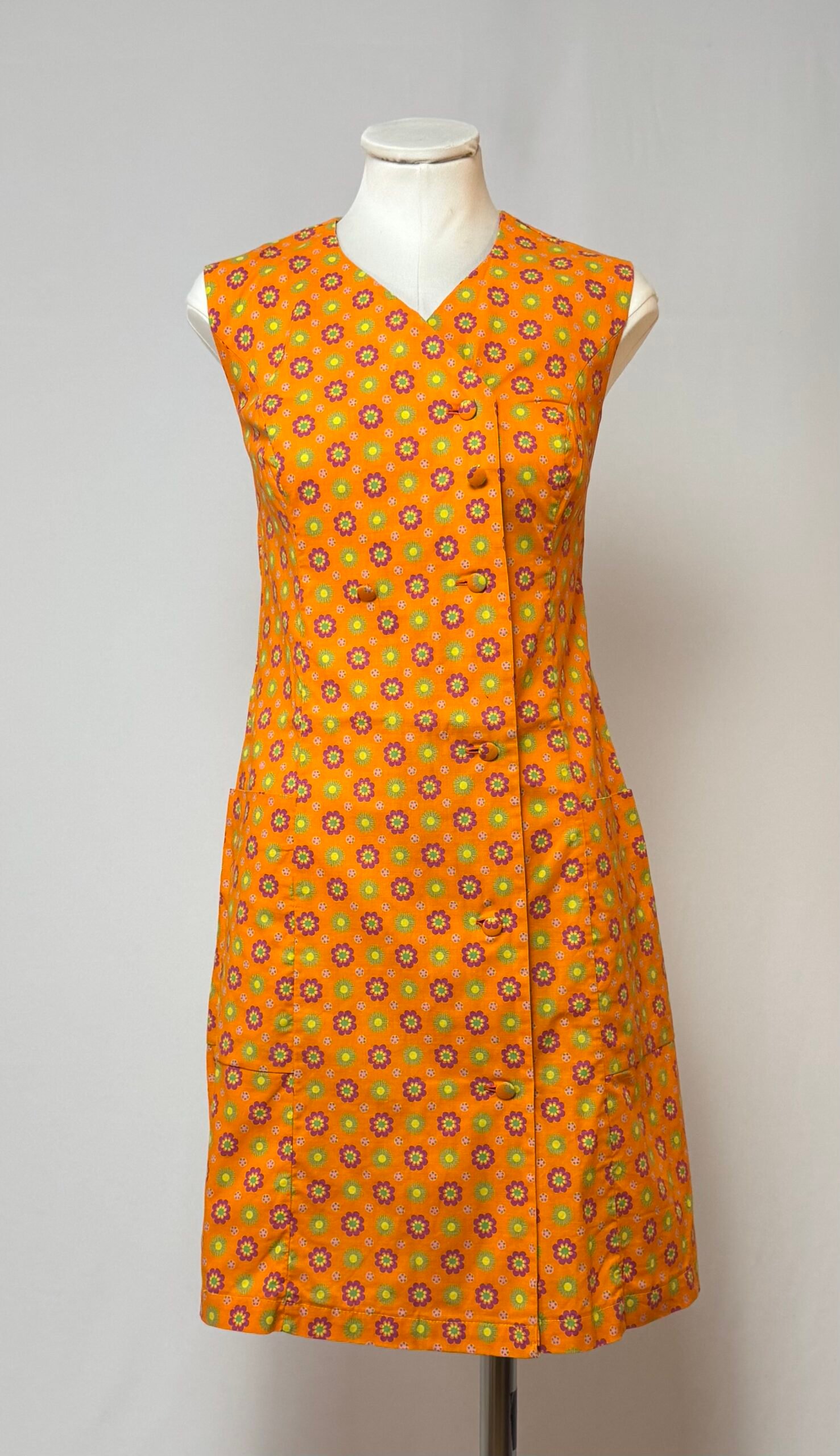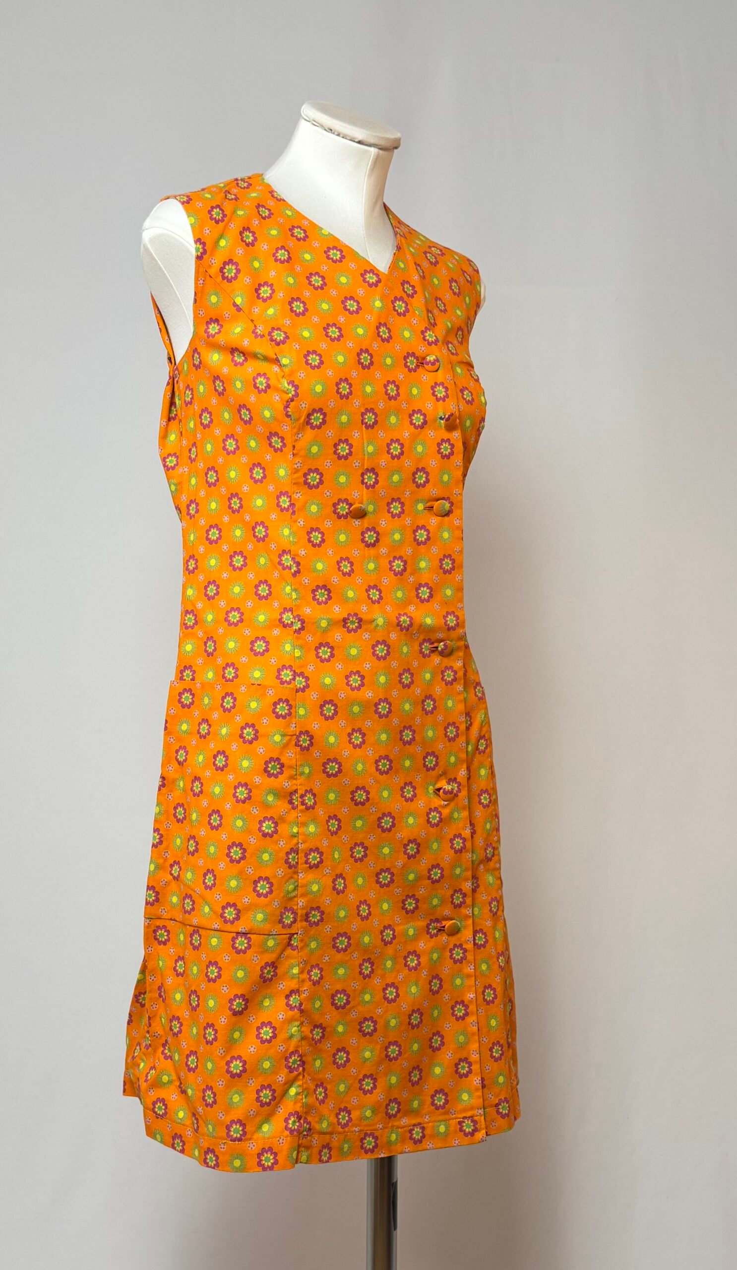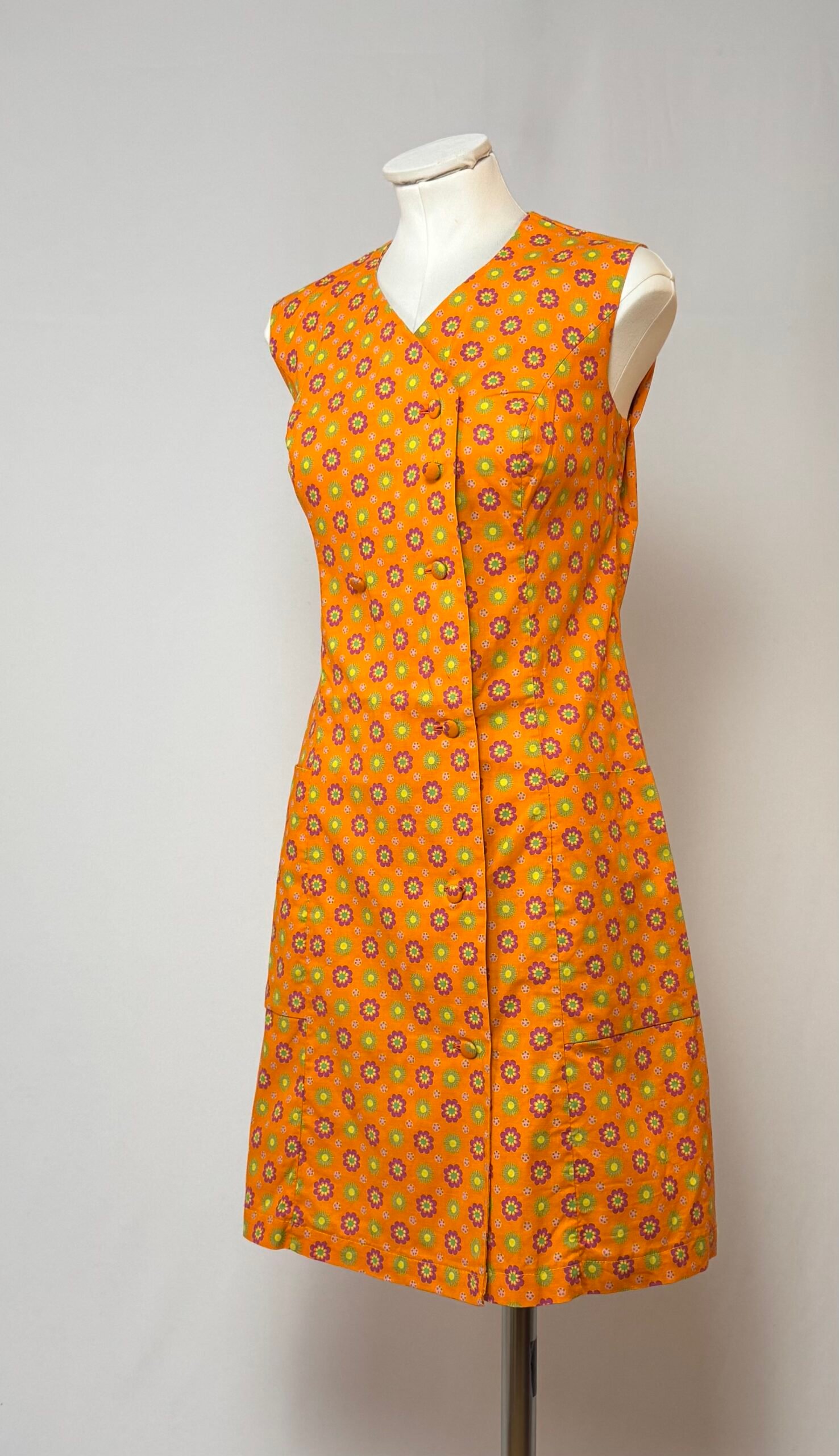 Vestido delantal de manga la sisa naranja, abotonado cruzado con botones forrados de la misma tela, con estampado de florecillas y bolsillos de plastón.