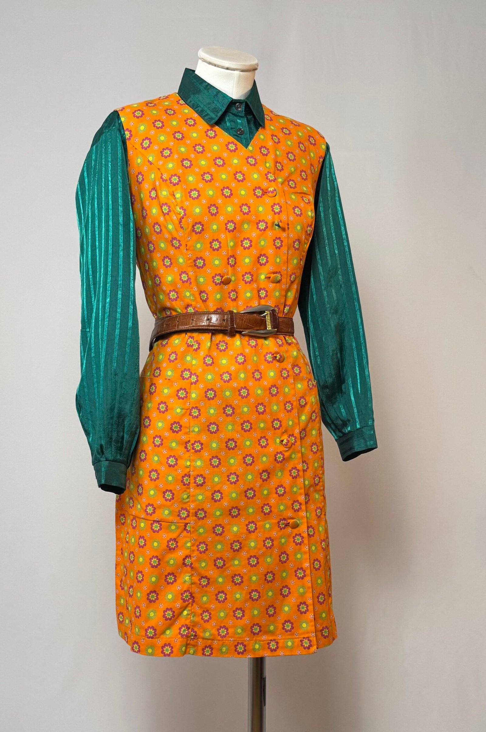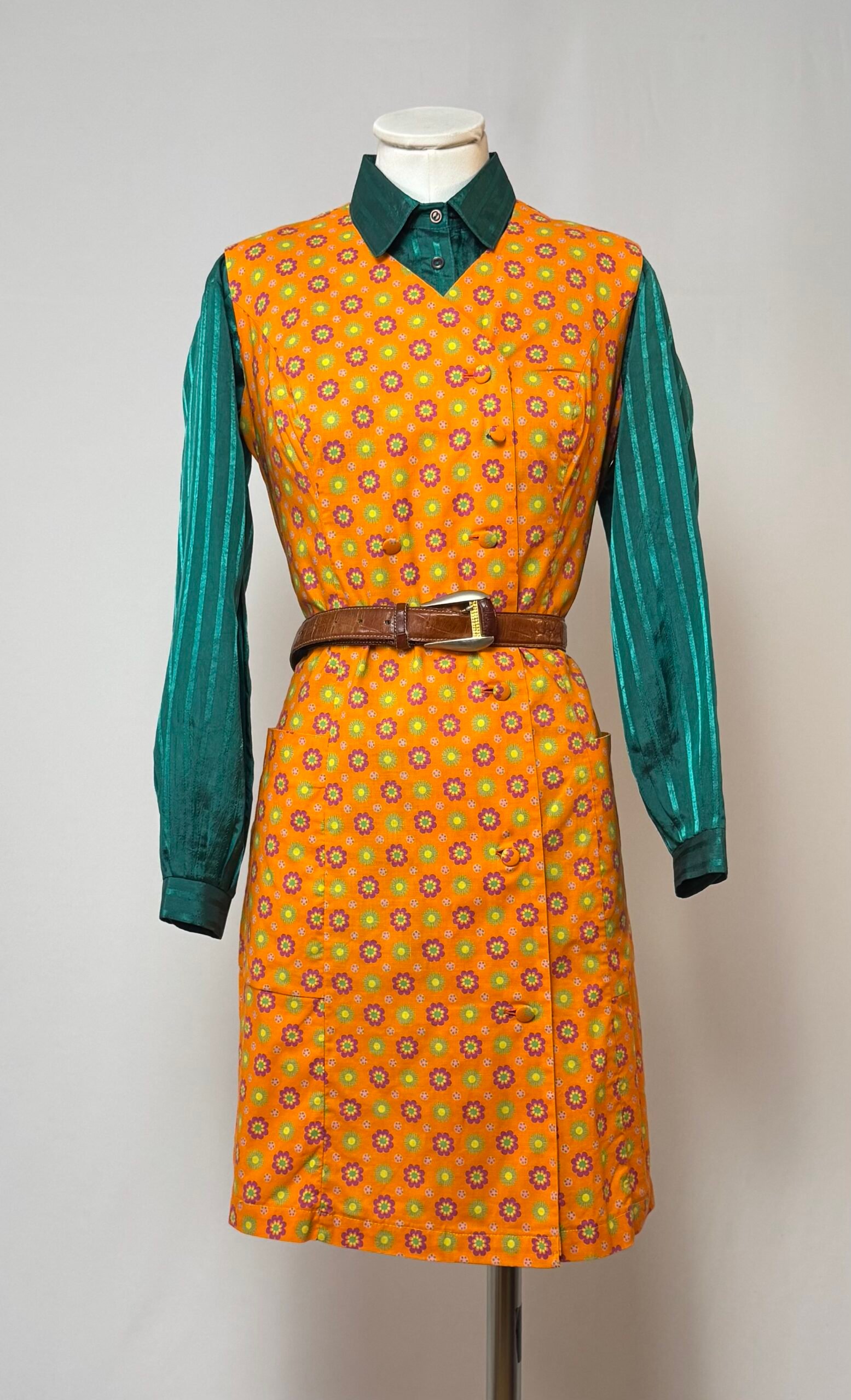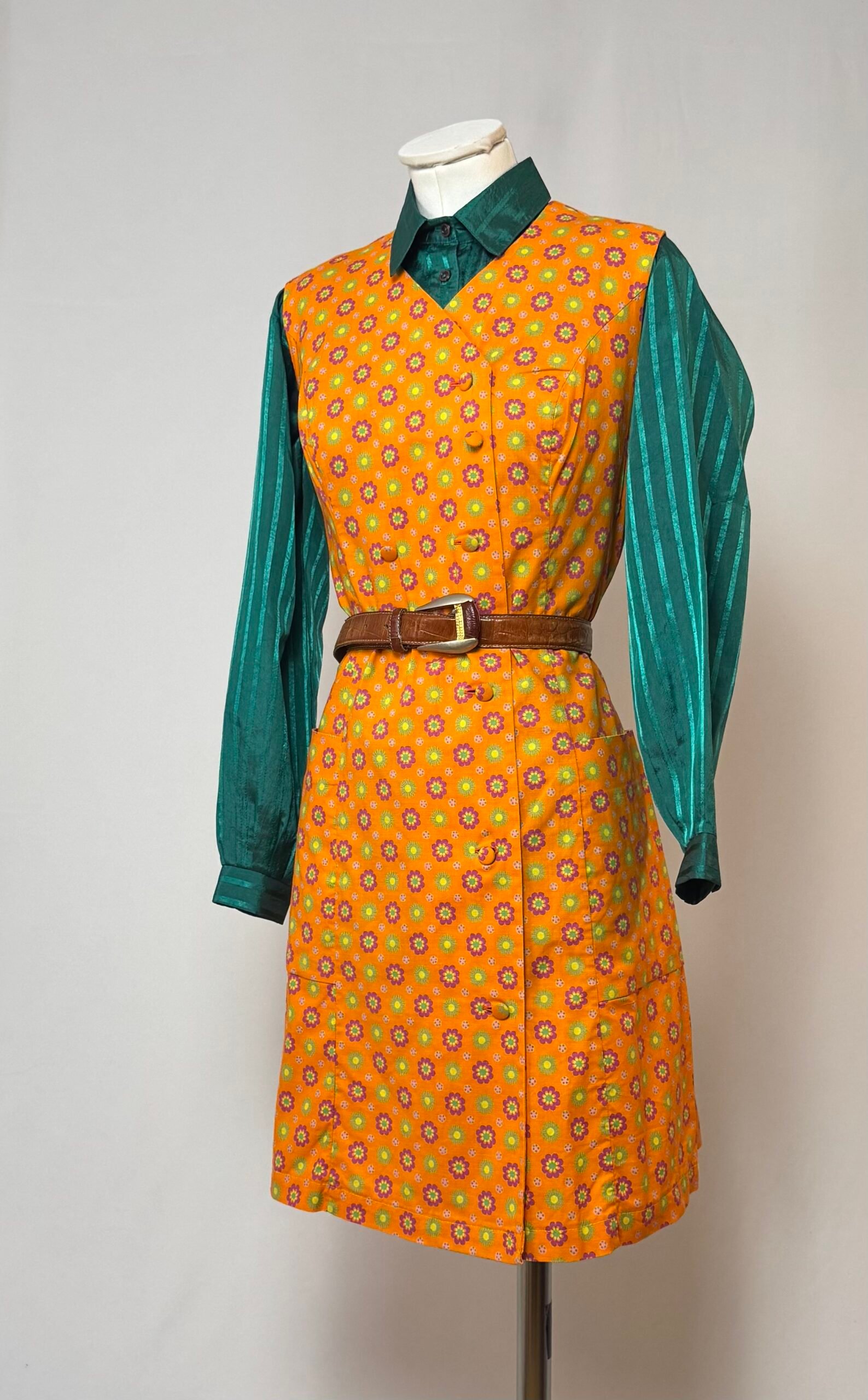 Vestido delantal de manga la sisa naranja, abotonado cruzado con botones forrados de la misma tela, con estampado de florecillas y bolsillos de plastón.