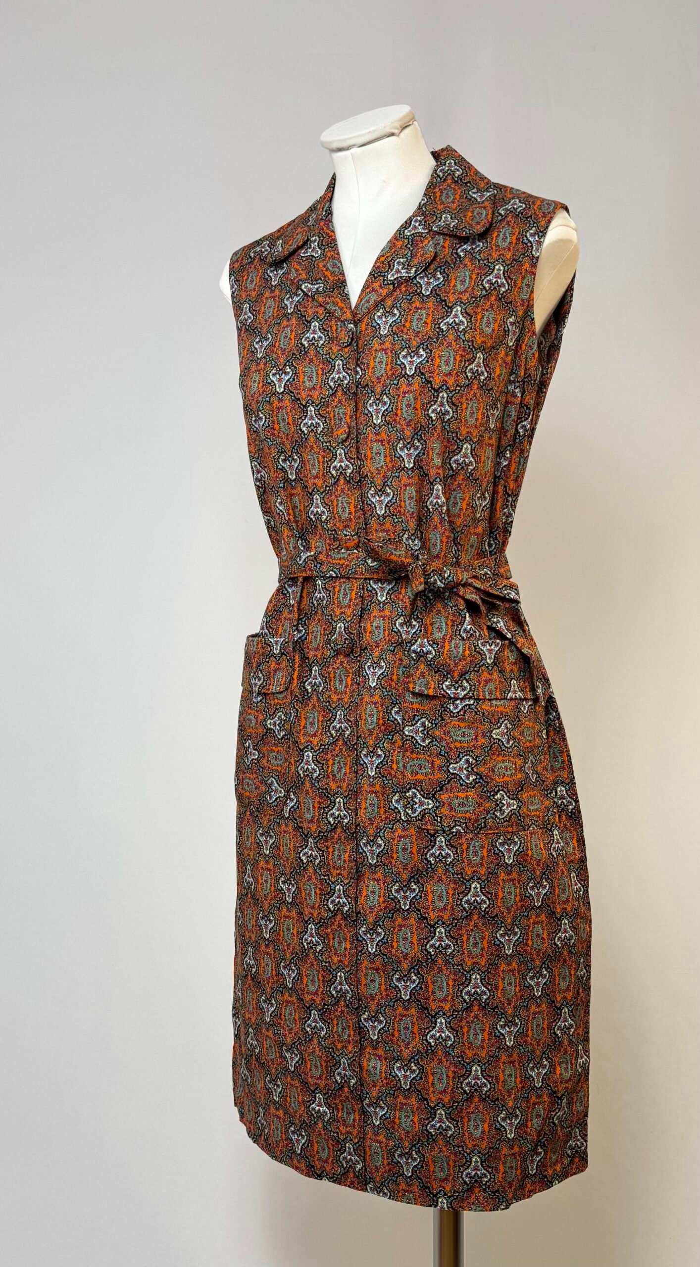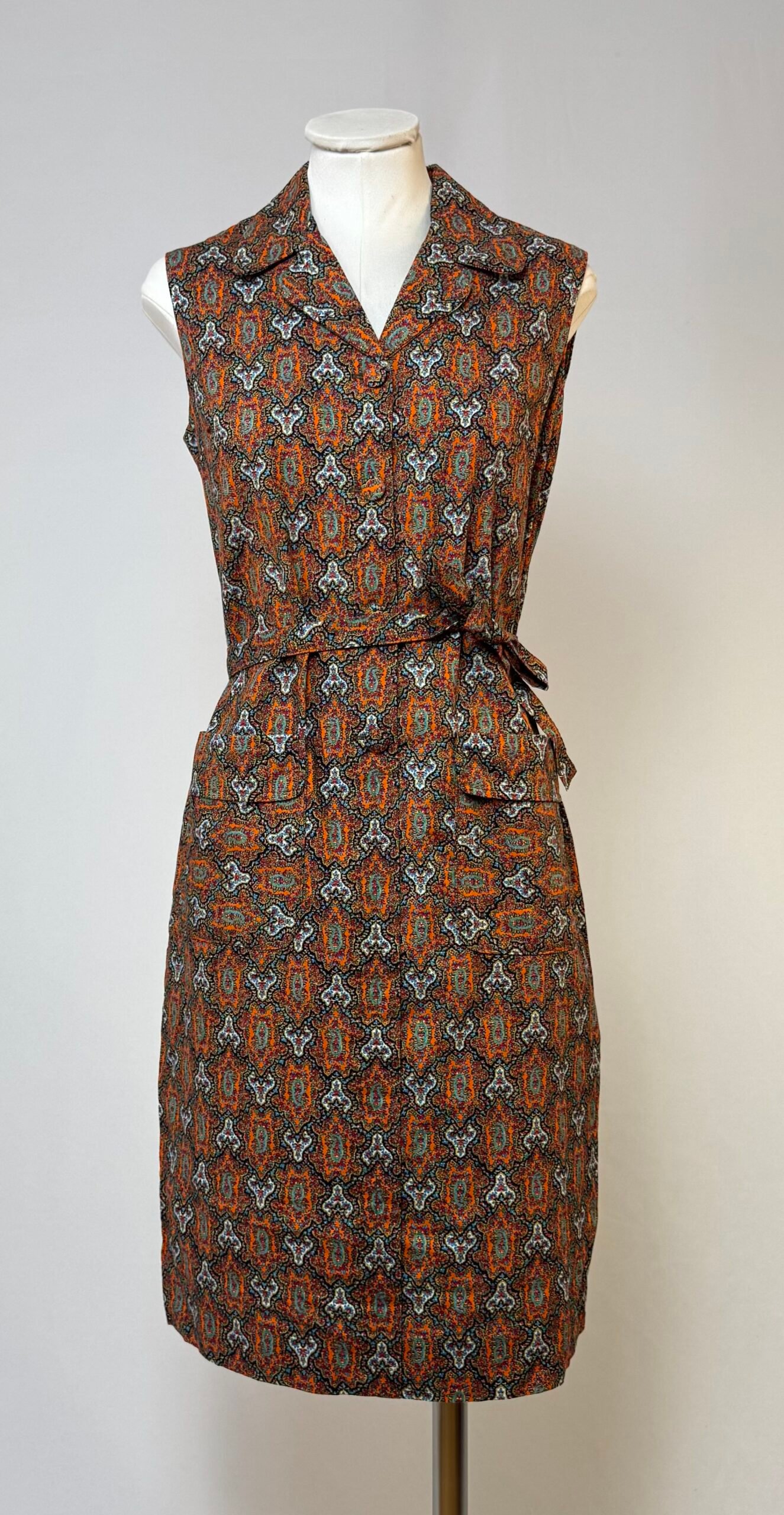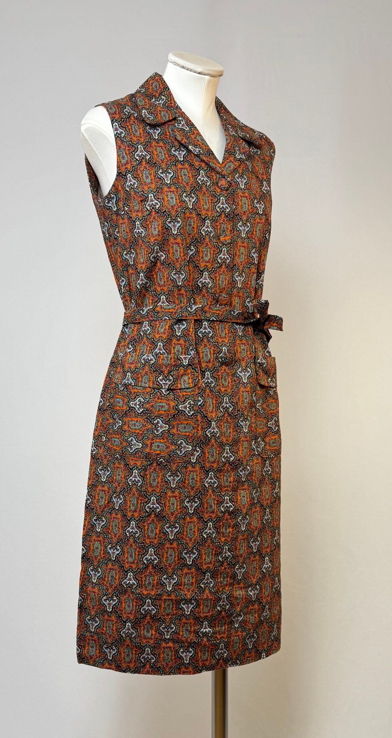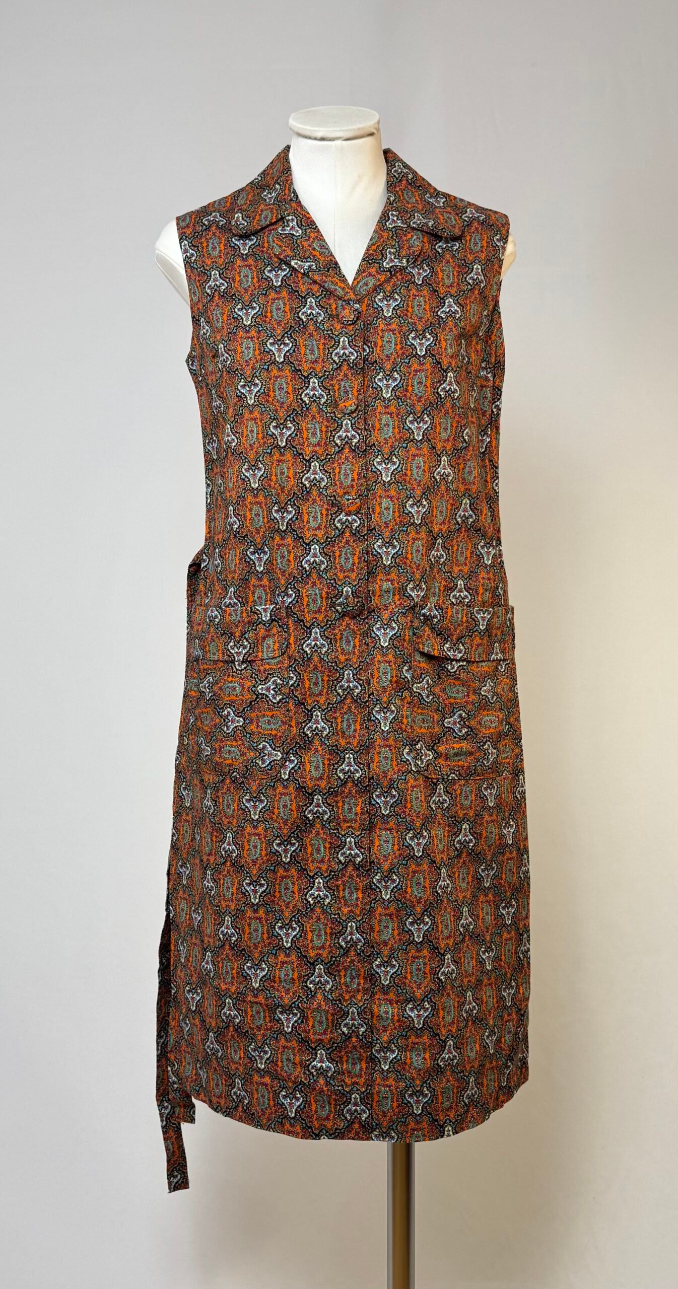 Vestido delantal de manga la sisa, cuello solapa, estampado tipo cachemira en tonos rojos. Abotonado solo en el delantero con botones forrados, bolsillos de plastrón y cinturón del mismo tejido.
