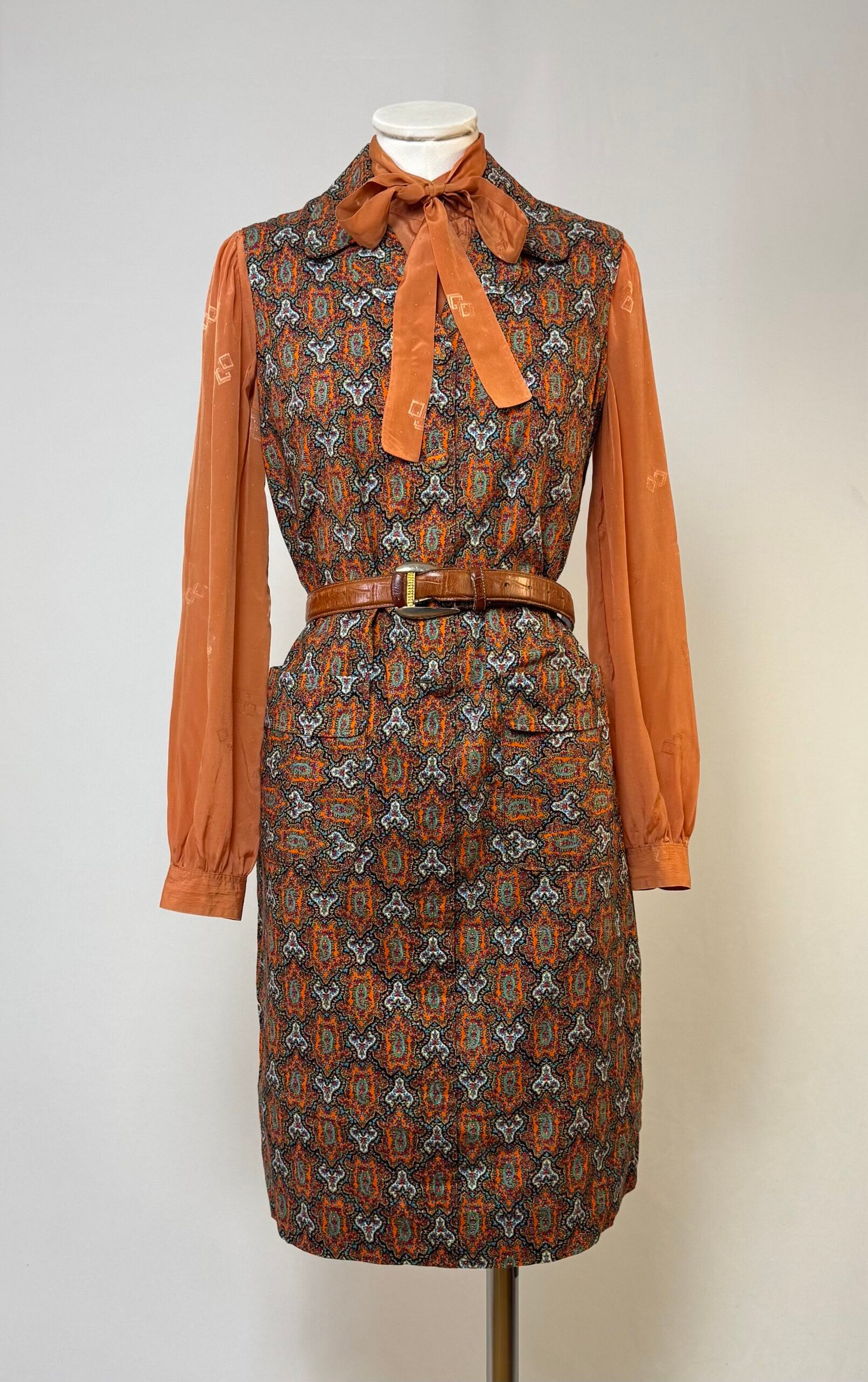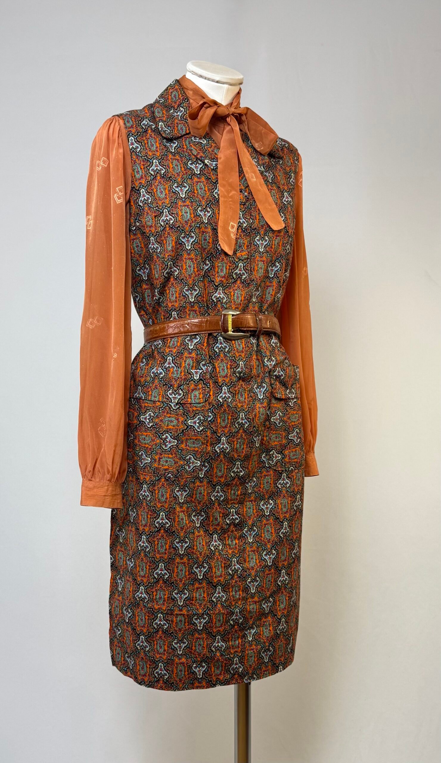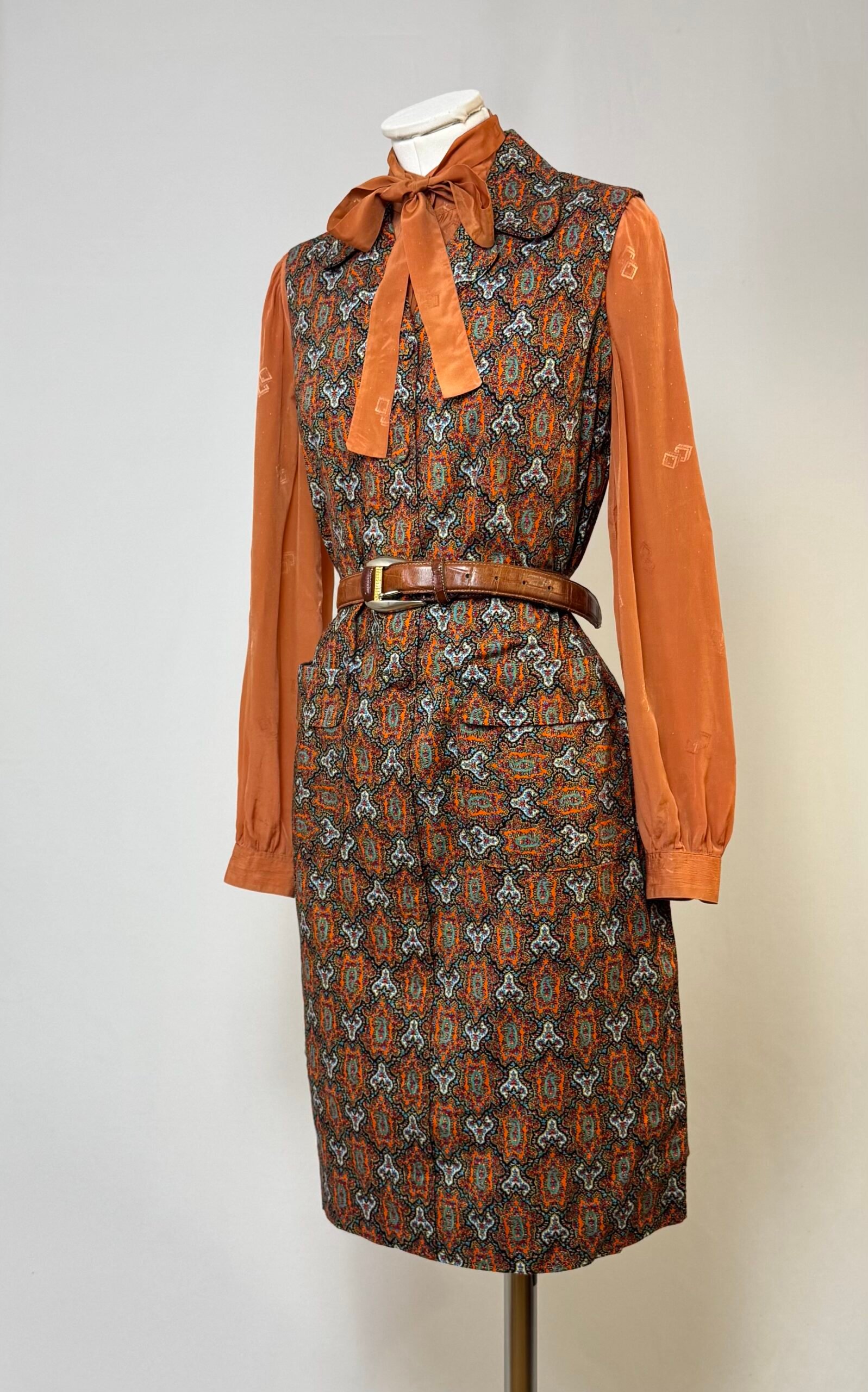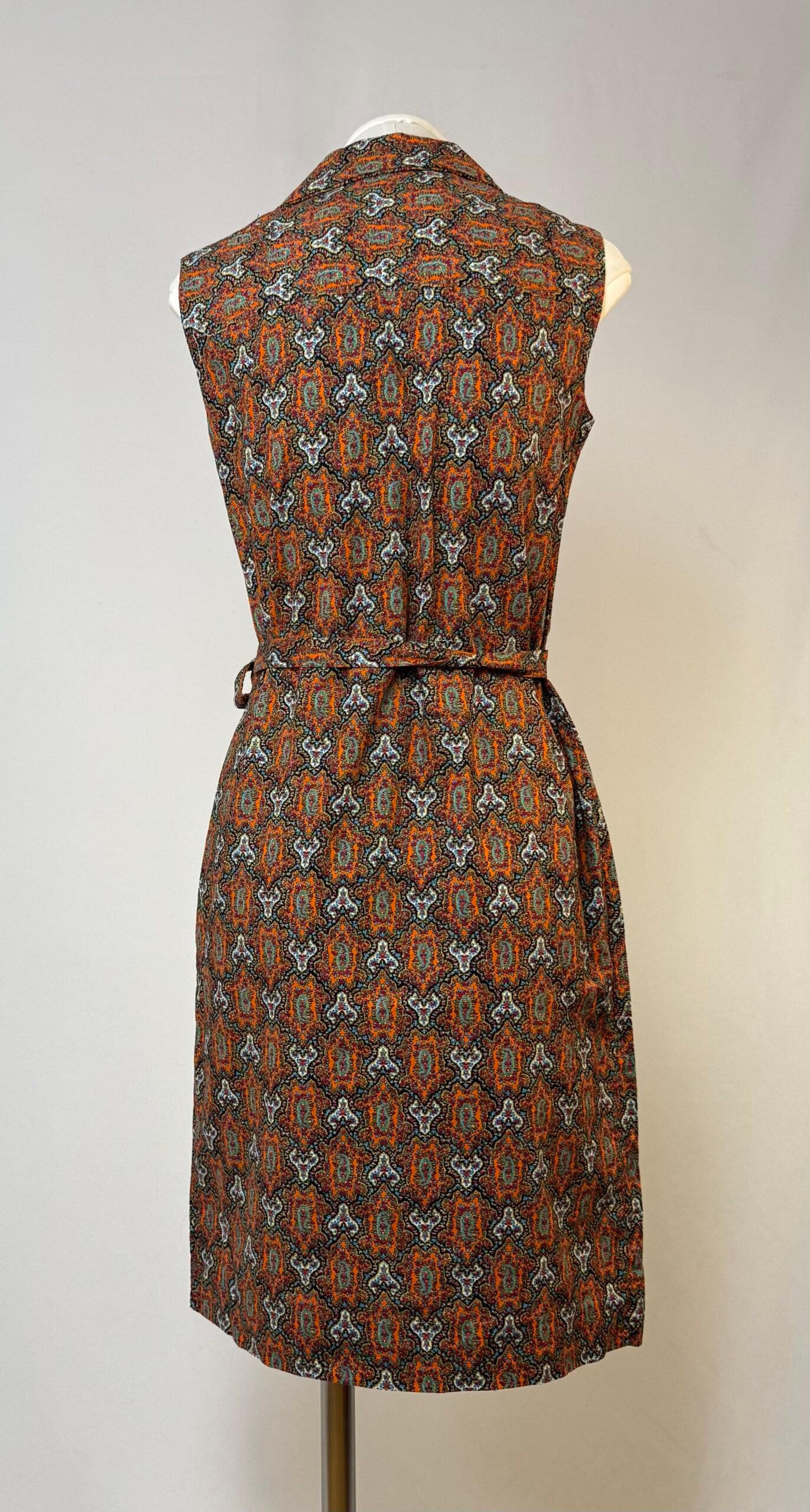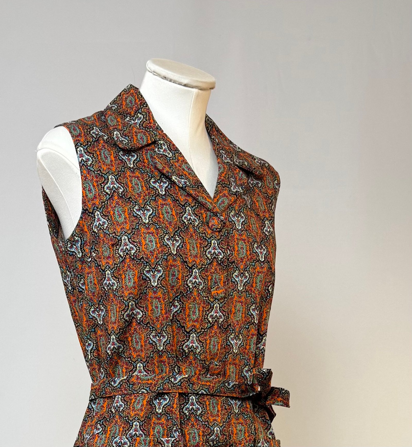 Vestido delantal de manga la sisa, cuello solapa, estampado tipo cachemira en tonos rojos. Abotonado solo en el delantero con botones forrados, bolsillos de plastrón y cinturón del mismo tejido.